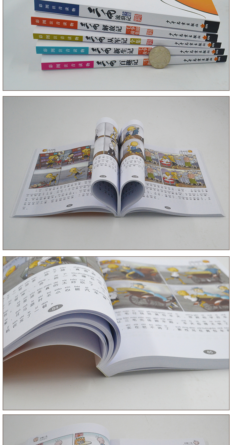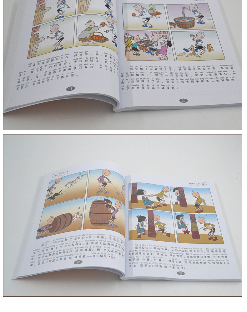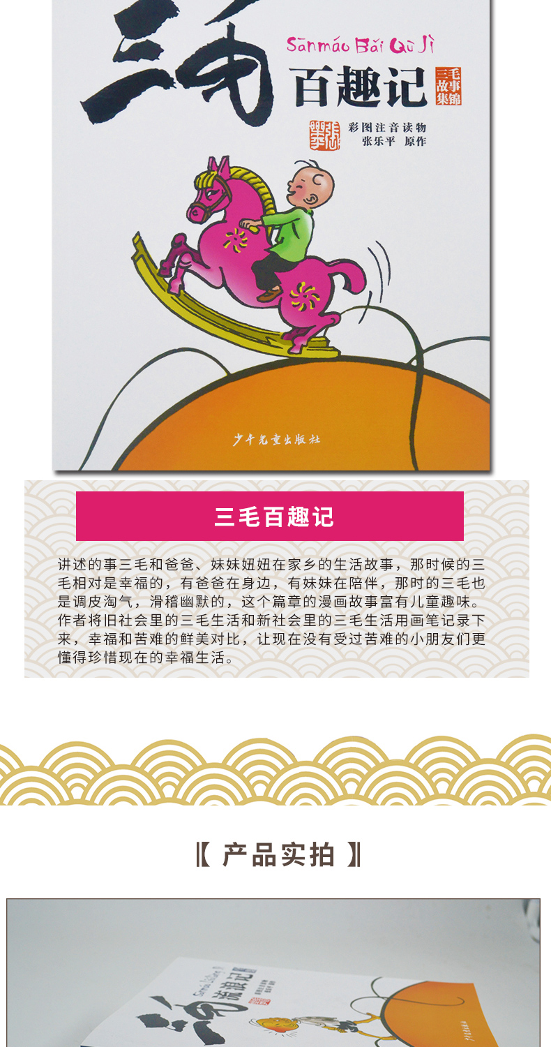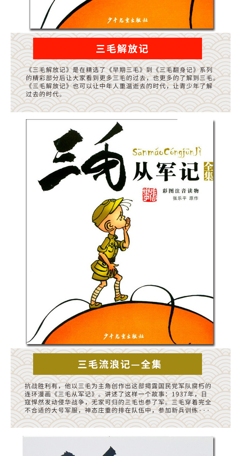 三毛漫画(典藏版)采用套装的形式,一套共五本书,分别为《三毛流浪记》、《三毛从军记》、《三毛解放记》、《三毛新生记》和《三毛百趣记》,所选内容都是三毛漫画中的经典。本书为彩图注音版,原汁原味,是三毛漫画的“礼品装”,也是三毛漫画的爱好者及收藏者的优选。