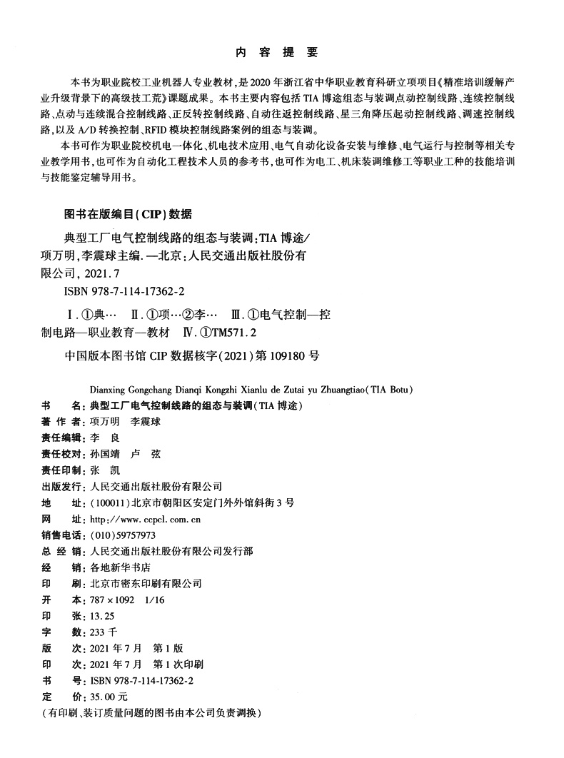 书名:典型工厂电气控制线路的组态与装调(TIA博途)