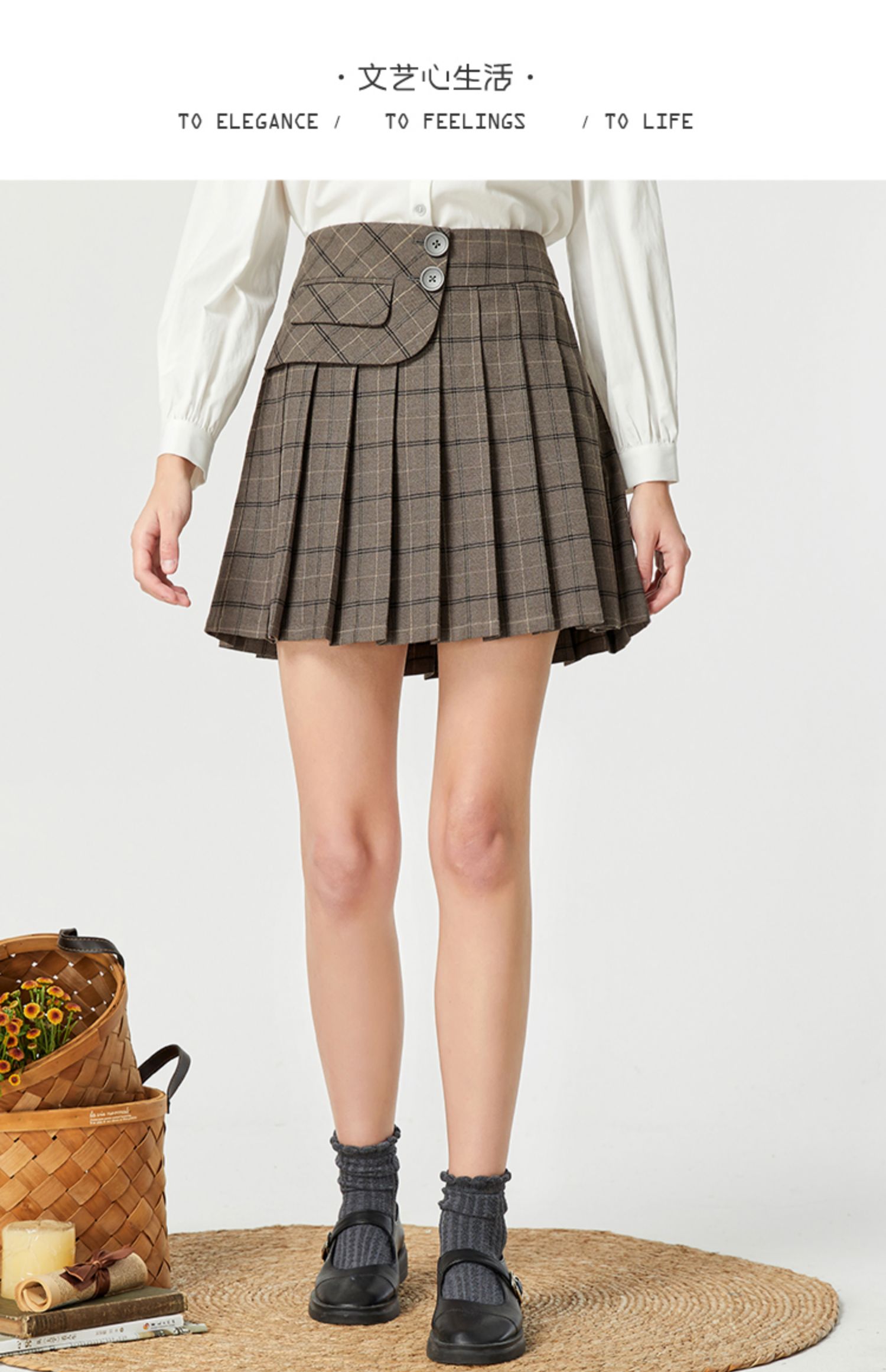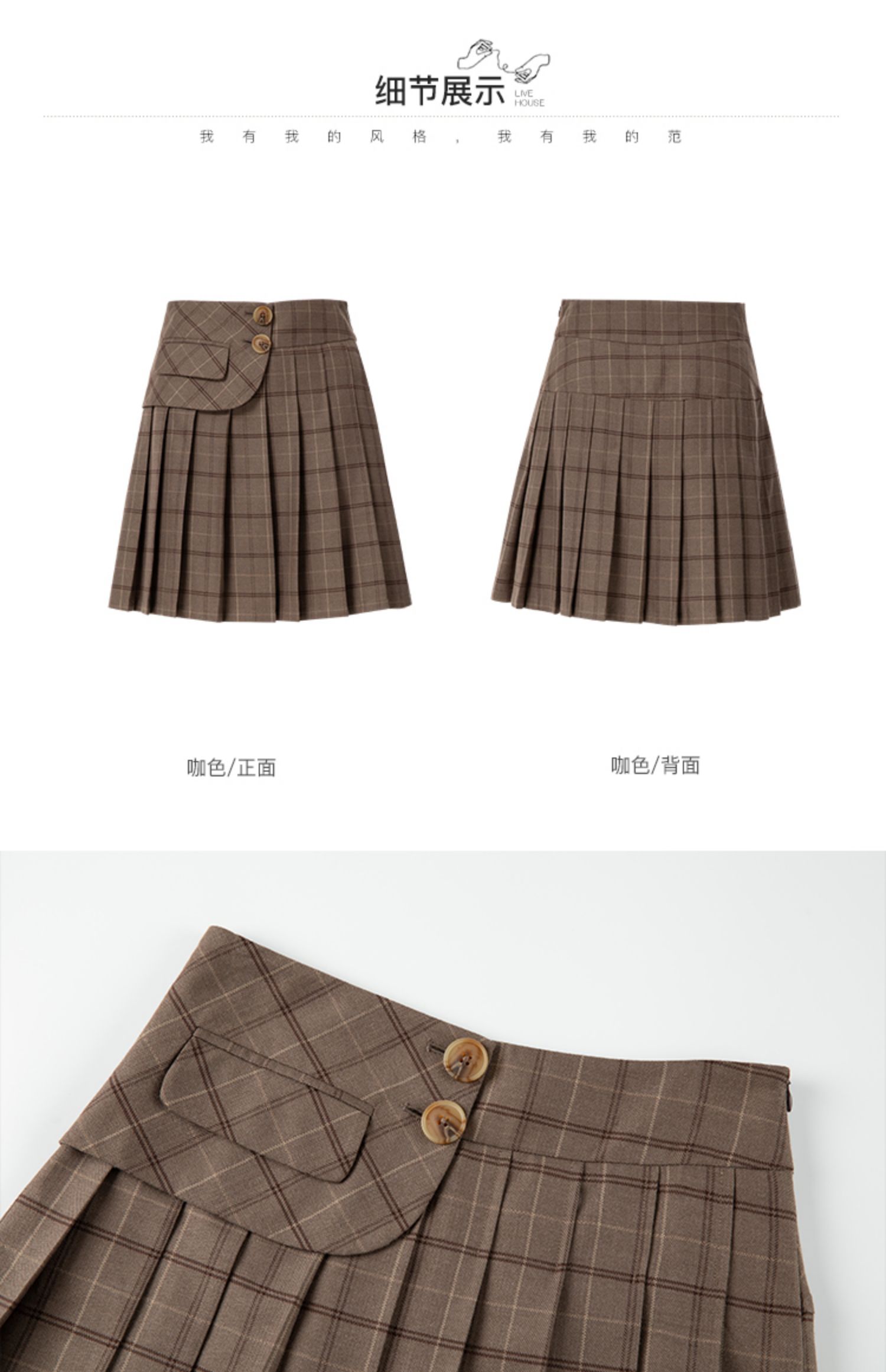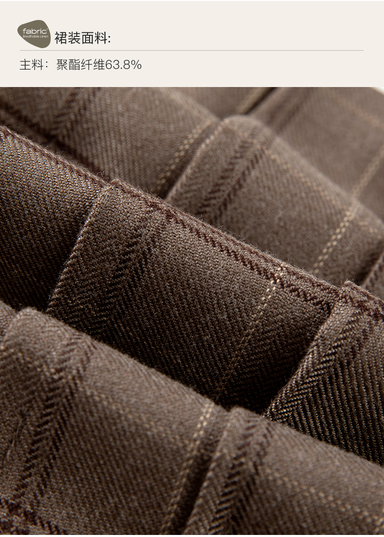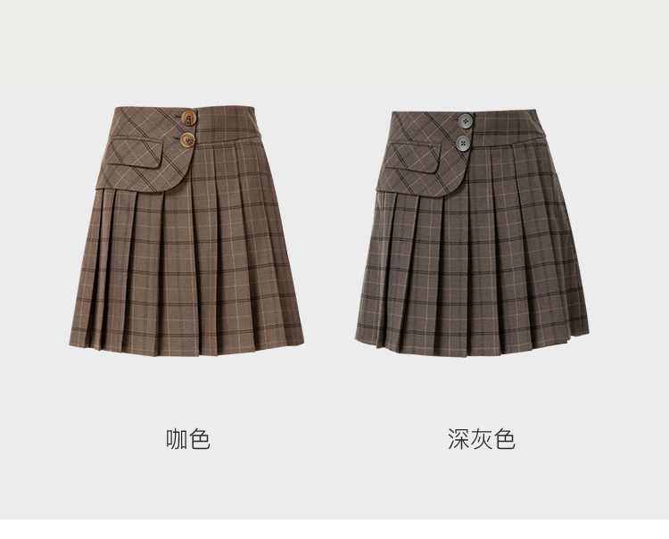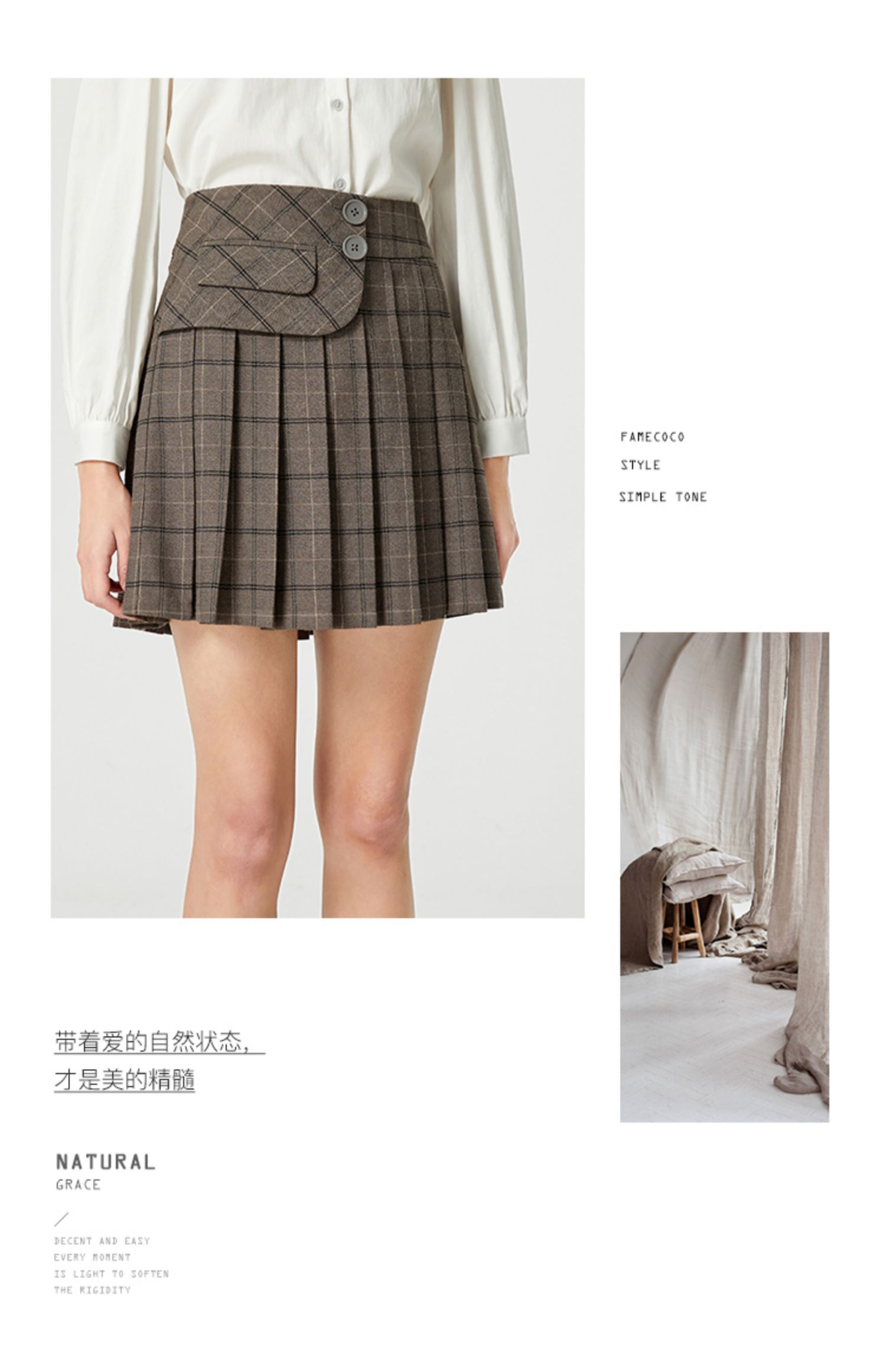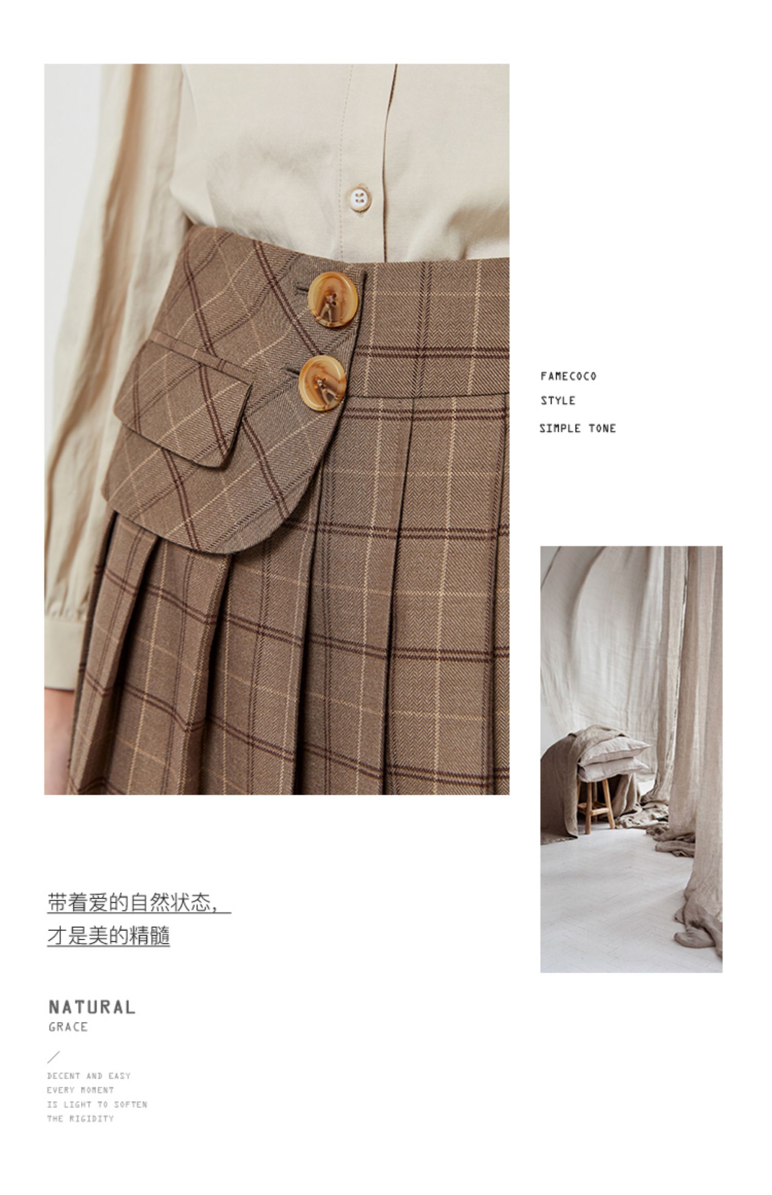 Famecoco范可儿咖色高腰jk短裙女格子a字春秋不对称百褶裙小个子F225HA017
