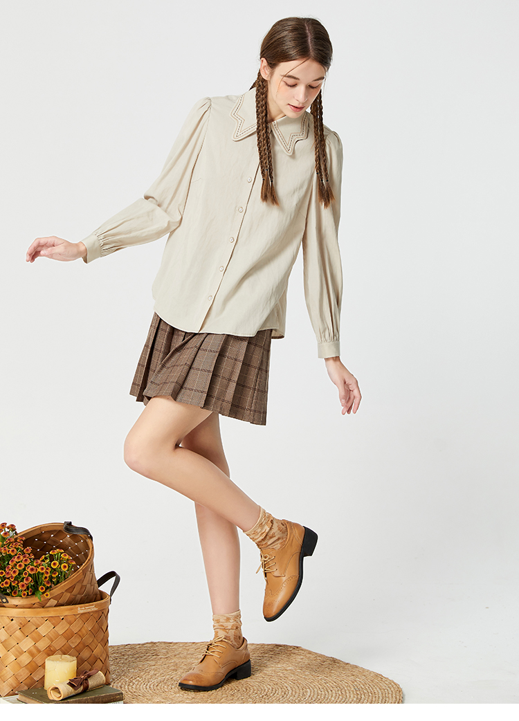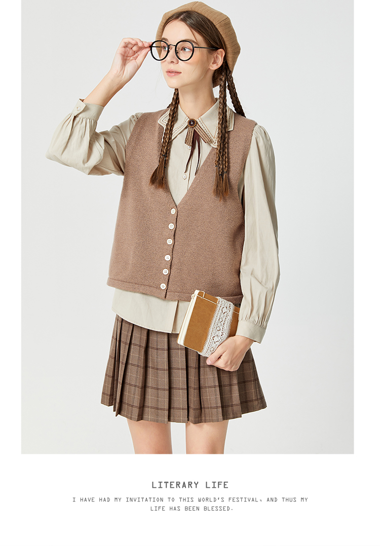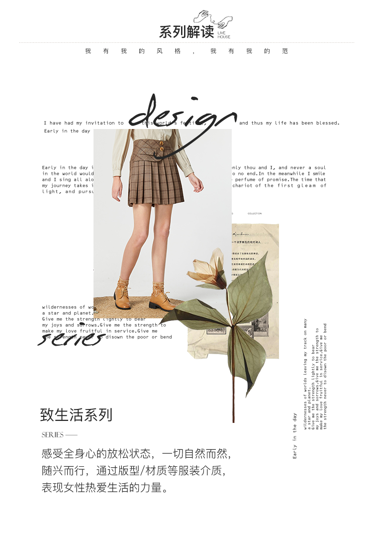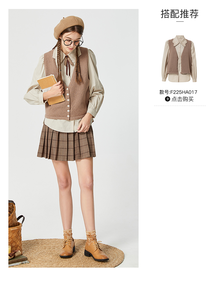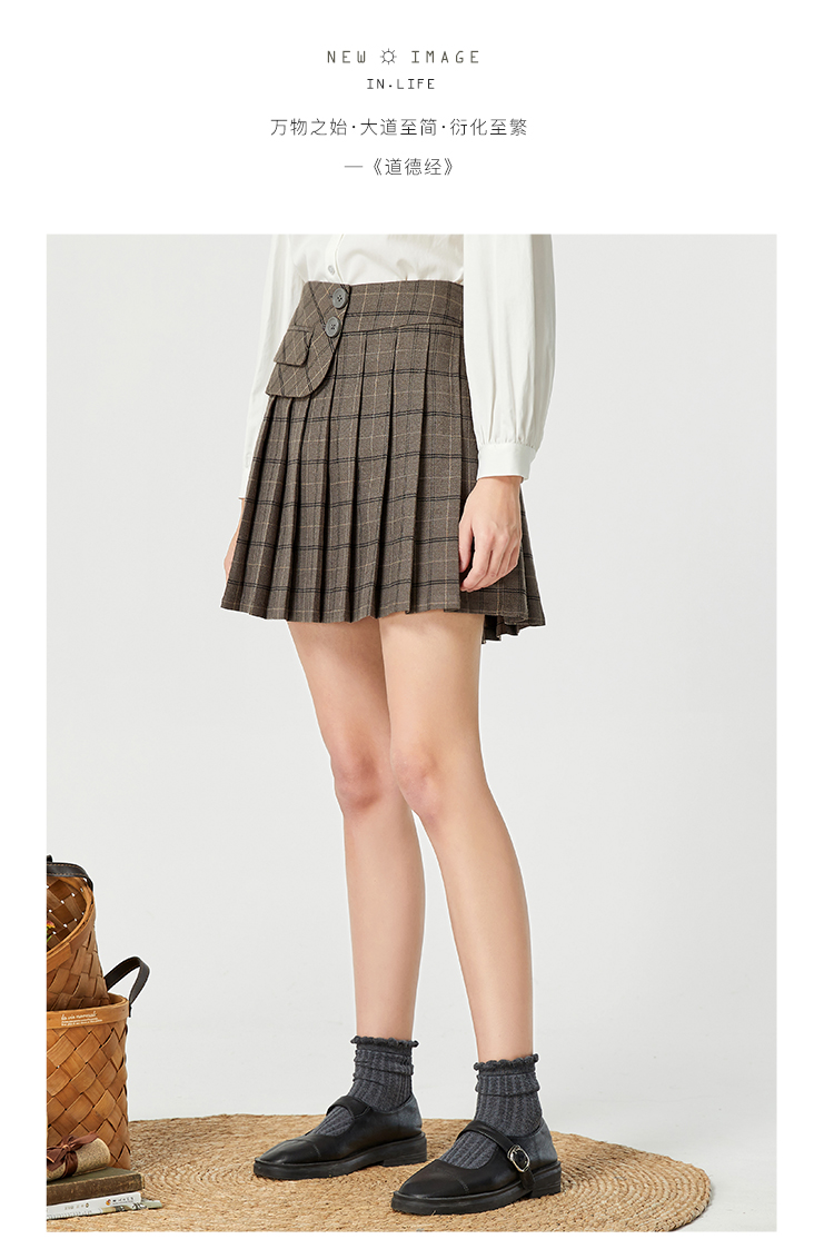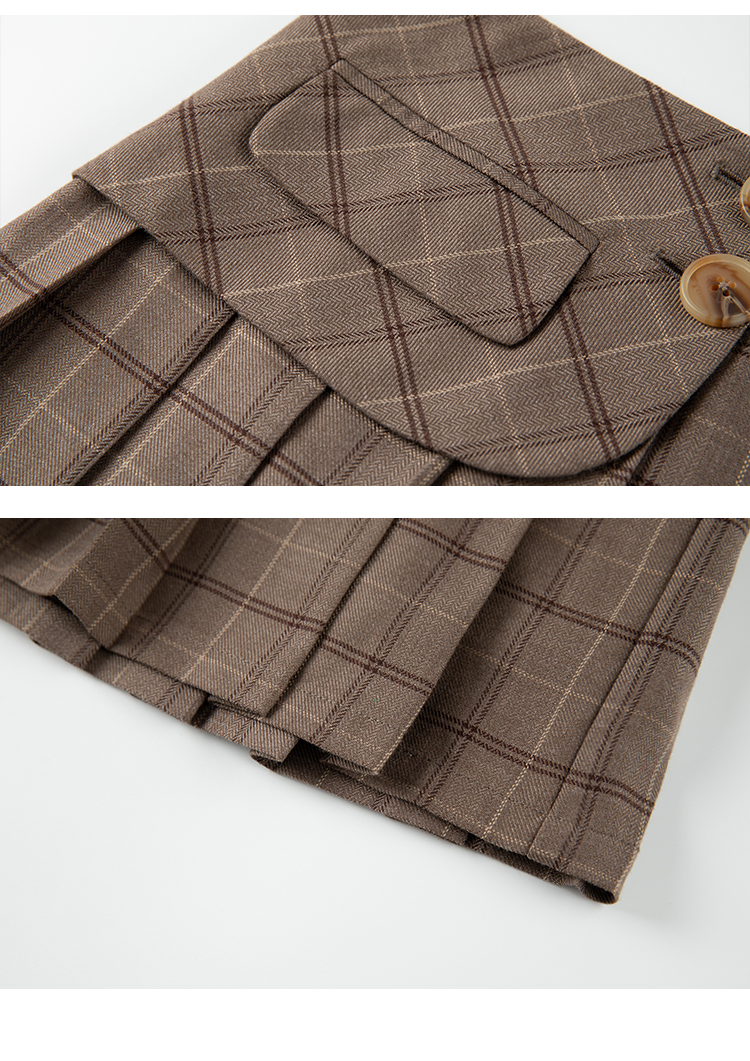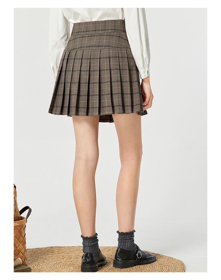 Famecoco范可儿咖色高腰jk短裙女格子a字春秋不对称百褶裙小个子F225HA017