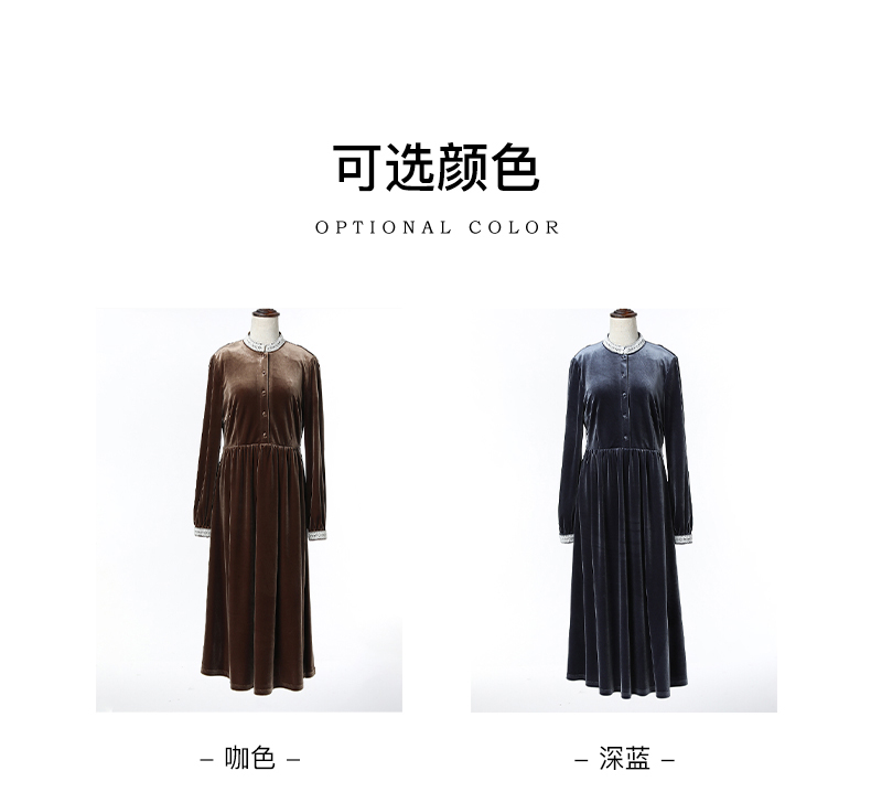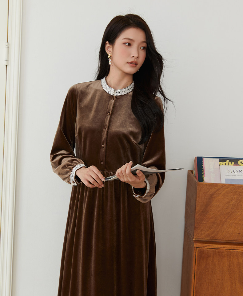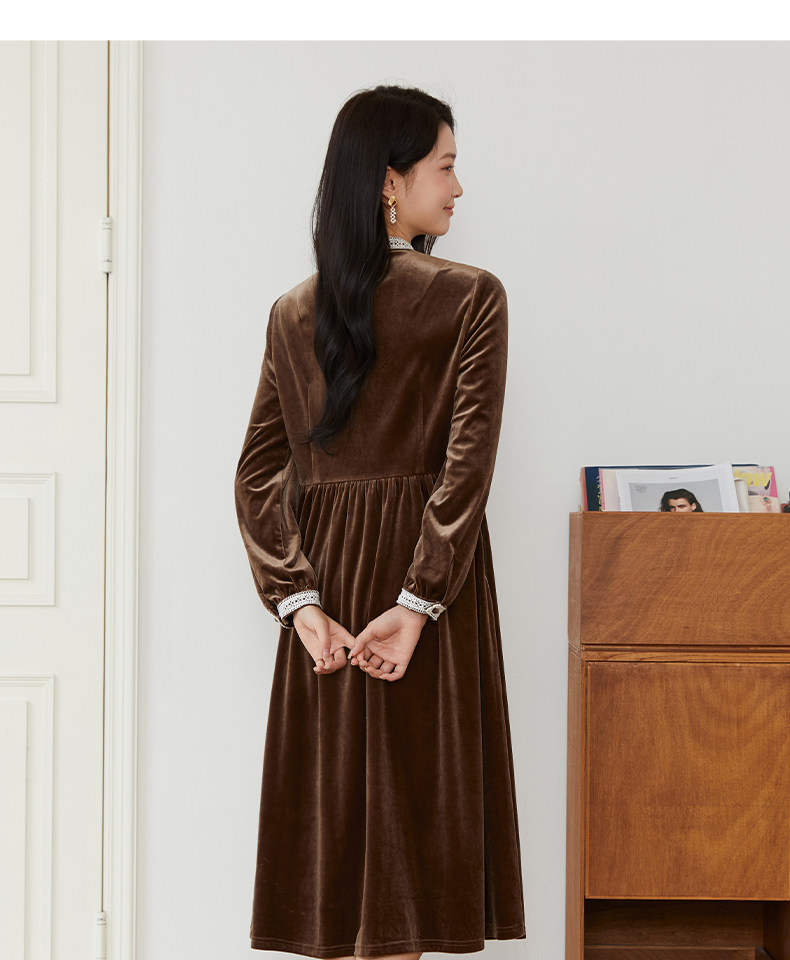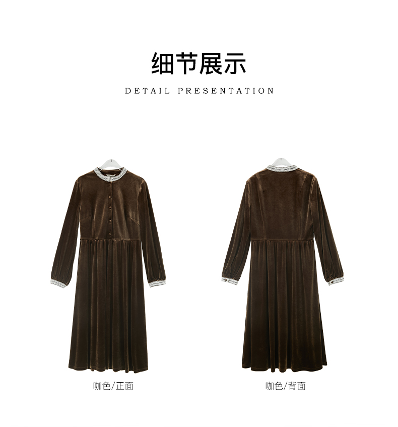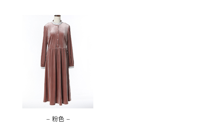 Famecoco范可儿优雅复古花边立领丝绒裙收腰连衣裙FAB6FA007