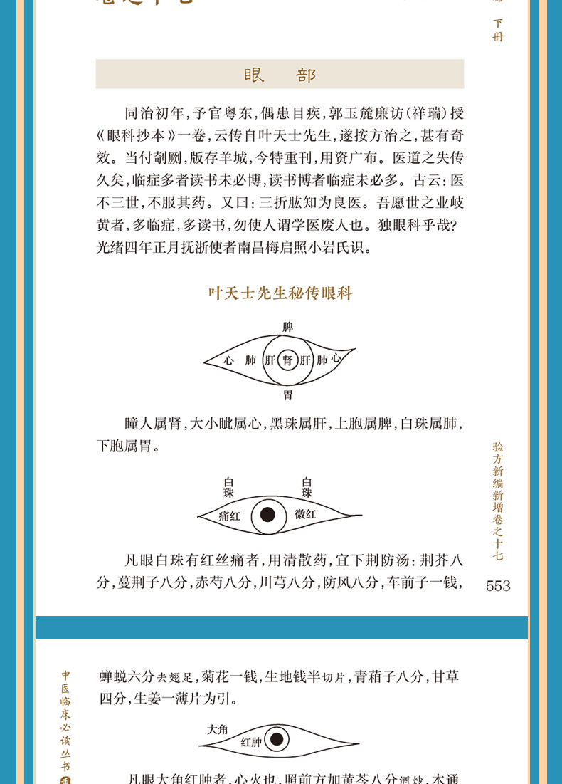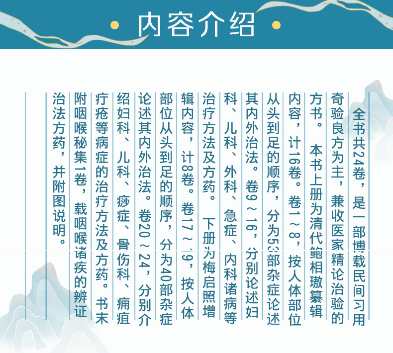 本书系中医临床必读丛书之一。该丛书畅销十余年,累计数百万销量,久居图书畅销榜前列。所选医籍均为精善底本,为读者提供精确的原文。《验方新编》为清代鲍相璈纂辑,梅启照增辑。全书共24卷,是一部博载民间习用奇验良方为主,兼收医家精论治验的方书。 本书上册为清代鲍相璈纂辑内容,计16卷。卷1~8,按人体部位从头到足的顺序,分为53部杂症论述其内外治法。卷9~16,分别论述妇科、儿科、外科、急症、内科诸病等治疗方法及方药。 下册为梅启照增辑内容,计8卷。卷17~19,按人体部位从头到足的顺序,分为40部杂症论述其内外治法。卷20~24,分别介绍妇科、儿科、痧症、骨伤科、痈疽疔疮等病症的治疗方法及方药。书末附咽喉秘集1卷,载咽喉诸疾的辨证治法方药,并附图说明。 本次整理,以清光绪四年(1878)杭州东壁斋24卷刻本为底本,经过精心校勘而成,书前增加导读,书后附有方剂索引,便于读者查阅。是中医临床,特别是基层医生必读之书。