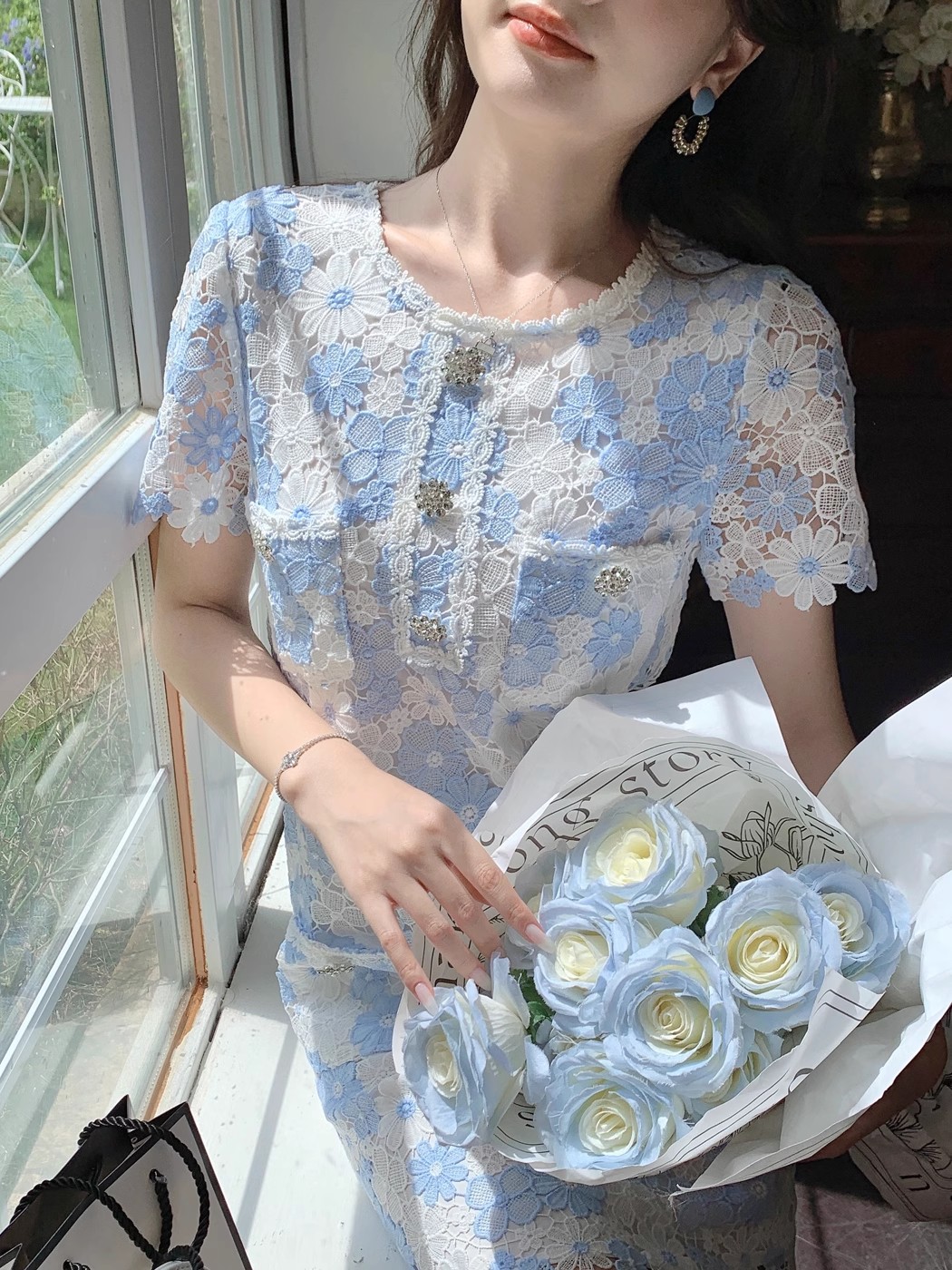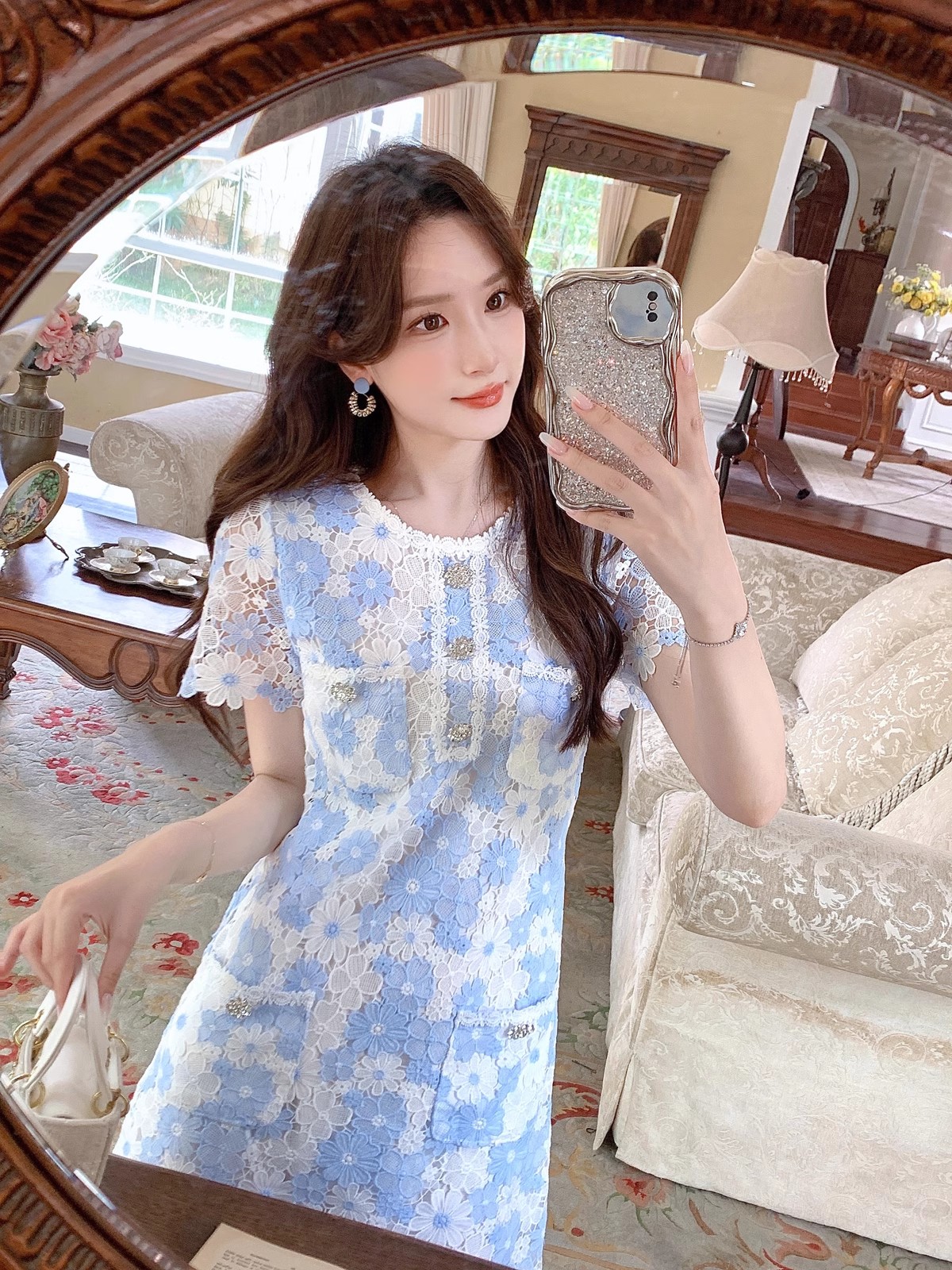 张心子【青花瓷】小香风重工水溶蕾丝连衣裙女夏轻奢钩花镂空短裙 U2407010
