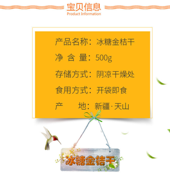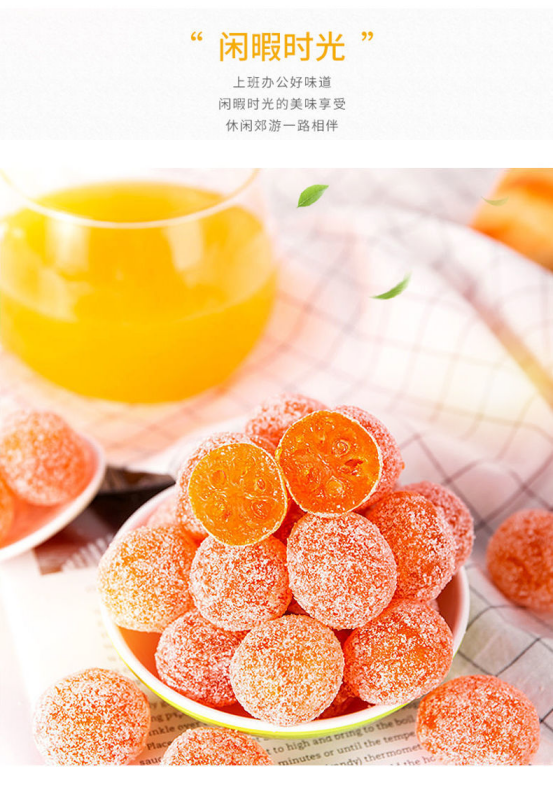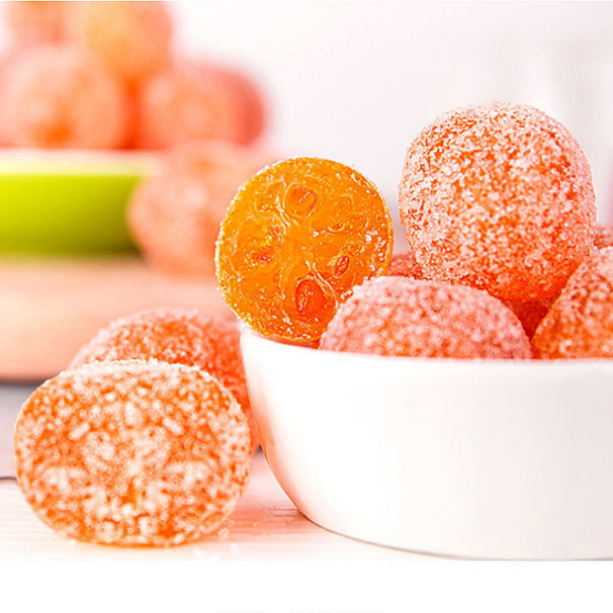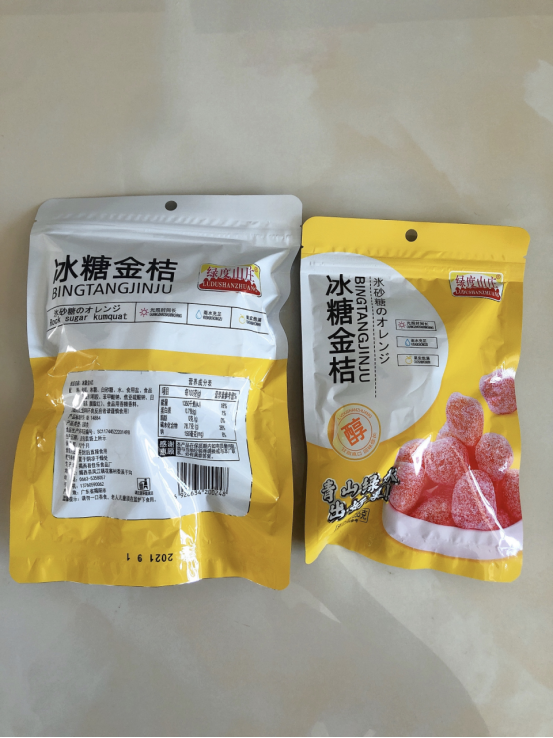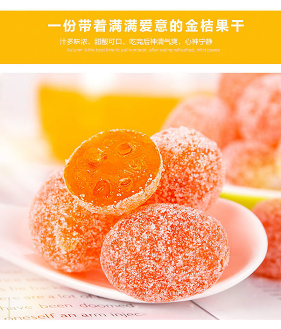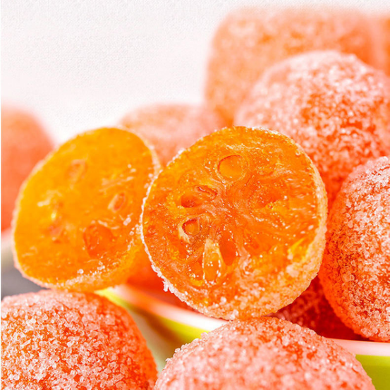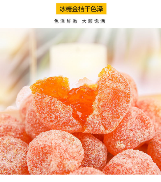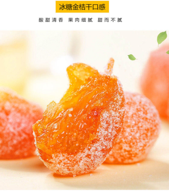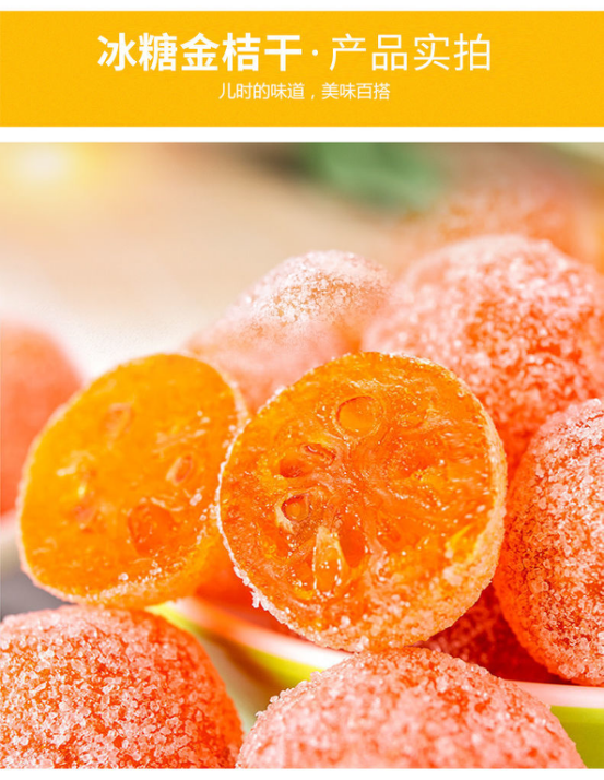 【配料】金桔、冰糖、白砂糖、食用盐、食品添加剂(苯甲酸钠、山梨酸钾、胭脂红、日落黄)食用香料