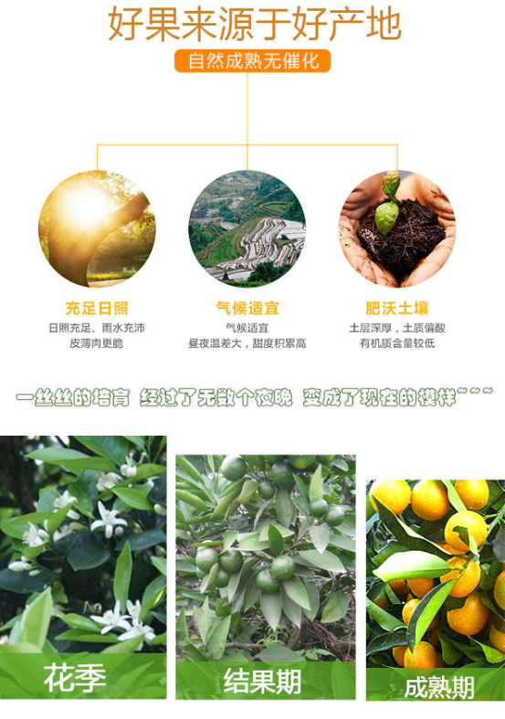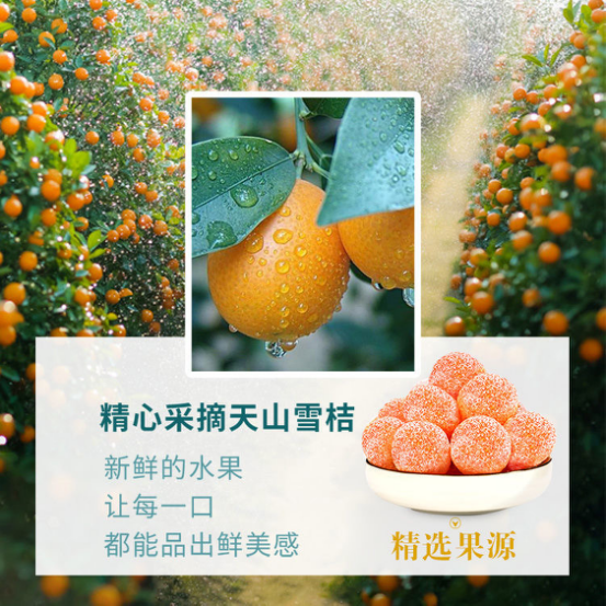 1.天山雪桔来源于好产地新疆天山、日照充足、雨水充沛、皮薄肉更脆,气候适宜、昼夜温差大甜度积累高、土层深厚、土质偏酸,有机质含量较低。