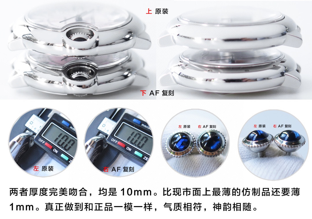 【表壳】直径33毫米,厚度10毫米,原装一致!精钢材质表壳,最顶级蓝宝水晶镜面,月牙开口一模一样。全部可与原装正品手表零件互换!精细无比!