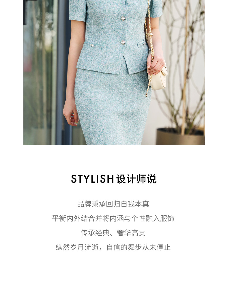 成熟、稳重、高贵典雅、大方得体 融合东方文化的含蓄和法国的浪漫 将创意的艺术性与消费需求相结合 为自信女性塑造高品质场合服装