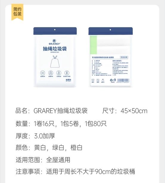 加量不加价!升级3.0版本加厚款GRAREY抽绳垃圾袋,3包240只