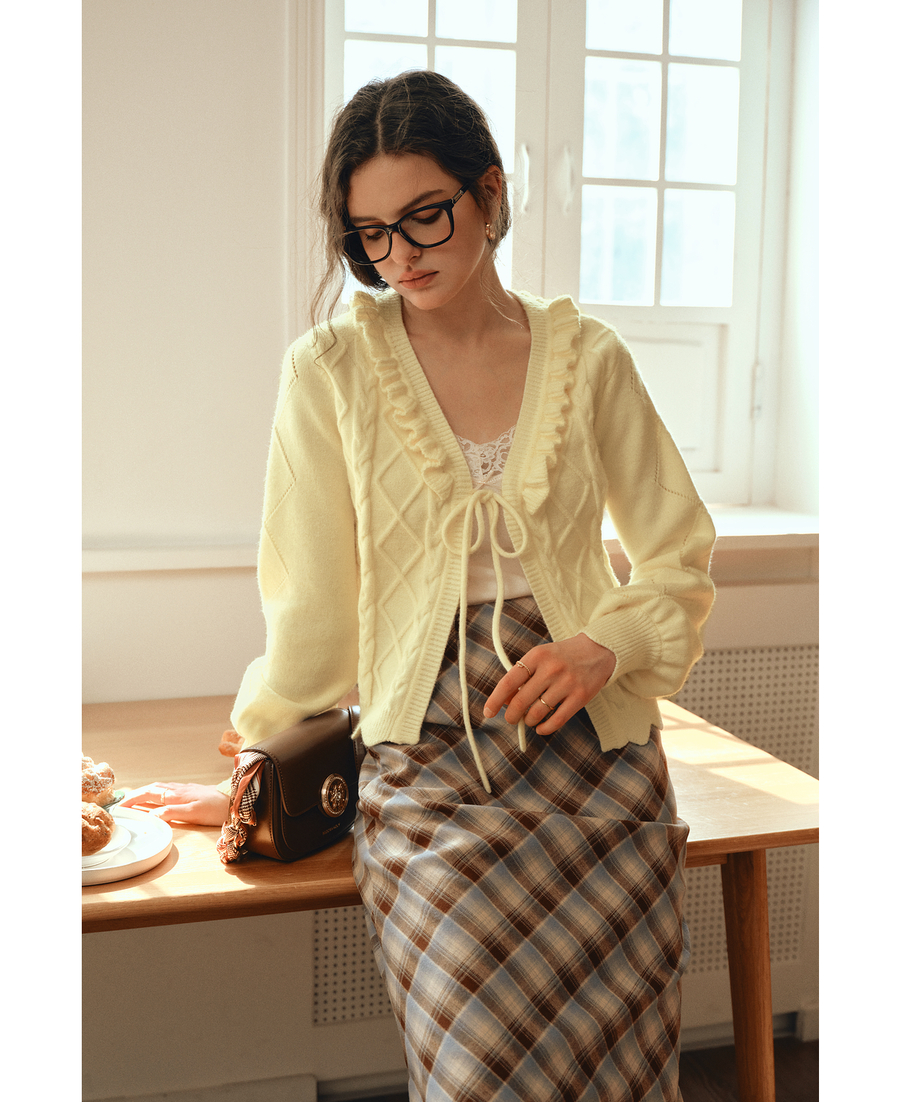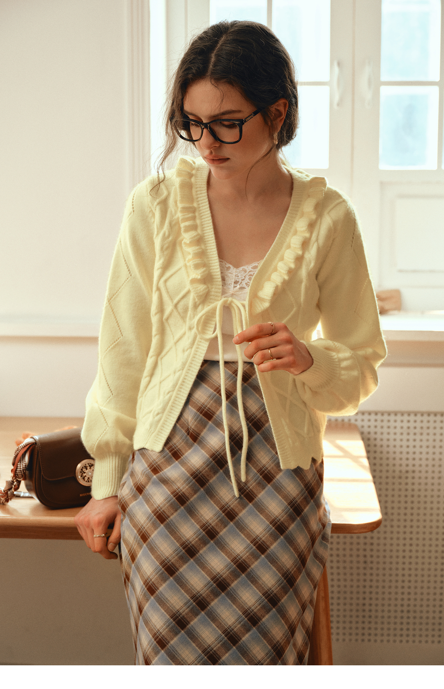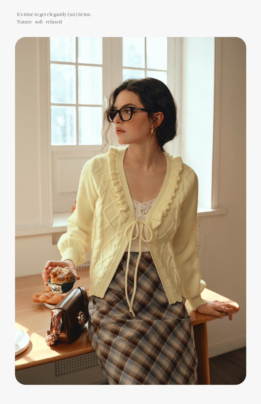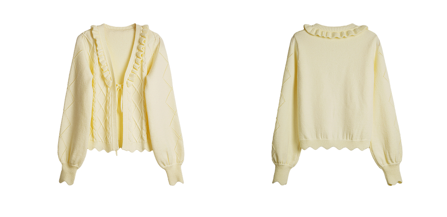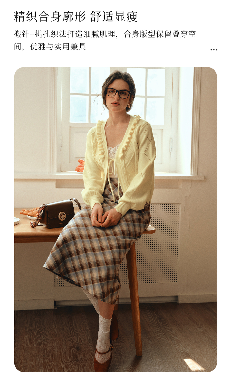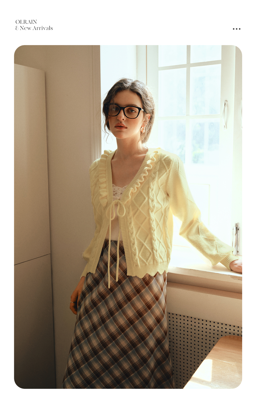 OLrain欧芮儿2025新款女秋季法式甜美温柔荷叶边V领毛织开衫上衣