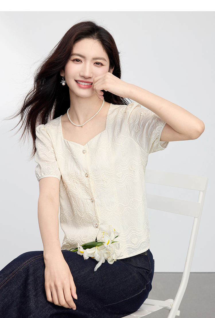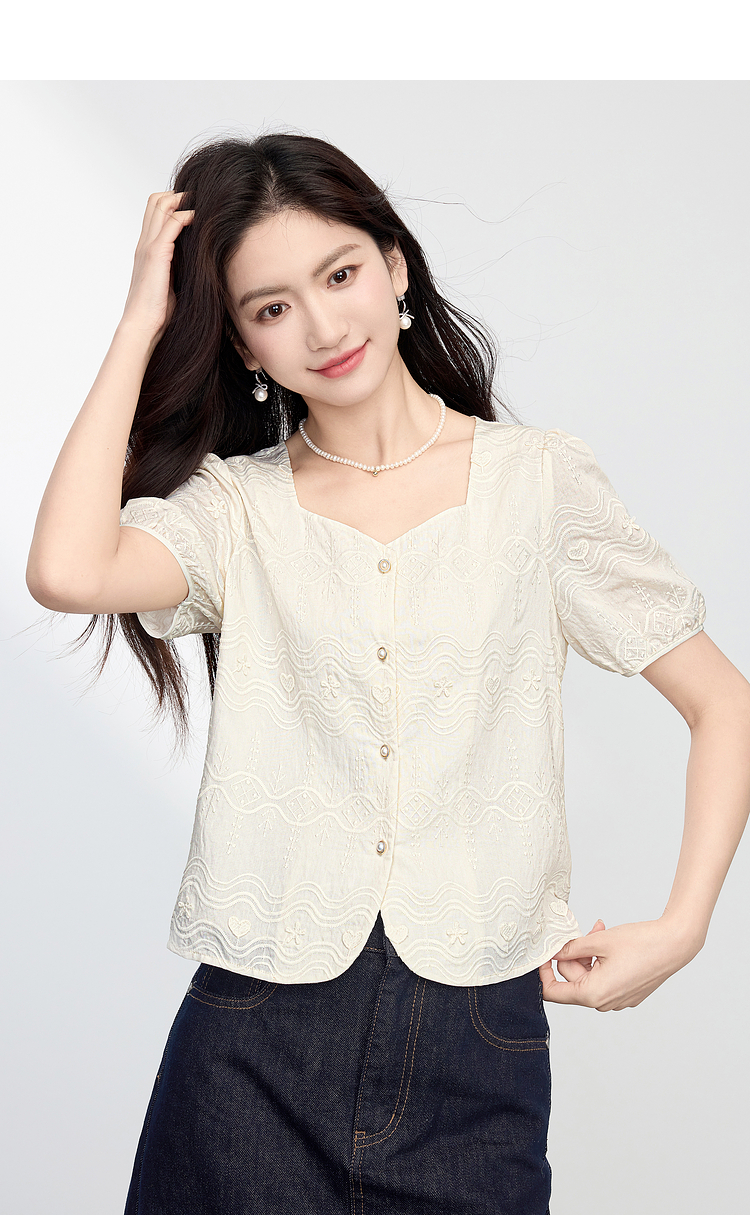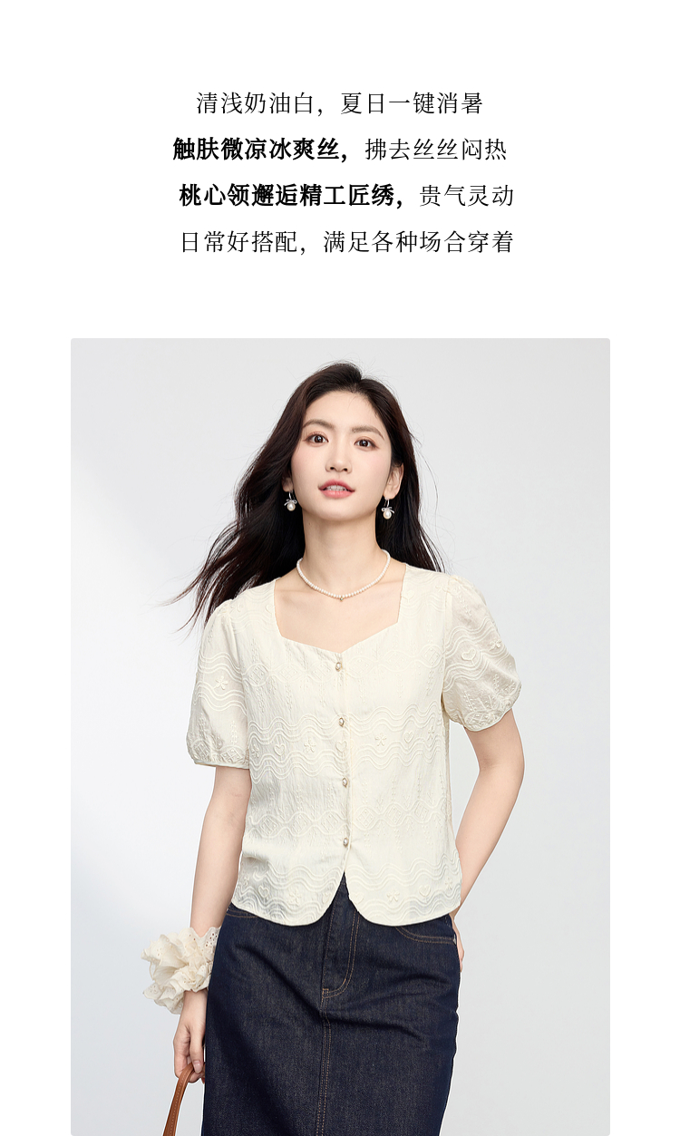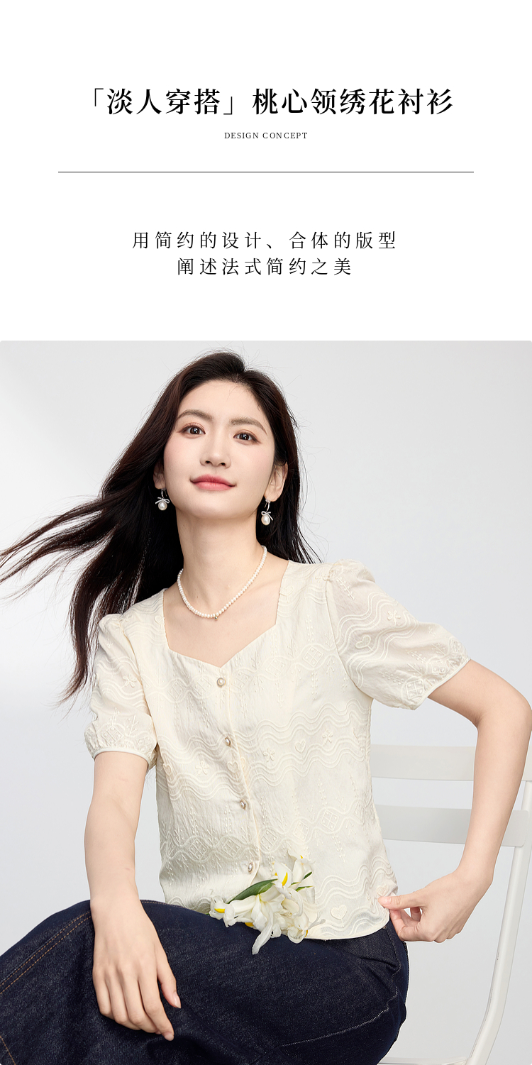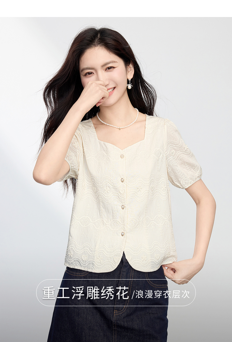 熙世界新中式国风绣花衬衫女夏季2025新款独特别致方领泡泡袖上衣