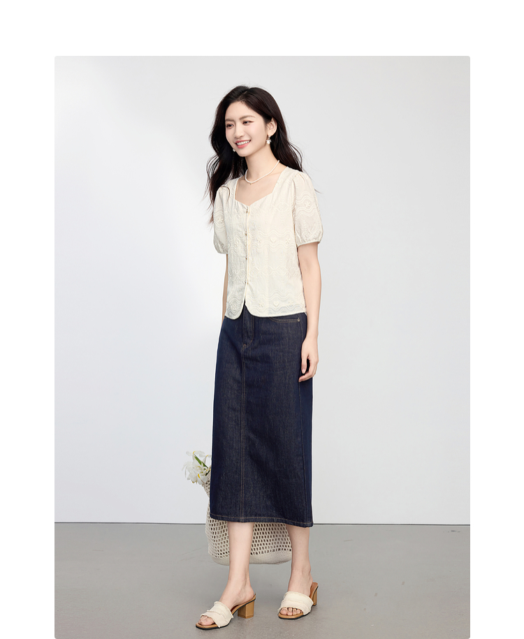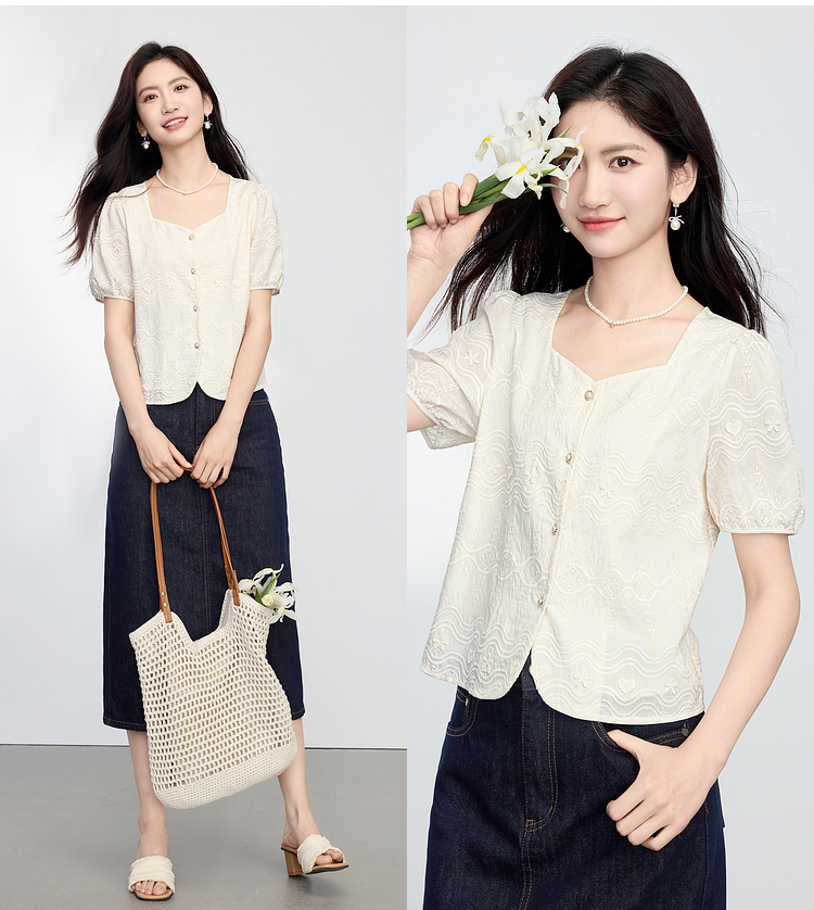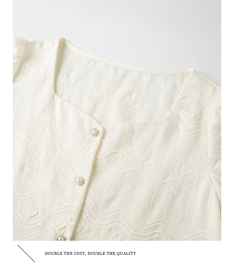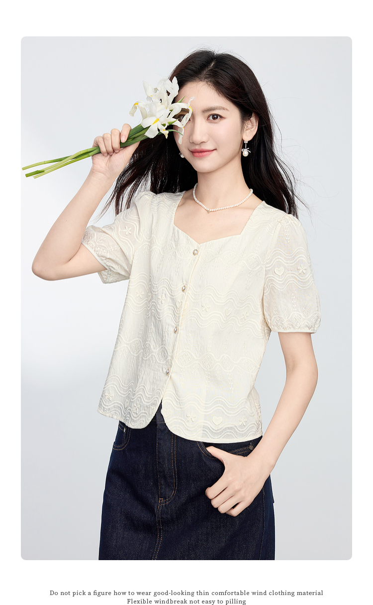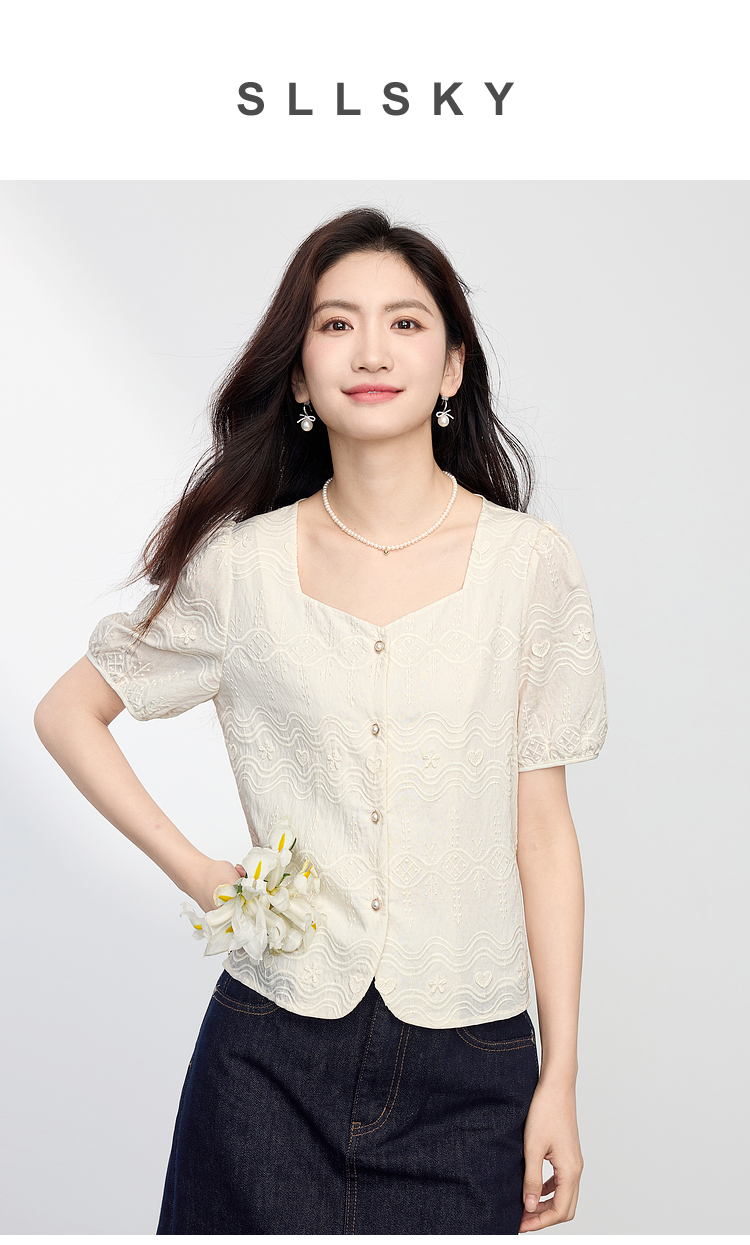 熙世界新中式国风绣花衬衫女夏季2025新款独特别致方领泡泡袖上衣