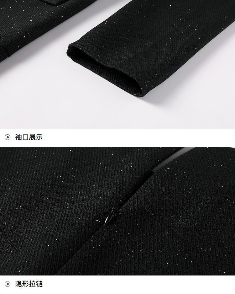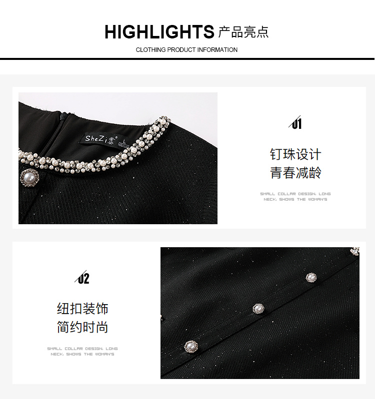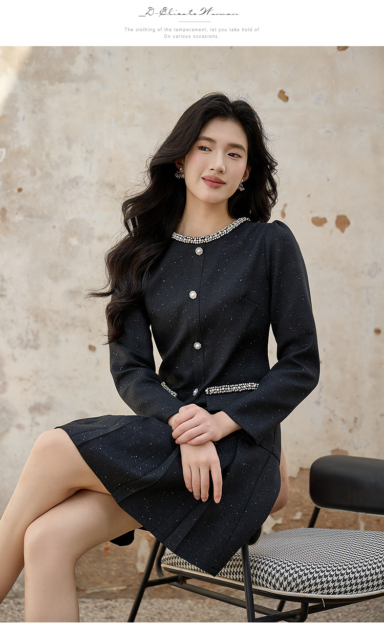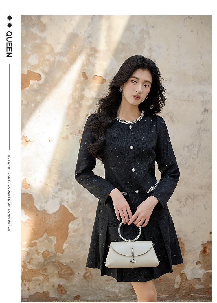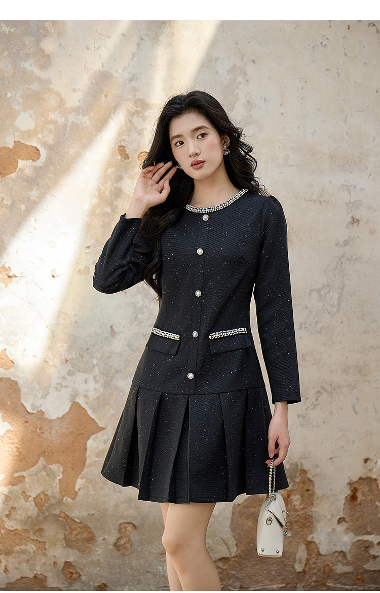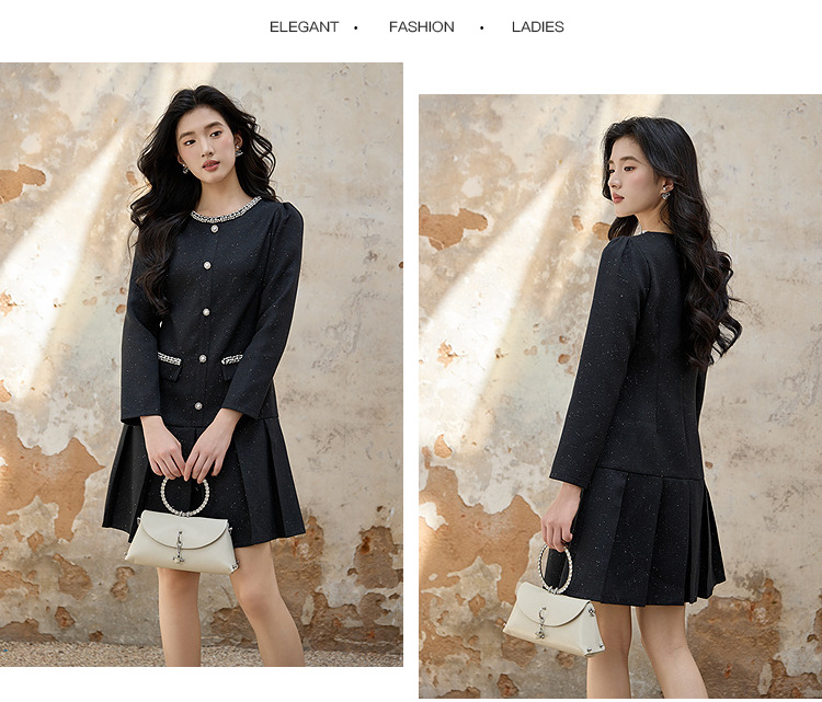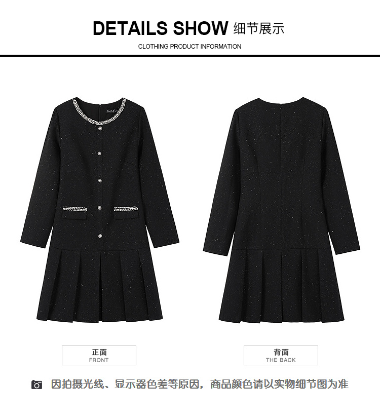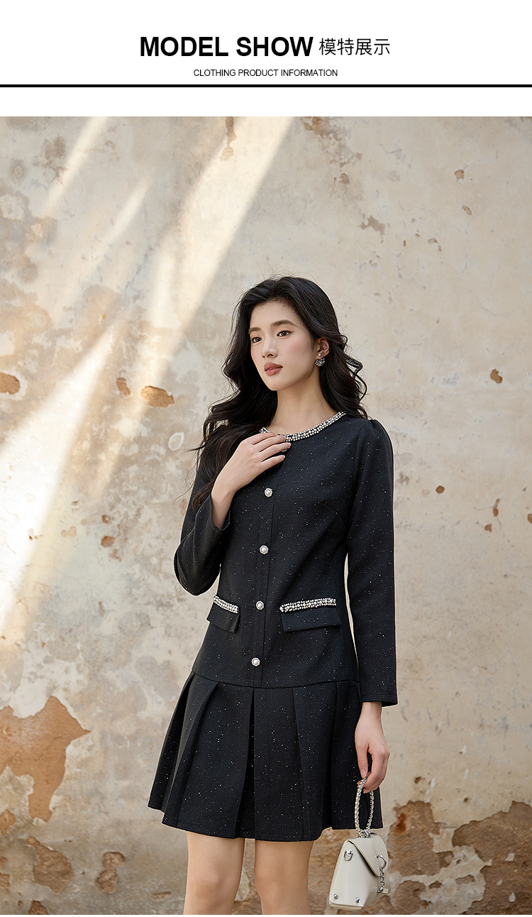 奢姿大码女装2025秋装新款胖妹妹钻饰圆领单排扣亮丝百褶连衣裙9953893180