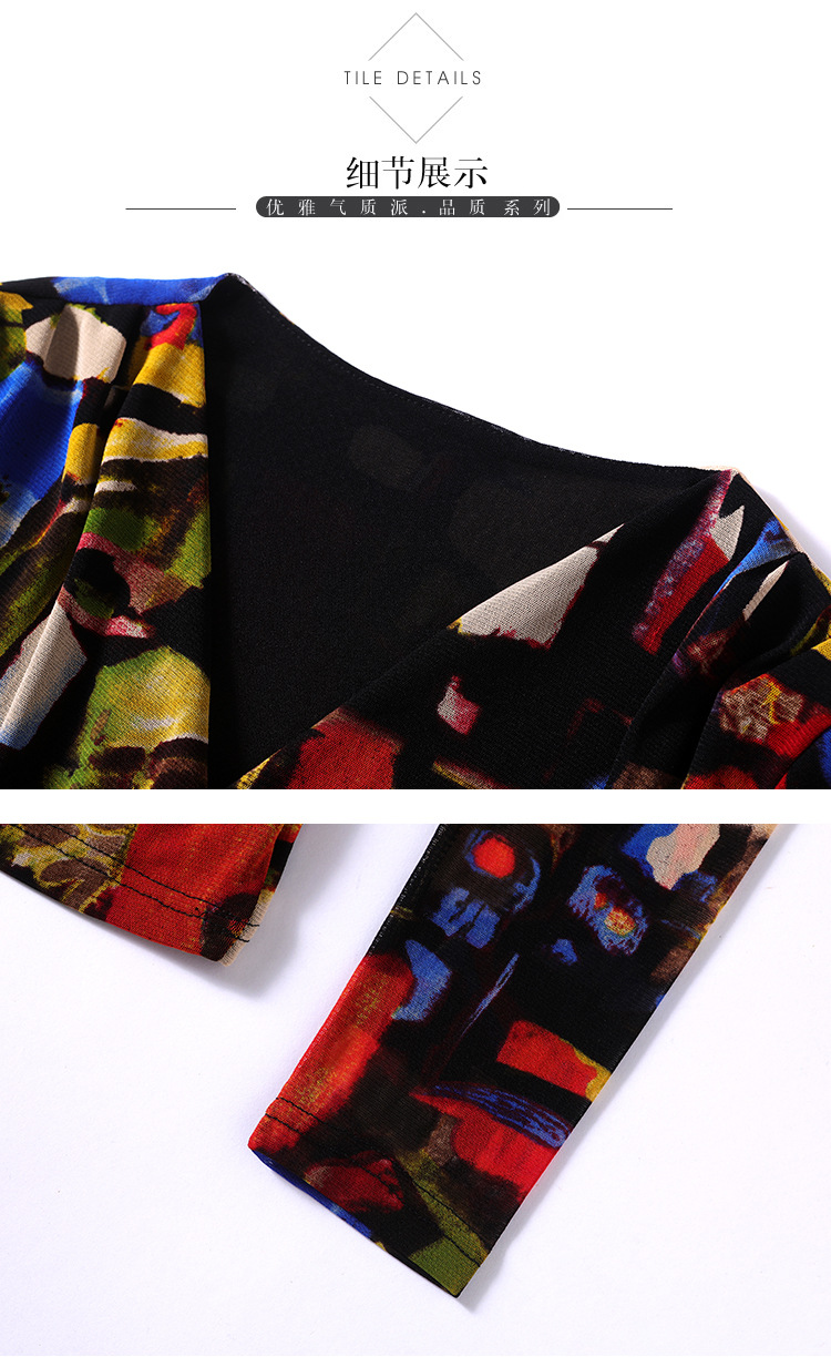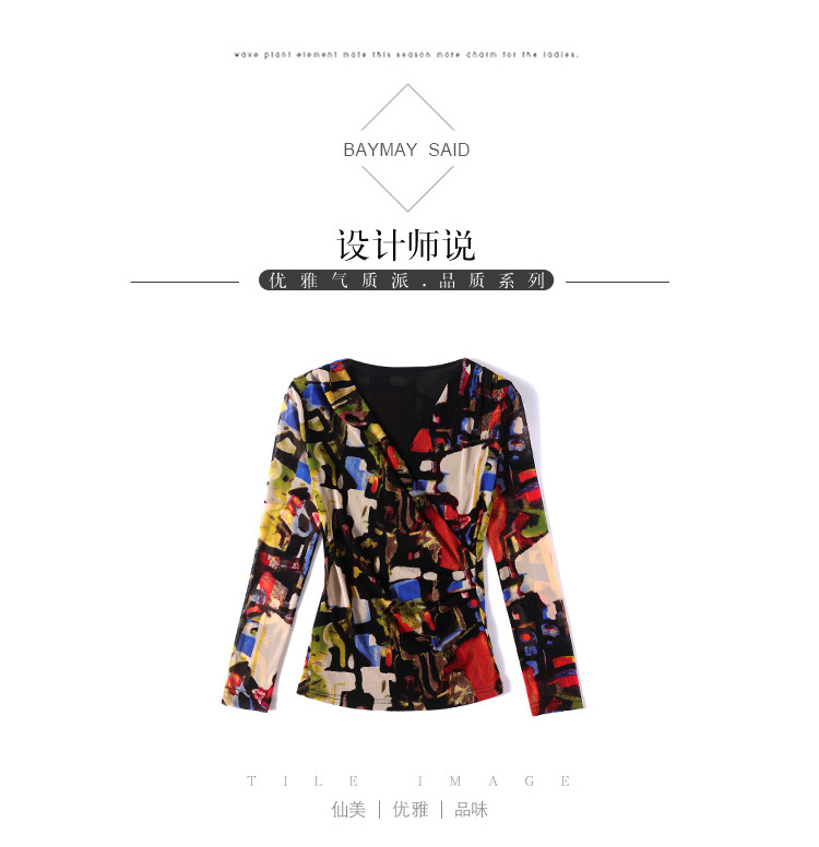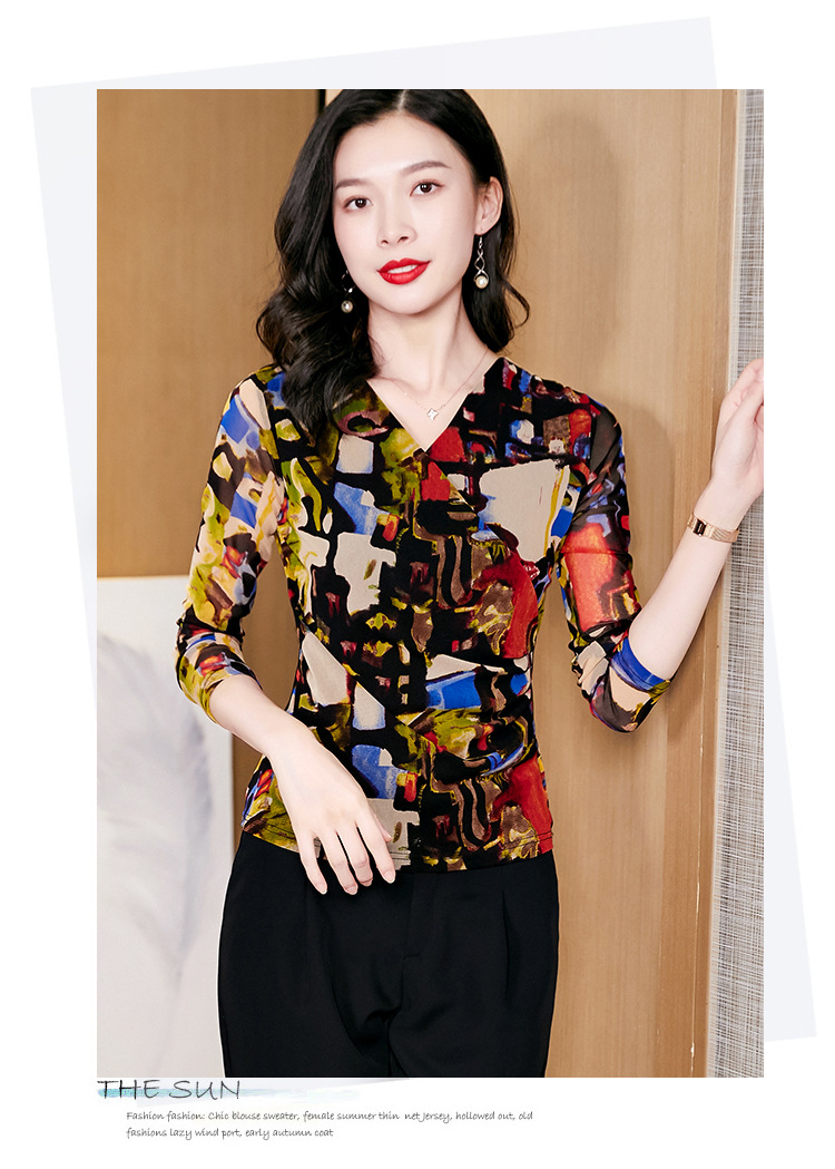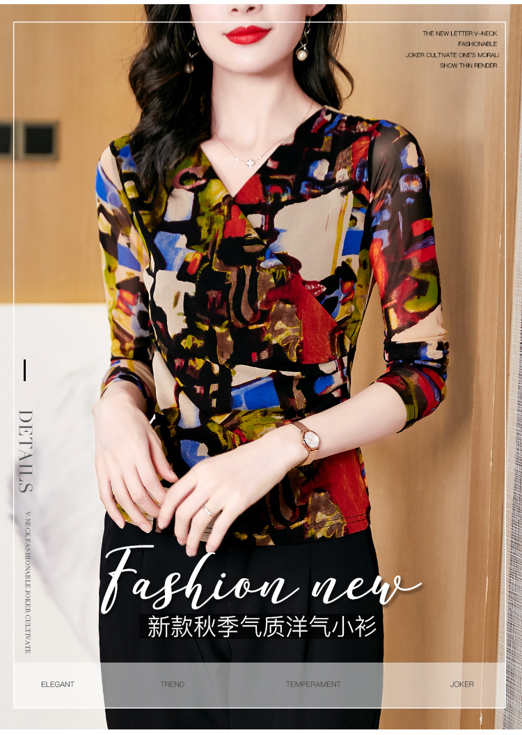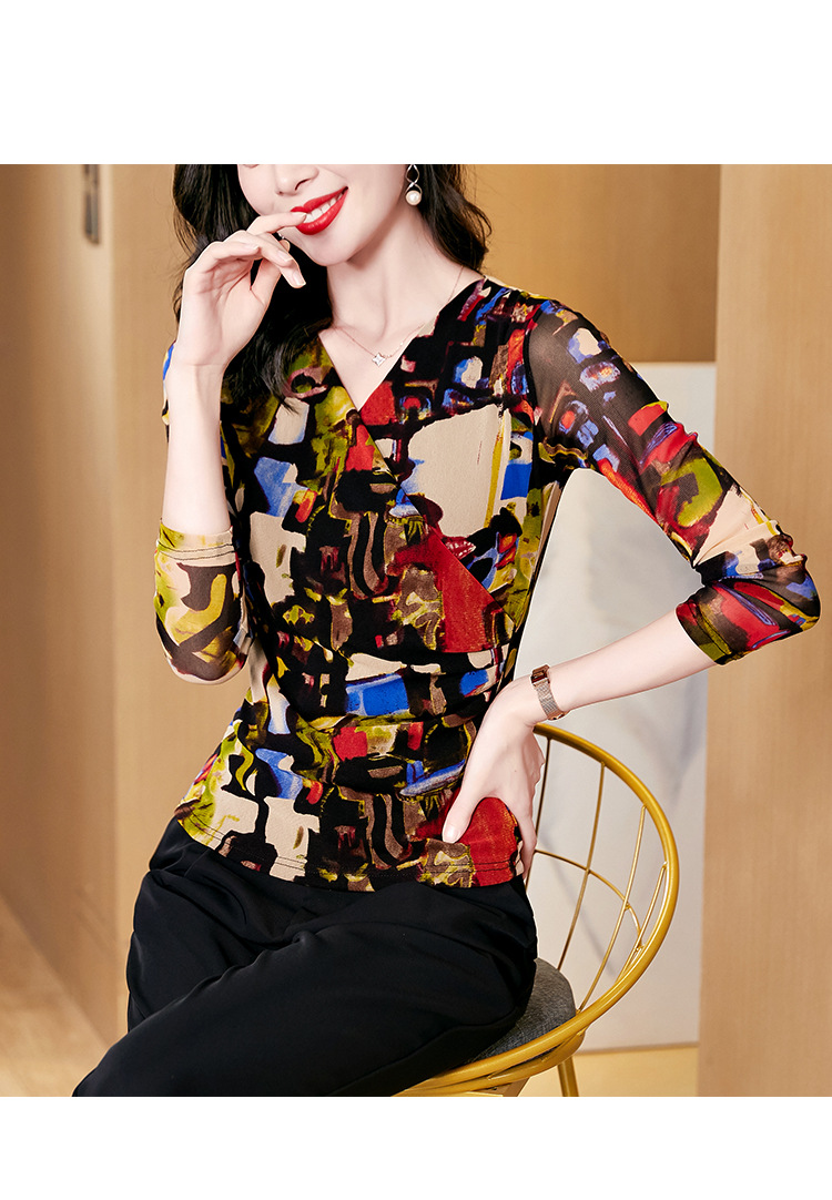 秋季新款,交叉领修身显瘦网纱T恤印花长袖打底衫大码妈妈装KQL-9952