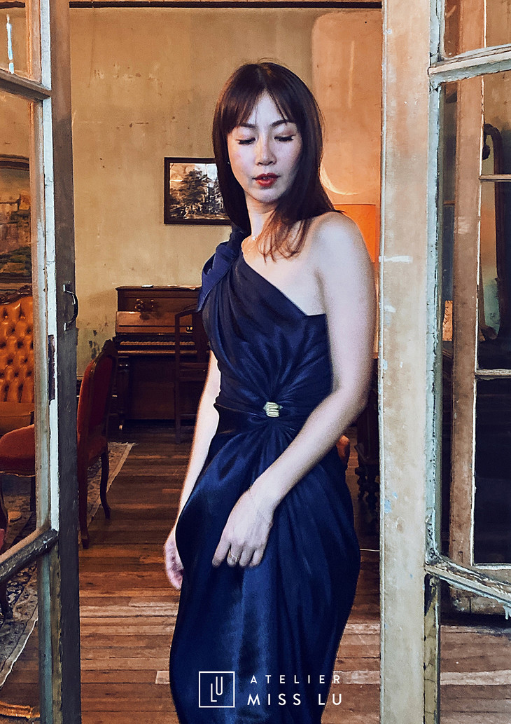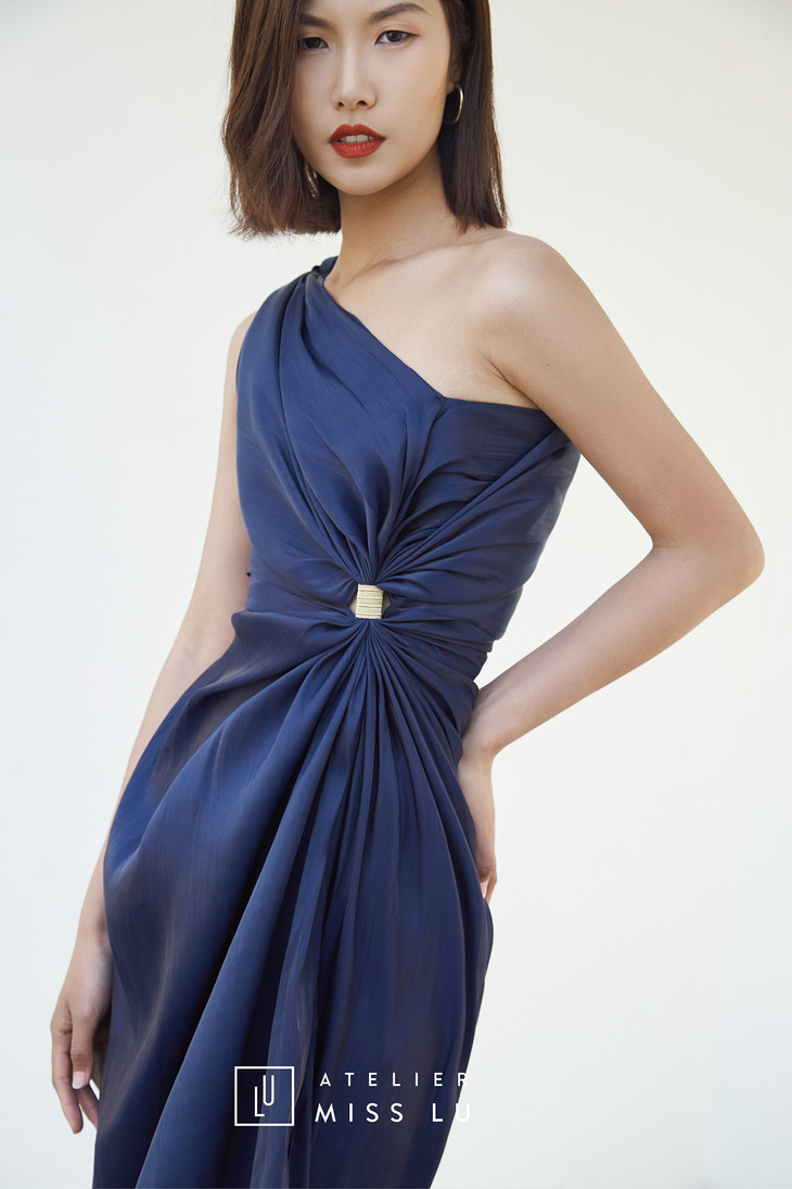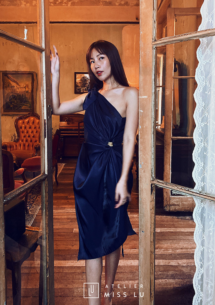 AtelierMissLu / Selene-神秘蓝高腰开叉露肩短款连衣裙