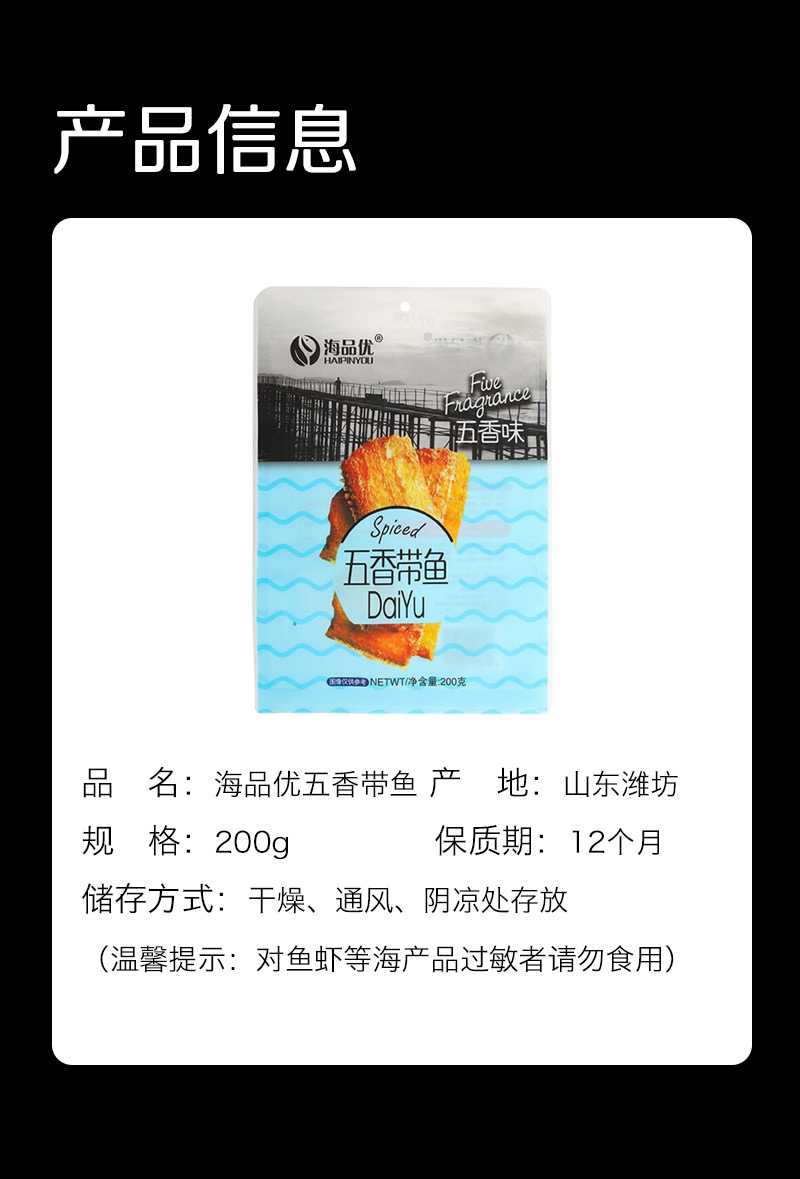 周五配送!海品优手撕五香带鱼!市面上的瓦罐带鱼都是汤汁泡的,这款是真正卤进去的味道,也只有这款是真正不腥的手撕带鱼,人工去黑膜,超级入味,甜、咸、鲜!开袋即食,味道绝了,一袋200克