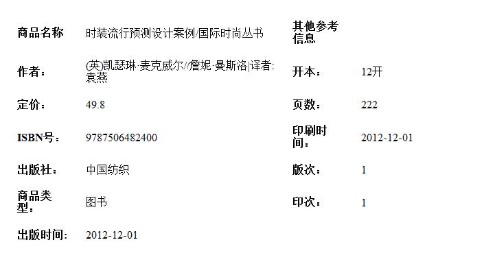 《时装流行预测设计案例》由凯瑟琳·麦克威尔和詹妮·曼斯洛著,袁燕译,本书旨在阐明流行预测在现代时装产业中的作用。本书的目标读者是有所抱负的设计师、中等水平的学生以及具有一定时尚知识和技能的年轻从业人员。本书立足于初级设计师,他们需要理解时装产业所提供的流行情报,以便能够自我充实、明确设计方向并不断获取灵感。文中插图不仅阐明了流行趋势预测公司的作用,情报制作过程及其发展的前景,而且也表述了如何运用最新的时尚插画和图形来进行流行情报的发布与传达。《时装流行预测设计案例》是专业师生和产业设计师不可多得的流行趋势预测参考手册。