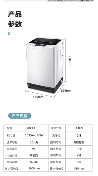 TCL 10公斤全自动大容量小体积波轮洗衣机 一键脱水 B100F1云墨蓝