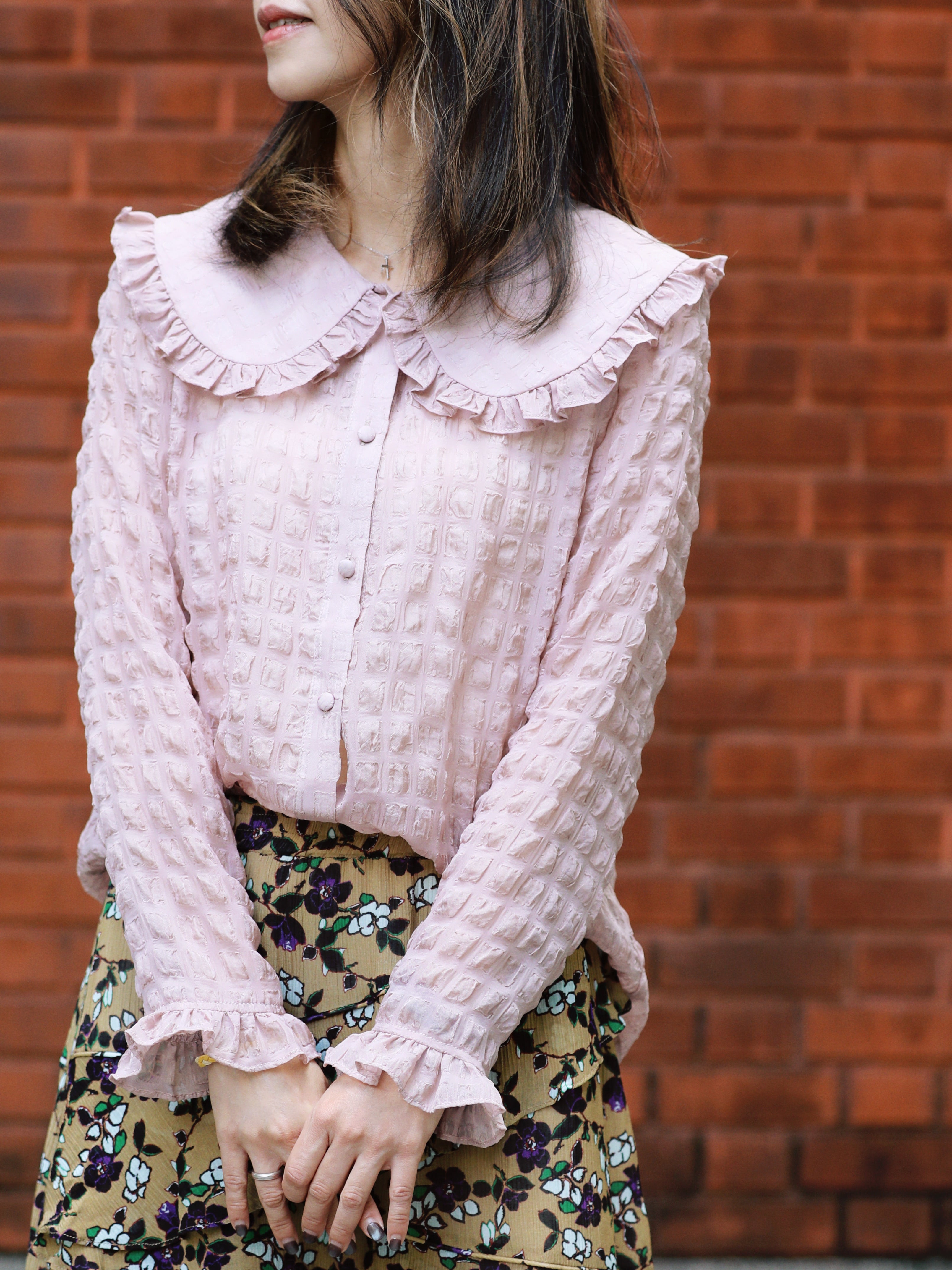 TYNVIE 纹理粉色荷叶边领长袖丝质衬衫