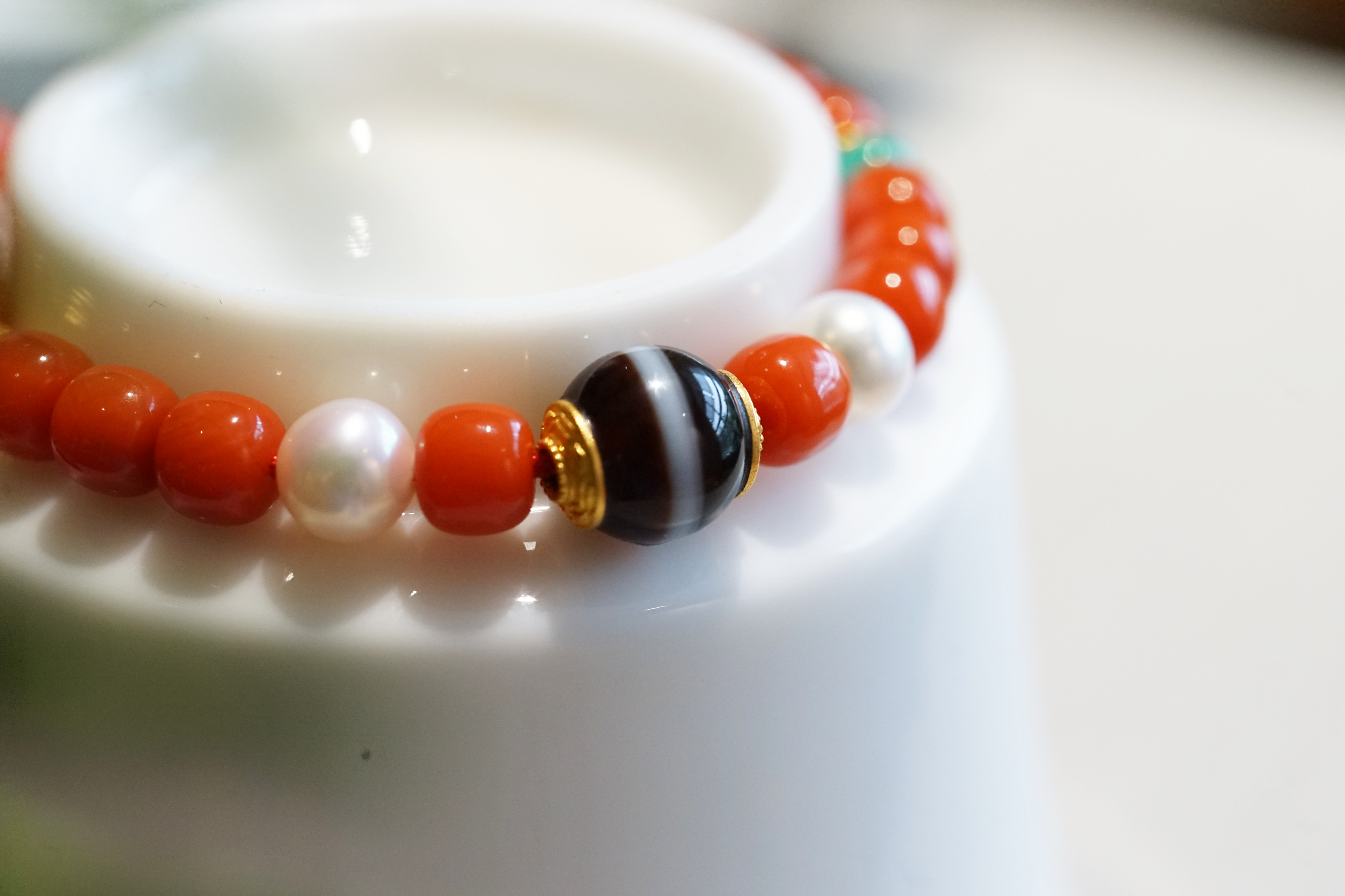 18K+足金红珊瑚绿松石珍珠手链 特价