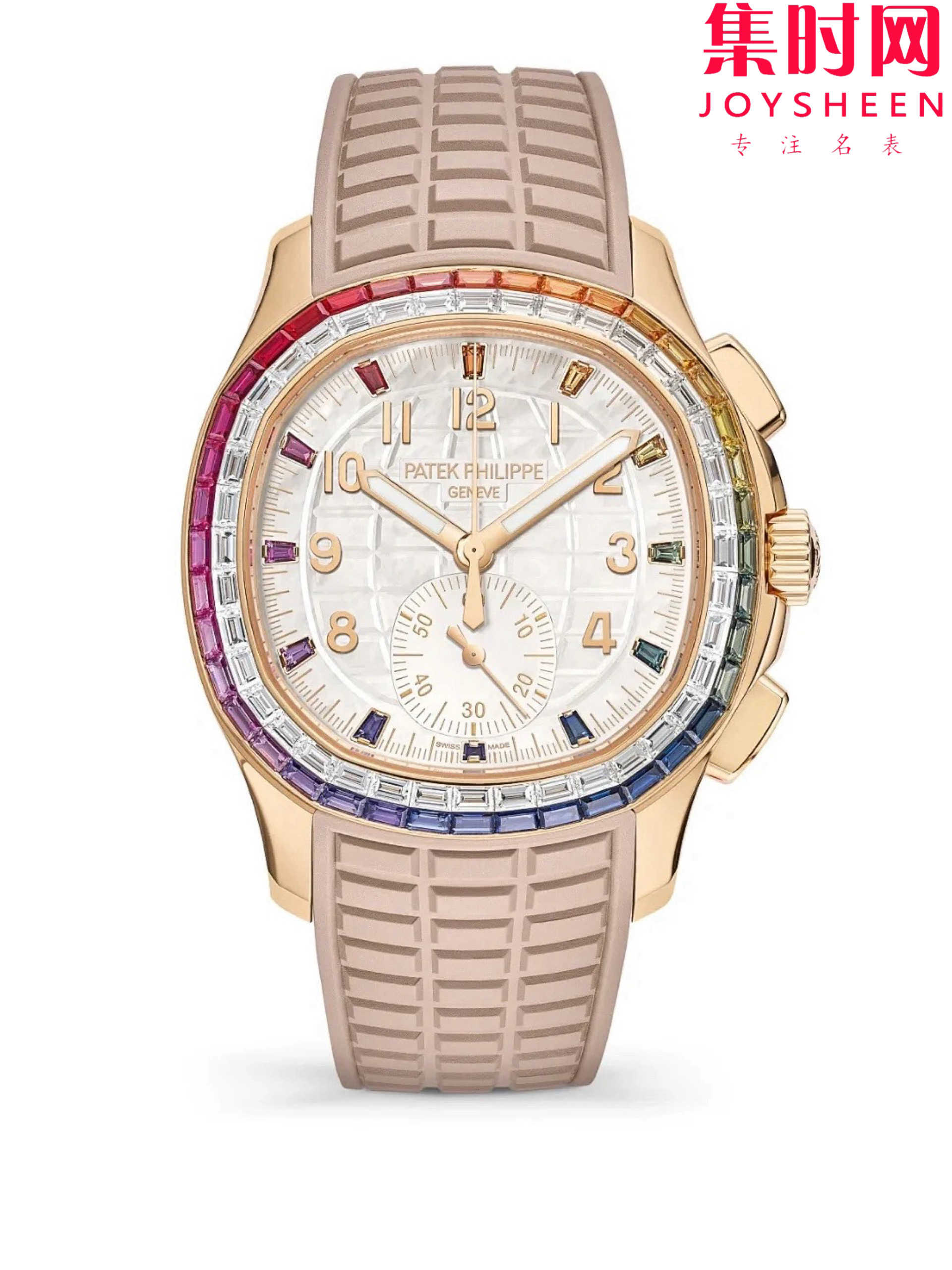 Aquanaut Luce“彩虹”计时腕表专为充满活力的现代中性设计,选用玫瑰金材质匠心打造,并运用隐形镶嵌技艺镶饰长形钻石与彩色蓝宝石,绽放彩虹光彩。