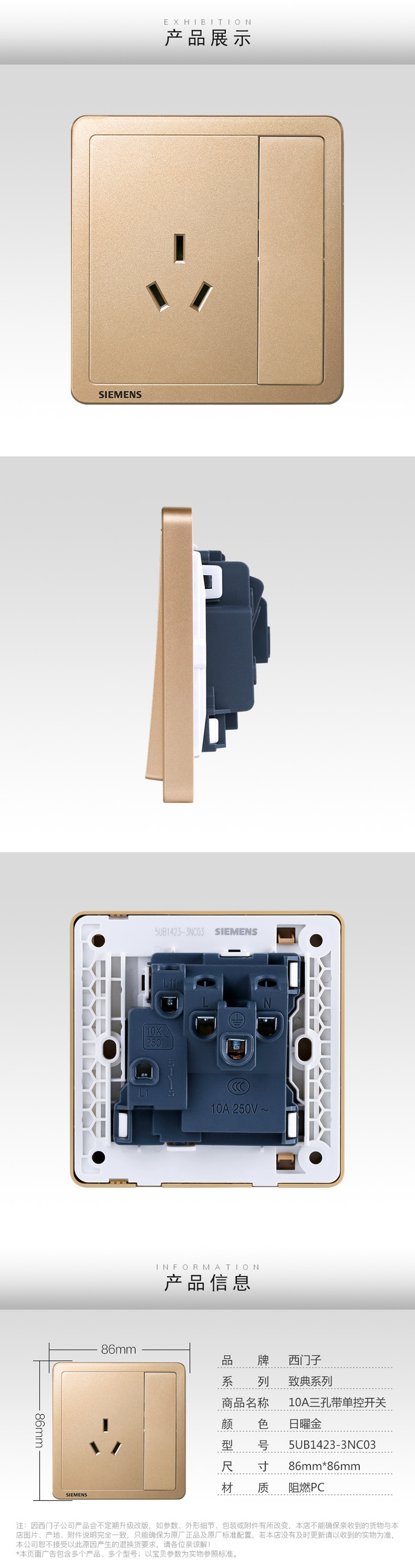 西门子开关插座面板致典日曜金10A三孔插座带开关