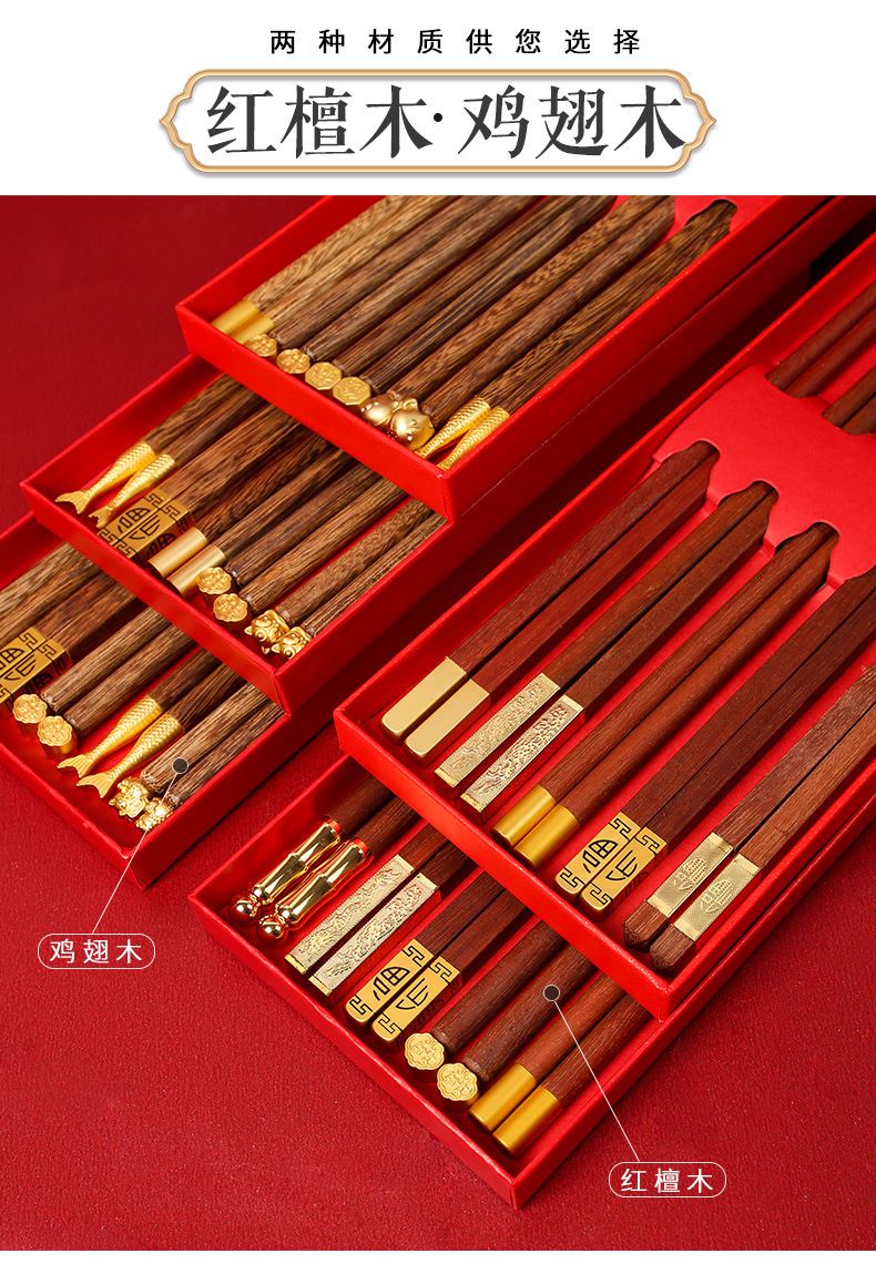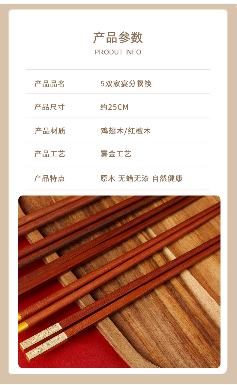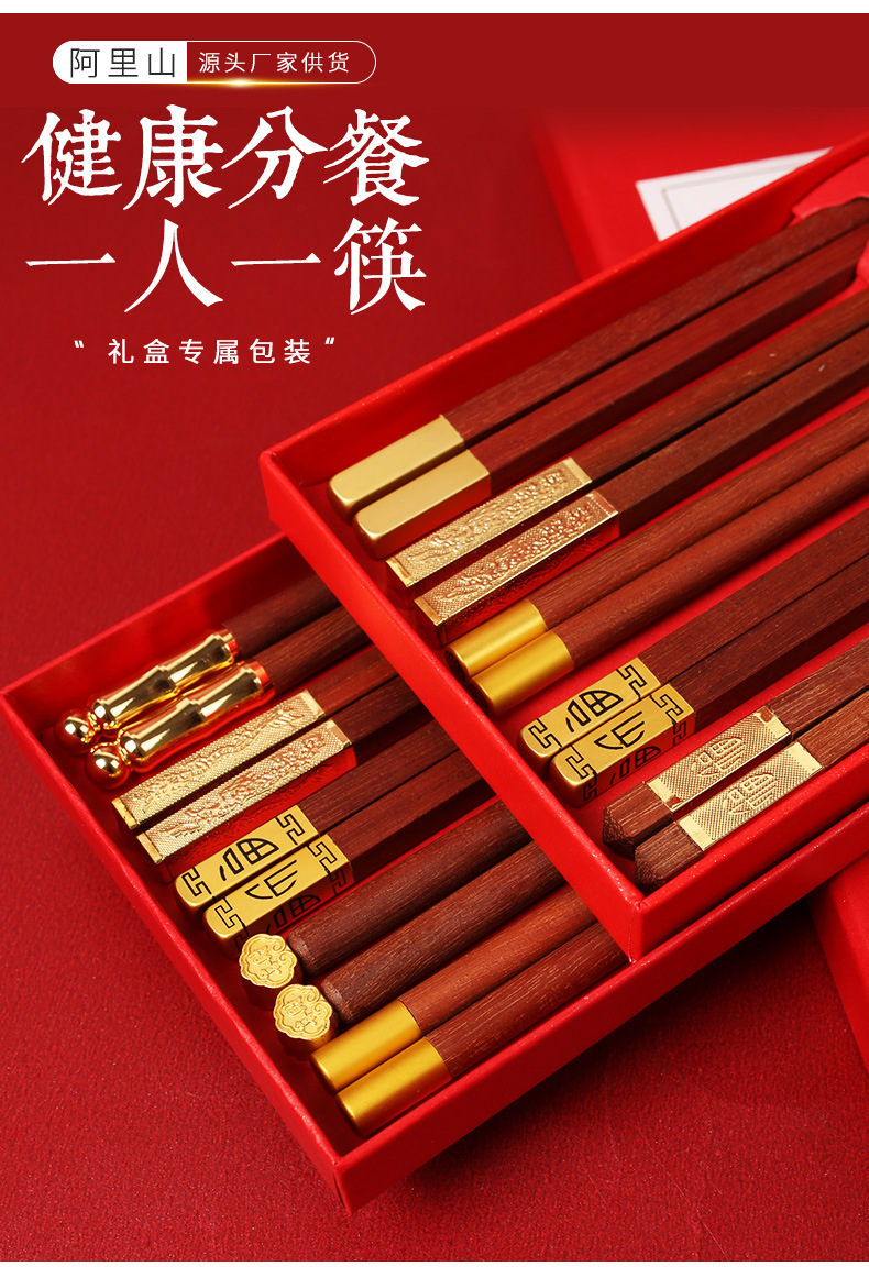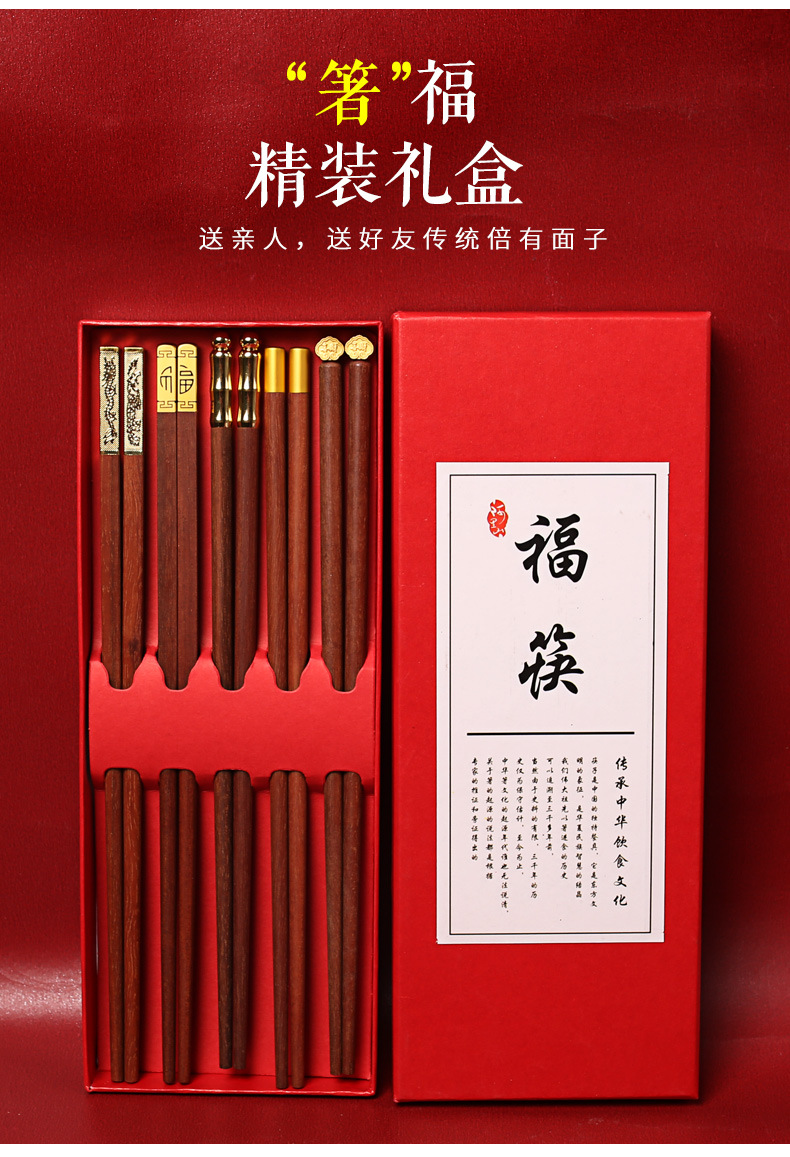 实木筷子礼盒装【健康分餐!一人一筷】家用鸡翅木红檀木,国潮筷子礼品套装,一人一筷5双礼盒装,色泽饱满,光滑无毛刺1握感舒适。