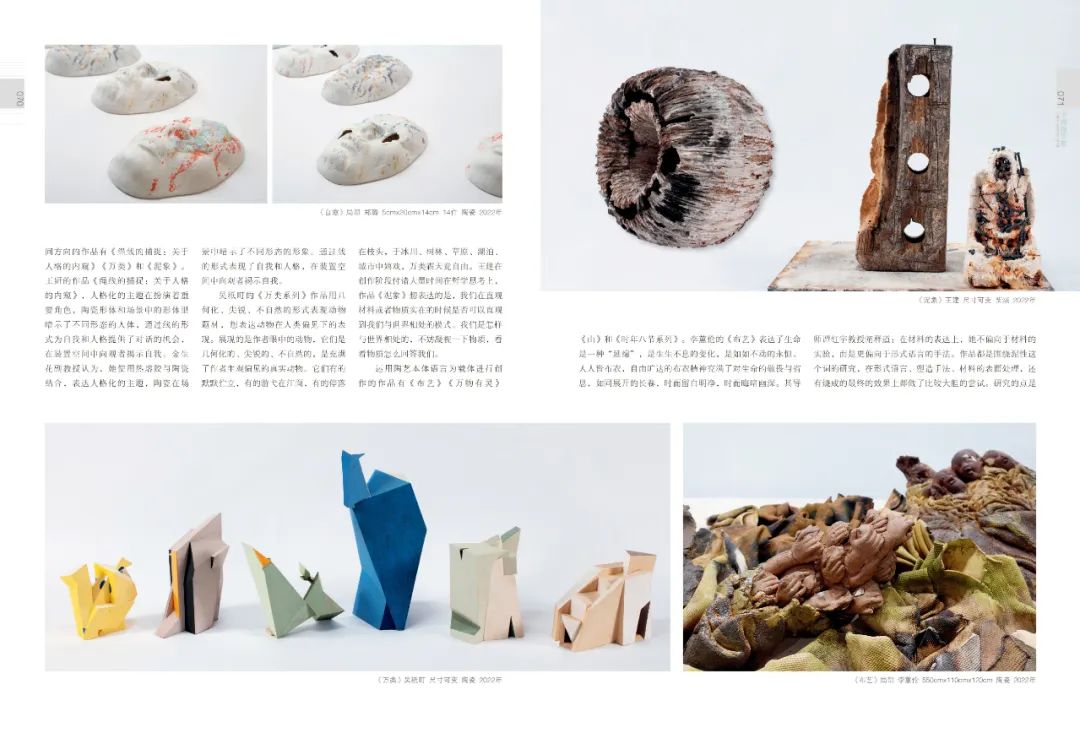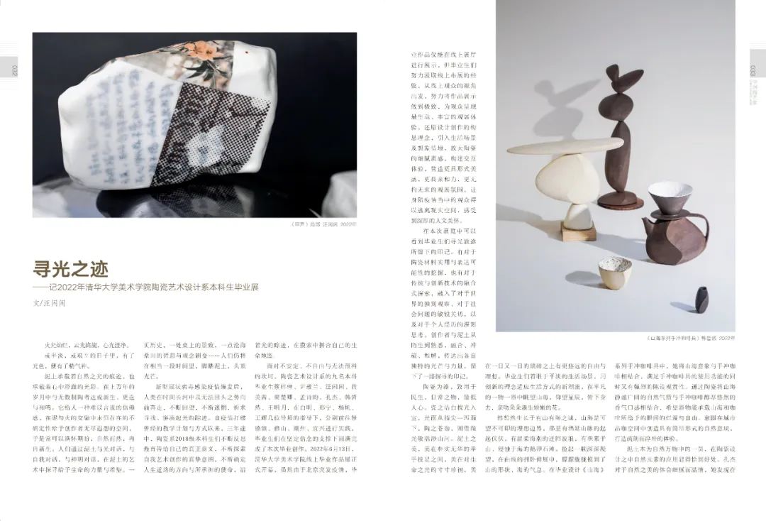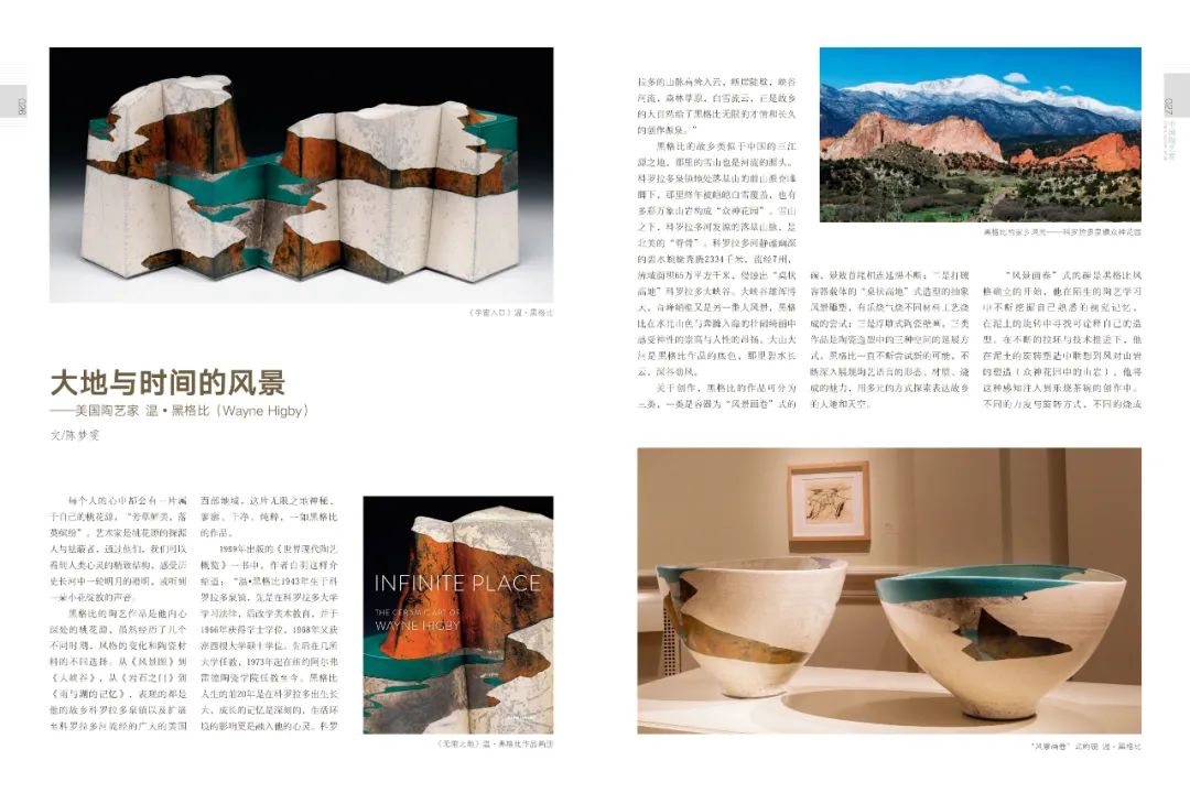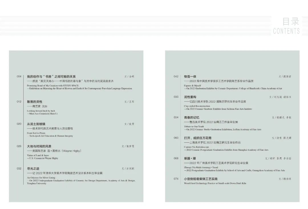 本期杂志推介了国内外3位以陶艺创作为主的优秀艺术家,分享其作品理念和经历。温•黑格比、沈厉、耿雪都于国内外陶艺界具有一定知名度。另外,对2022年上半年国内重要现代陶艺展览进行梳理,主要为各高校毕业创作展。包括清华美院本科生毕业展《寻光之迹》;中国美术学院毕业展《物吾一体》;四川美术学院研究生毕业展《泥性重构》;鲁迅美术学院《青春的记忆》;上海大学美术学院《打开、或抓住万花筒》。