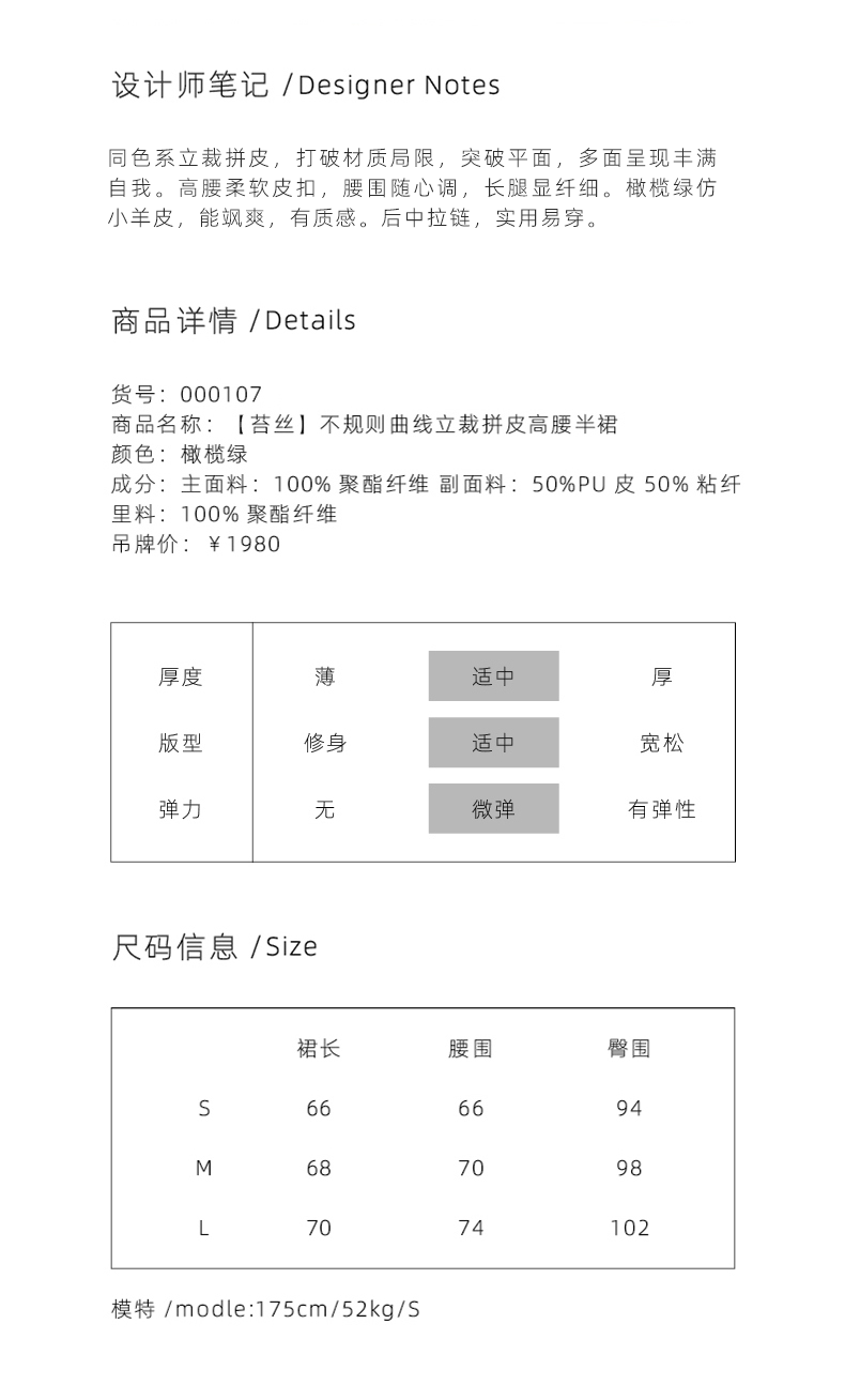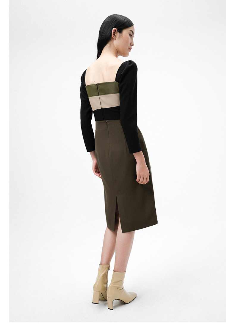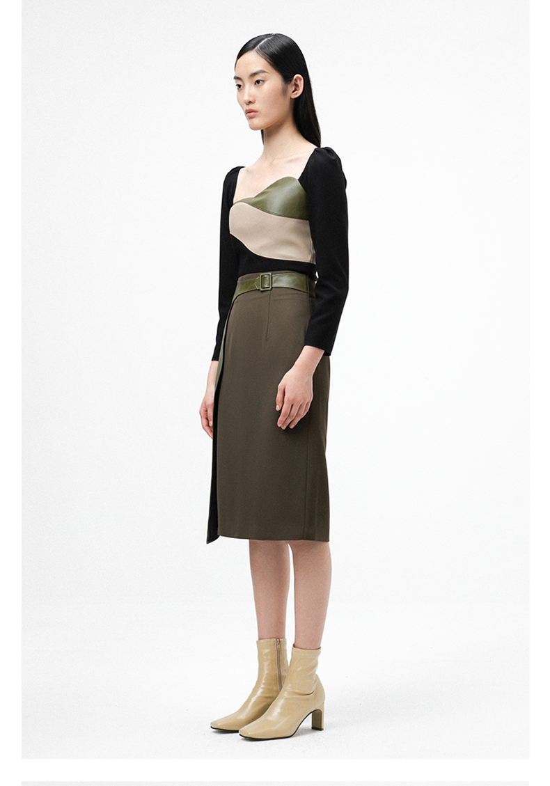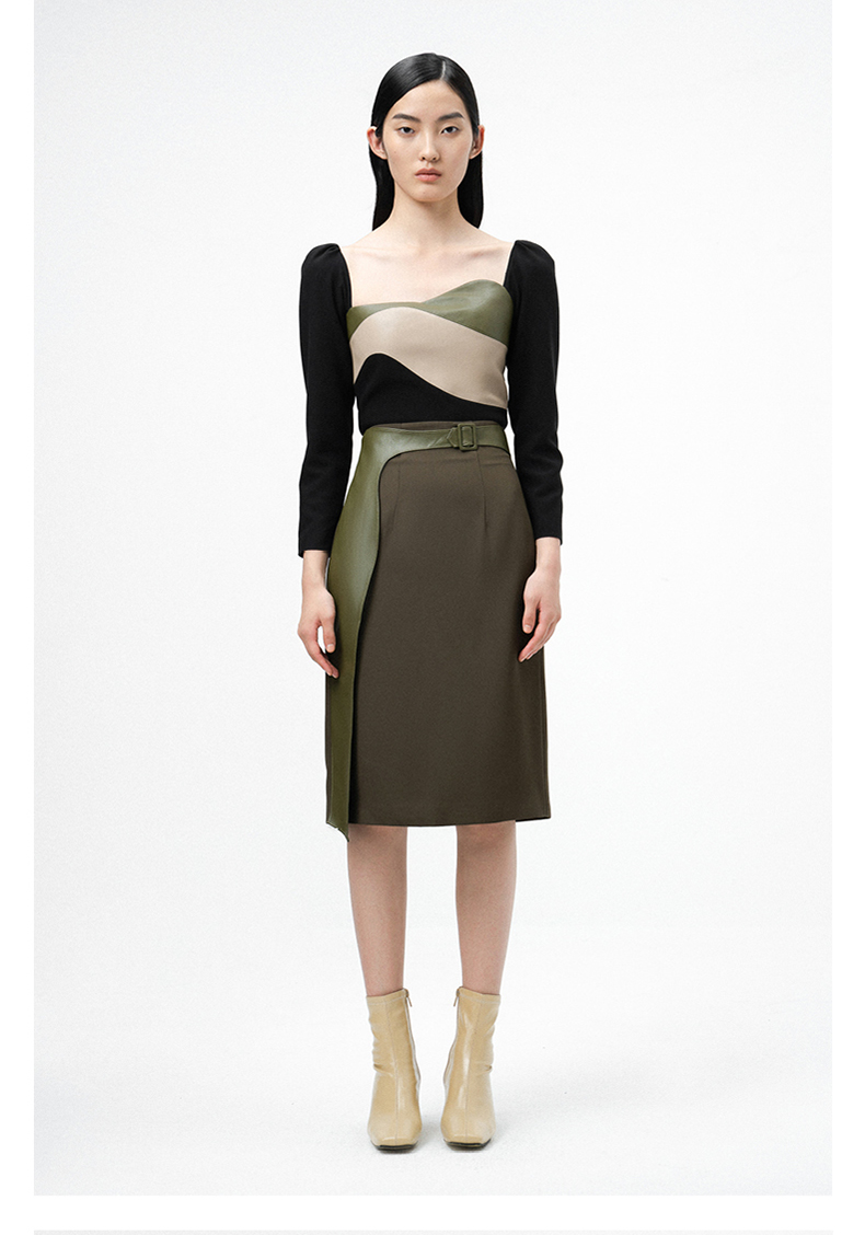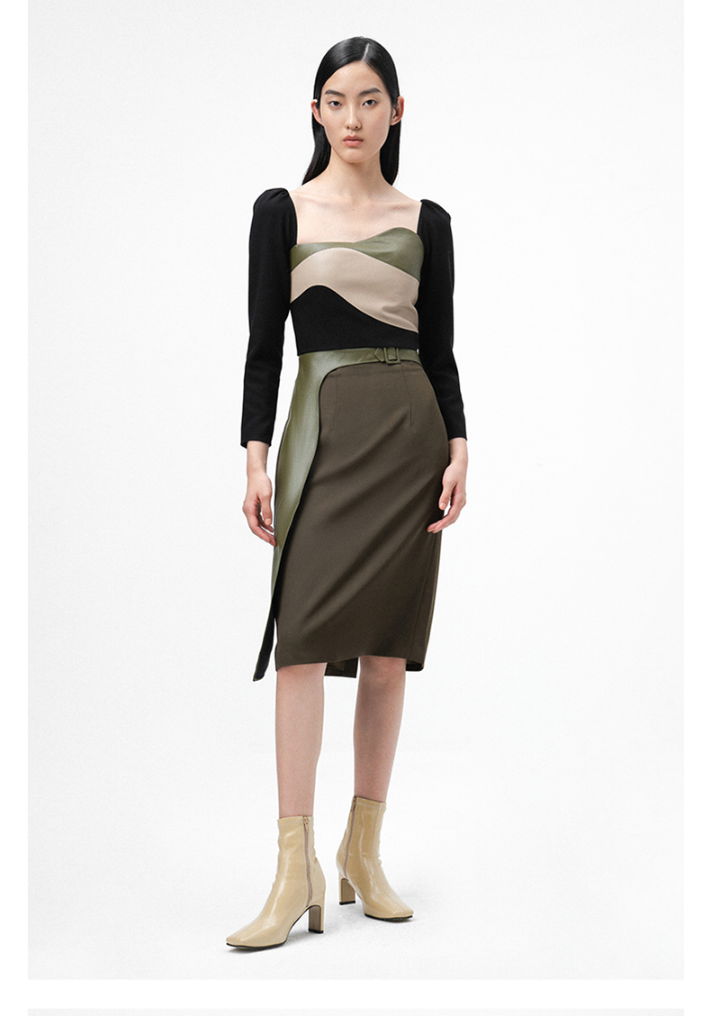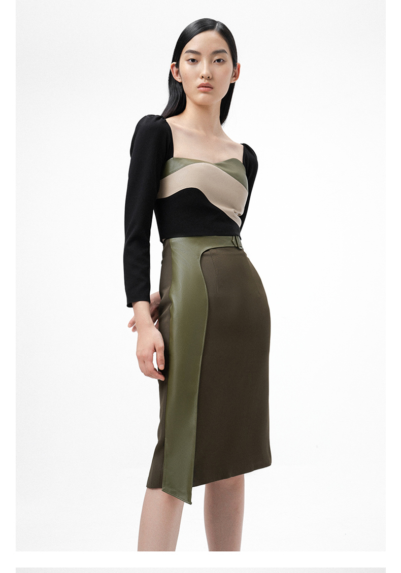 【苔丝】橄榄绿不规则曲线立裁拼皮高腰半裙/000107