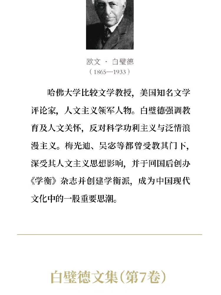欧文•白璧德,美国知名文学评论家,人文主义领军人物,哈佛大学比较文学教授。白璧德强调教育及人文关怀,反对科学功利主义与泛情浪漫主义。梅光迪、吴宓等都曾受教其门下,深受其人文主义思想影响,而于回国后创办《学衡》杂志并创建学衡派,成为中国现代文化中的一股重要思潮。