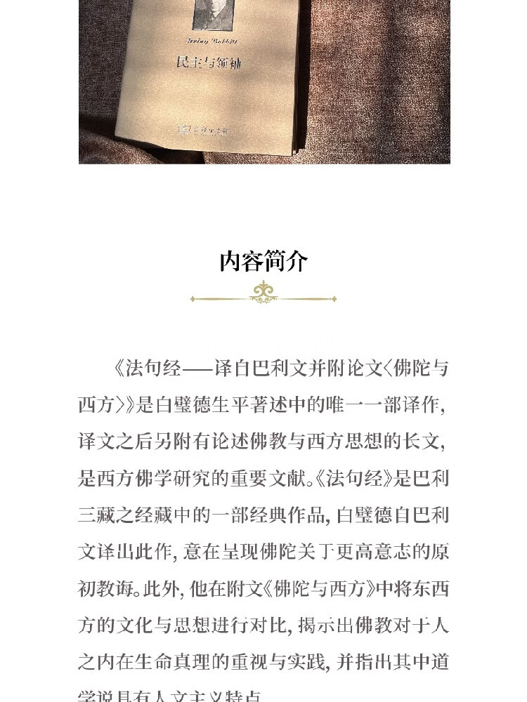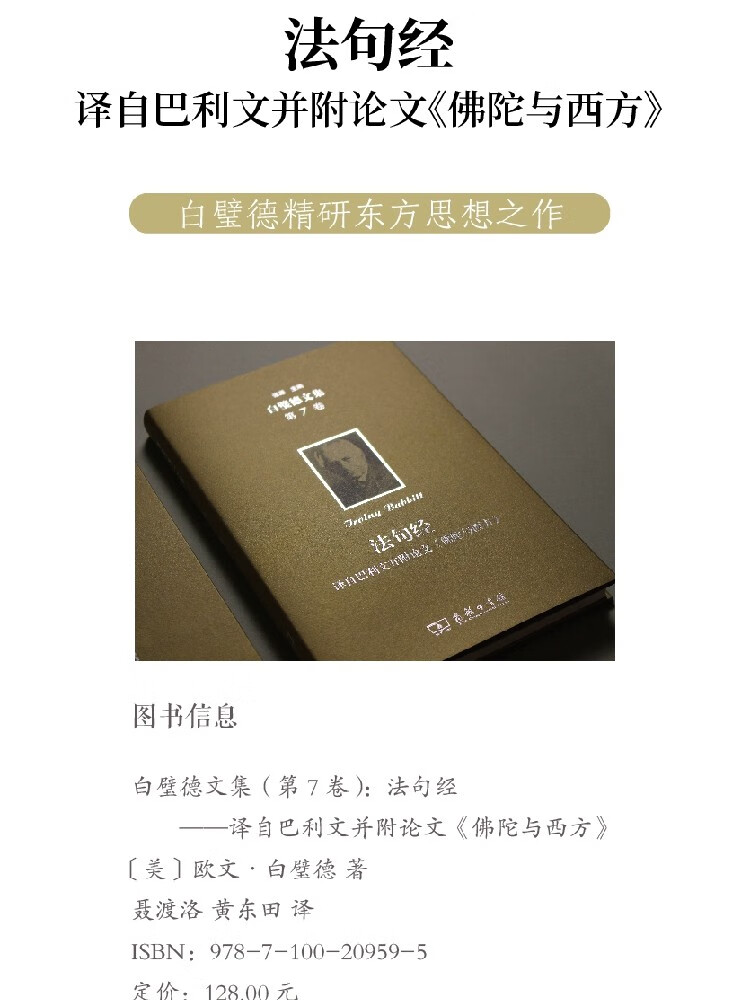 《法句经——译自巴利文并附论文〈佛陀与西方〉》是白璧德生平著述中的唯一一部译作,译文之后另附有论述佛教与西方思想的长文,是西方佛学研究的重要文献。《法句经》是巴利三藏之经藏中的一部经典作品,白璧德自巴利文译出此作,意在呈现佛陀关于更高意志的原初教诲,并在附文《佛陀与西方》中将东西方的文化与思想进行对比,揭示出佛教对于人之内在生命真理的重视与实践,并指出其中道学说具有人文主义特点。