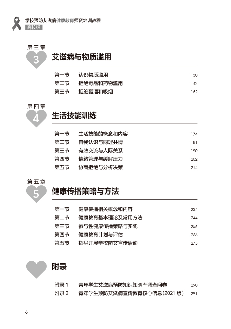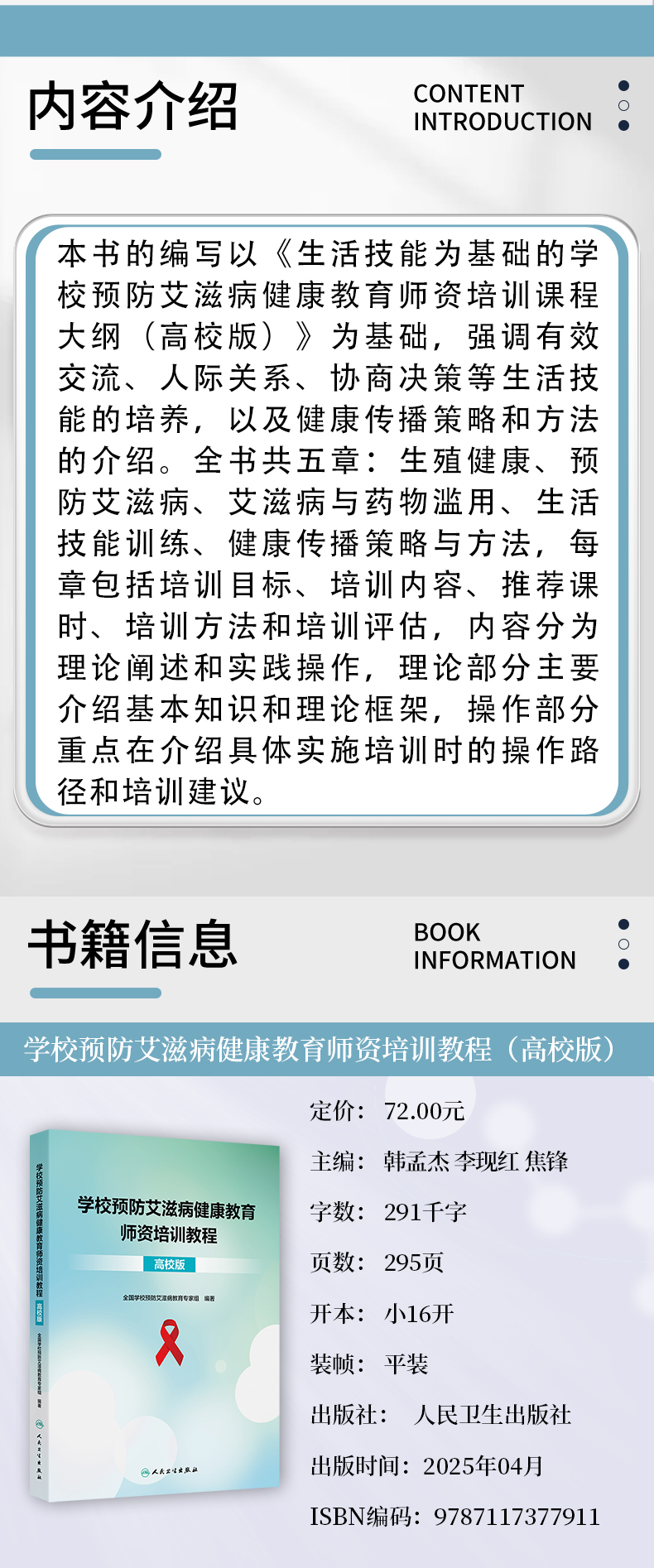 本书的编写以《生活技能为基础的学校预防艾滋病健康教育师资培训课程大纲(高校版)》为基础,强调有效交流、人际关系、协商决策等生活技能的培养,以及健康传播策略和方法的介绍。全书共五章:生殖健康、预防艾滋病、艾滋病与药物滥用、生活技能训练、健康传播策略与方法,每章包括培训目标、培训内容、推荐课时、培训方法和培训评估,内容分为理论阐述和实践操作,理论部分主要介绍基本知识和理论框架,操作部分重点在介绍具体实施培训时的操作路径和培训建议。
