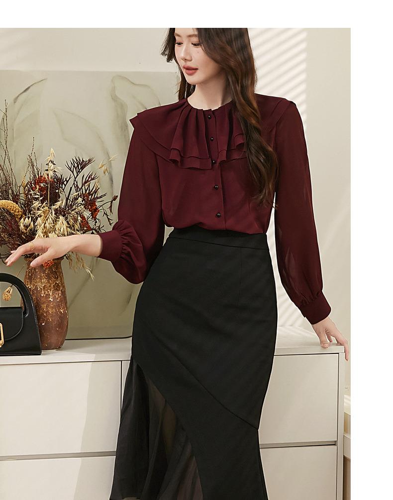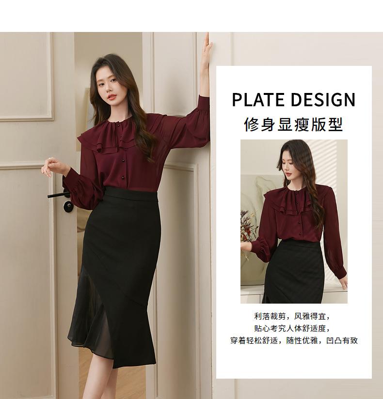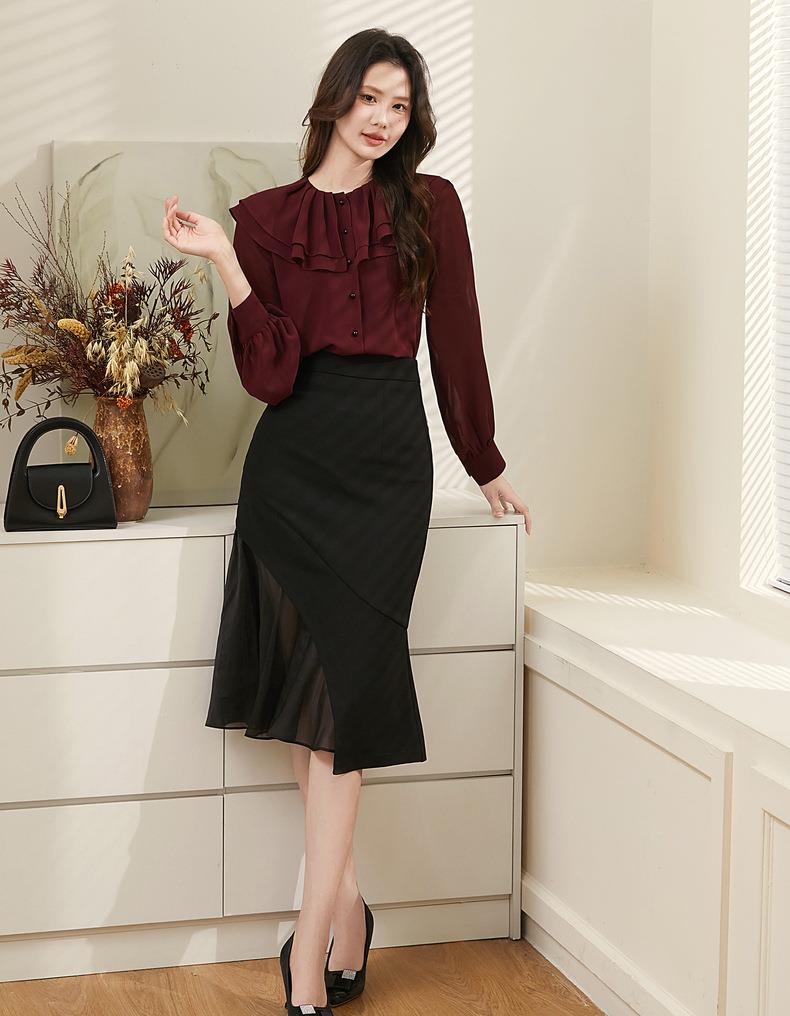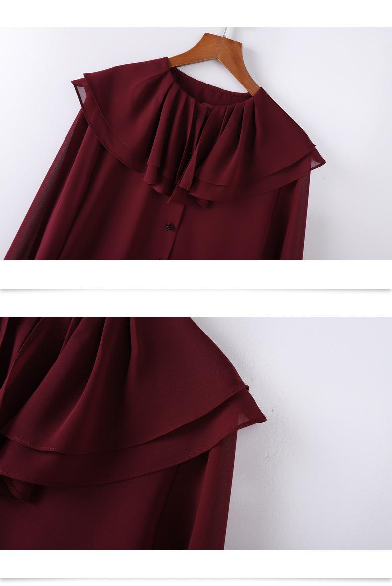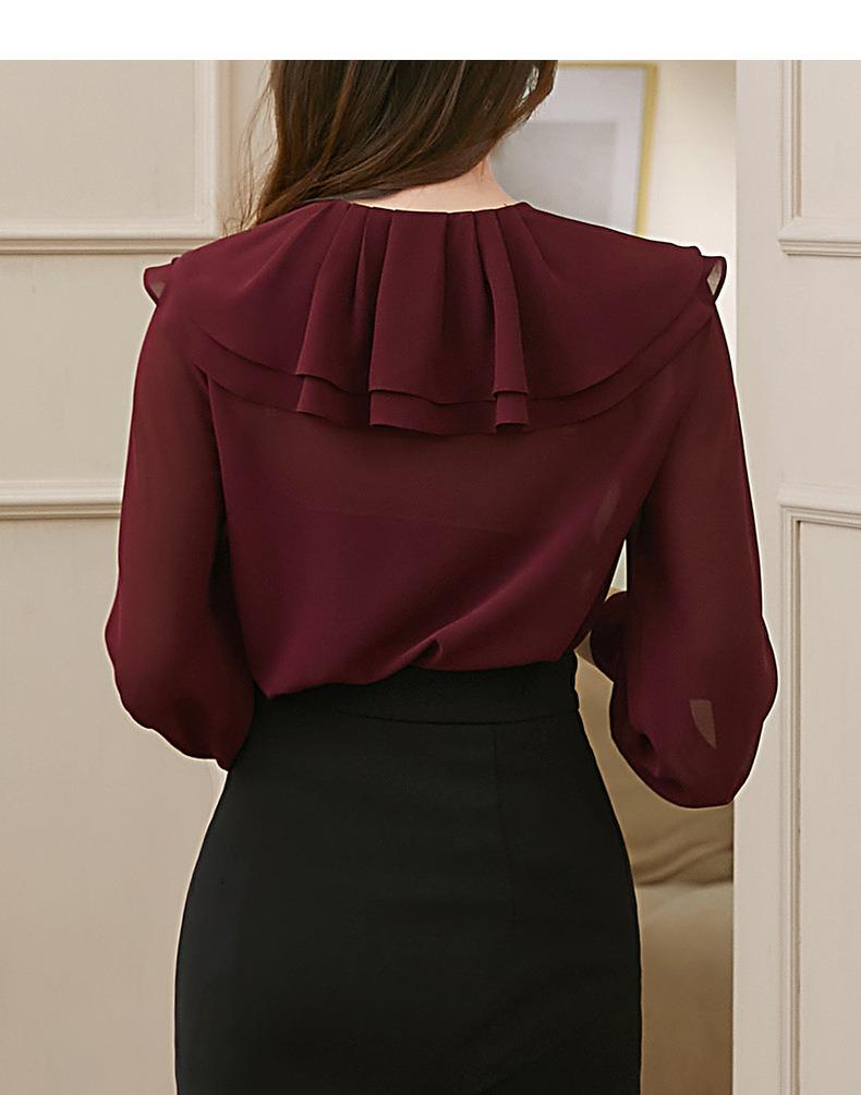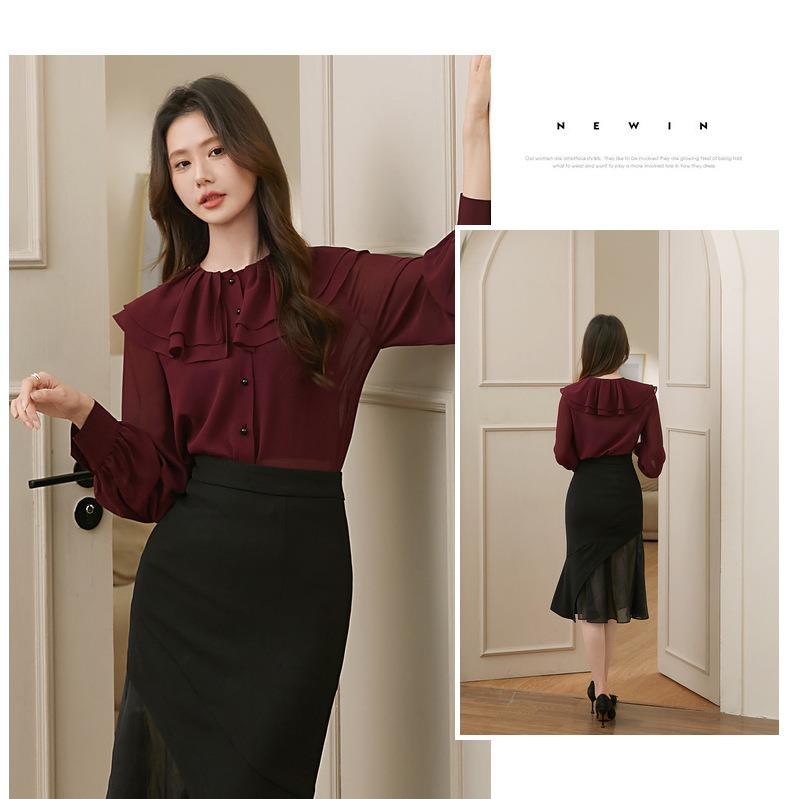 百姿 透视甜美长袖衬衫2023秋季新款气质翻领雪纺衫231303