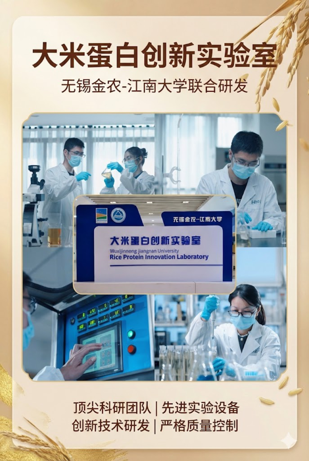 无锡金农与江南大学食品学院专家团队长期合作,专业研发、生产、销售高品质食品级大米蛋白质粉(蛋白质含量>80%)、大米蛋白终端产品,公司拥有先进的大米蛋白粉生产线,