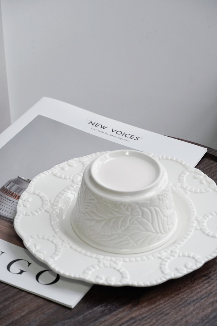 那种磅礴极具史诗感、视觉冲击感的西洋古典建筑外缘 是让人眼花缭乱的繁华高级审美 把这种浮雕设计应用到日常餐具中呢? ◻ 碗外花叶纹理——大概是想象到了凡尔赛宫后花园 ◻ 盘边窗幔雕花——在罗马耶稣会教堂抬头会看到的窗顶