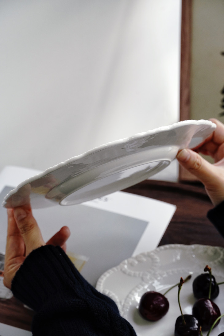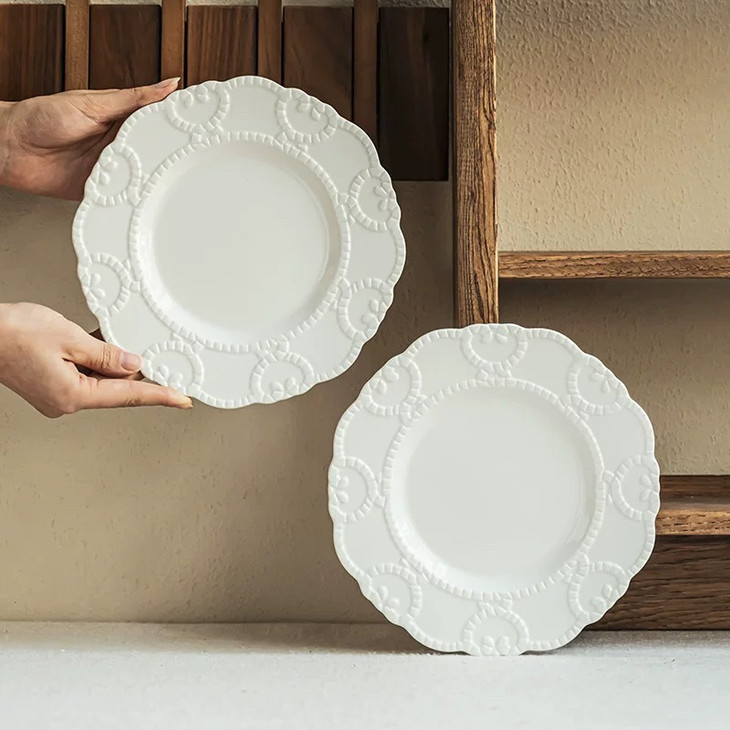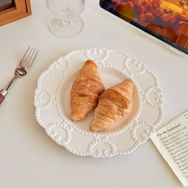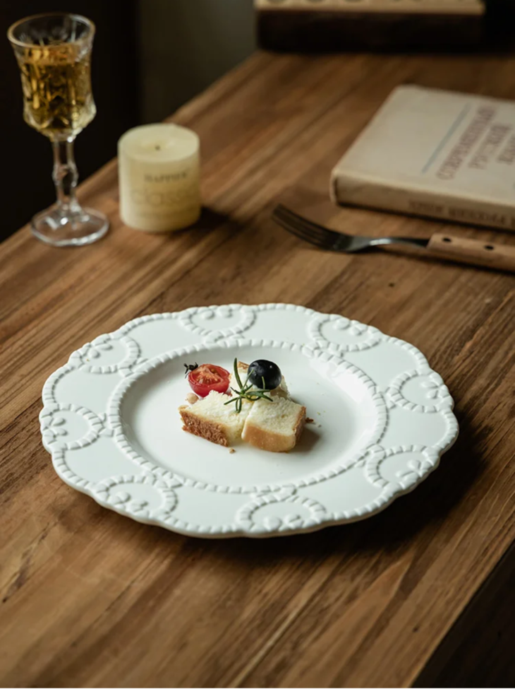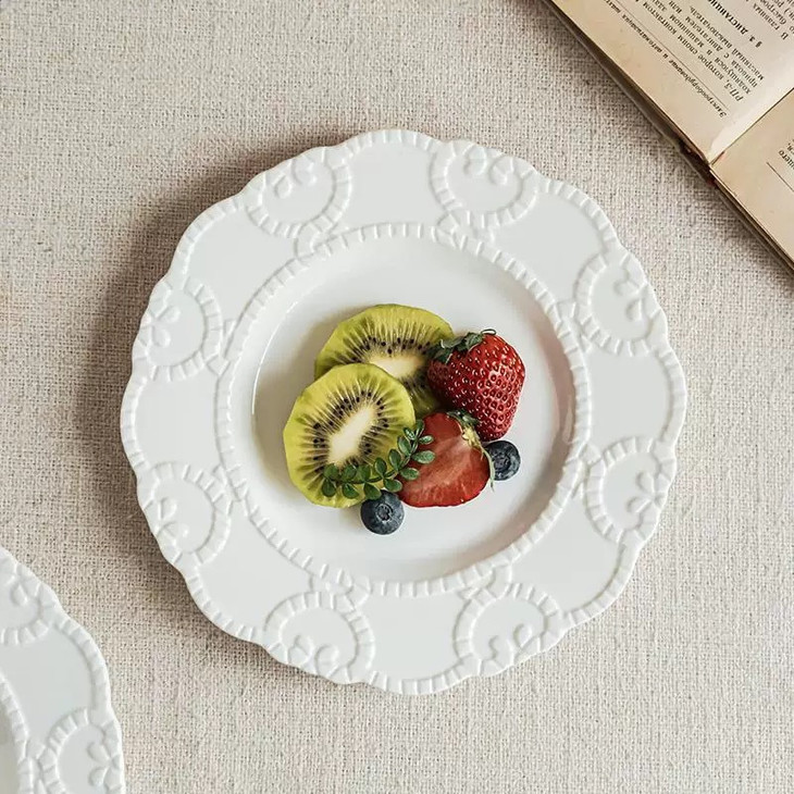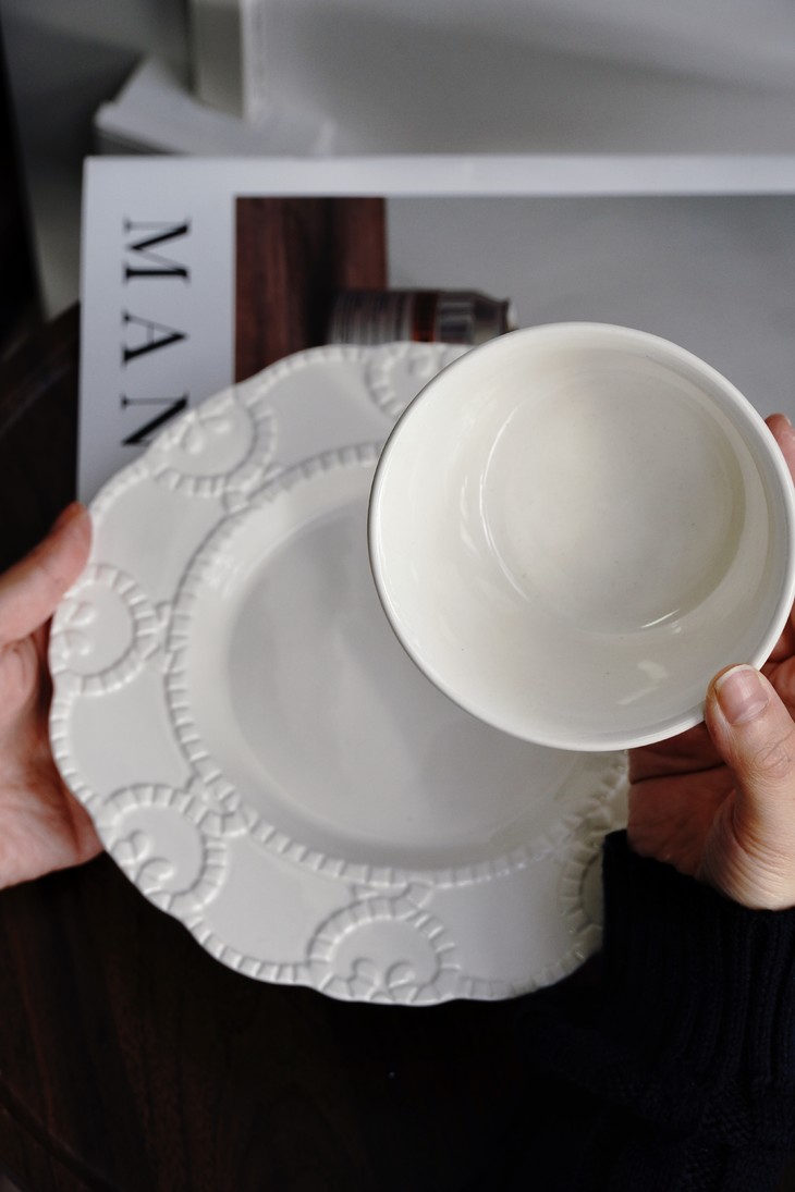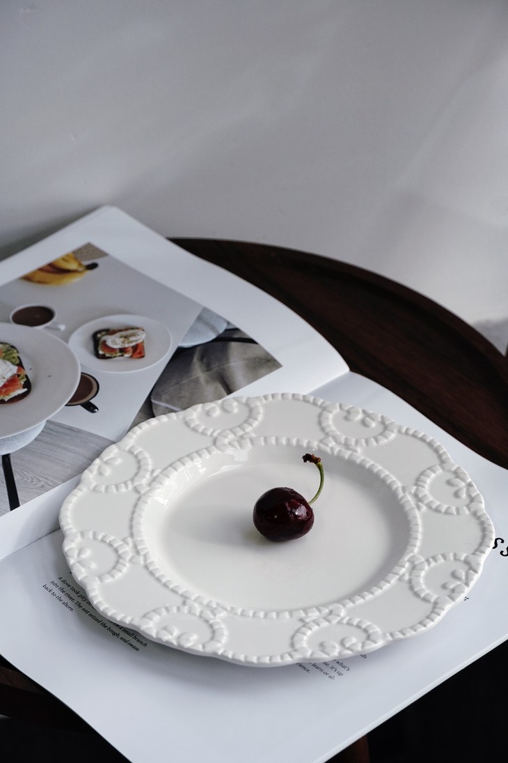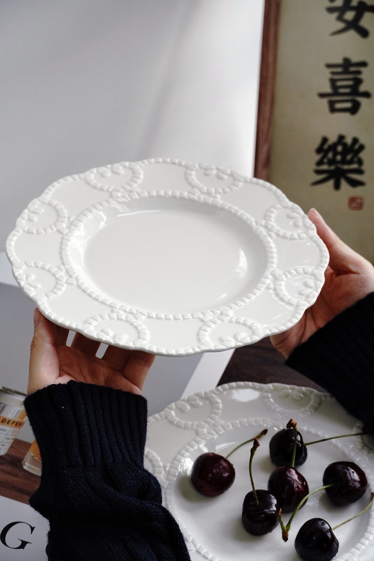 wind白色素盘 精致的浮雕花边设计🎀 尺寸上来说是比我们家常使用可能稍小一些的餐具 但很实用! 早餐、单人餐、下午茶 煎蛋、三明治、果盘 都刚刚好