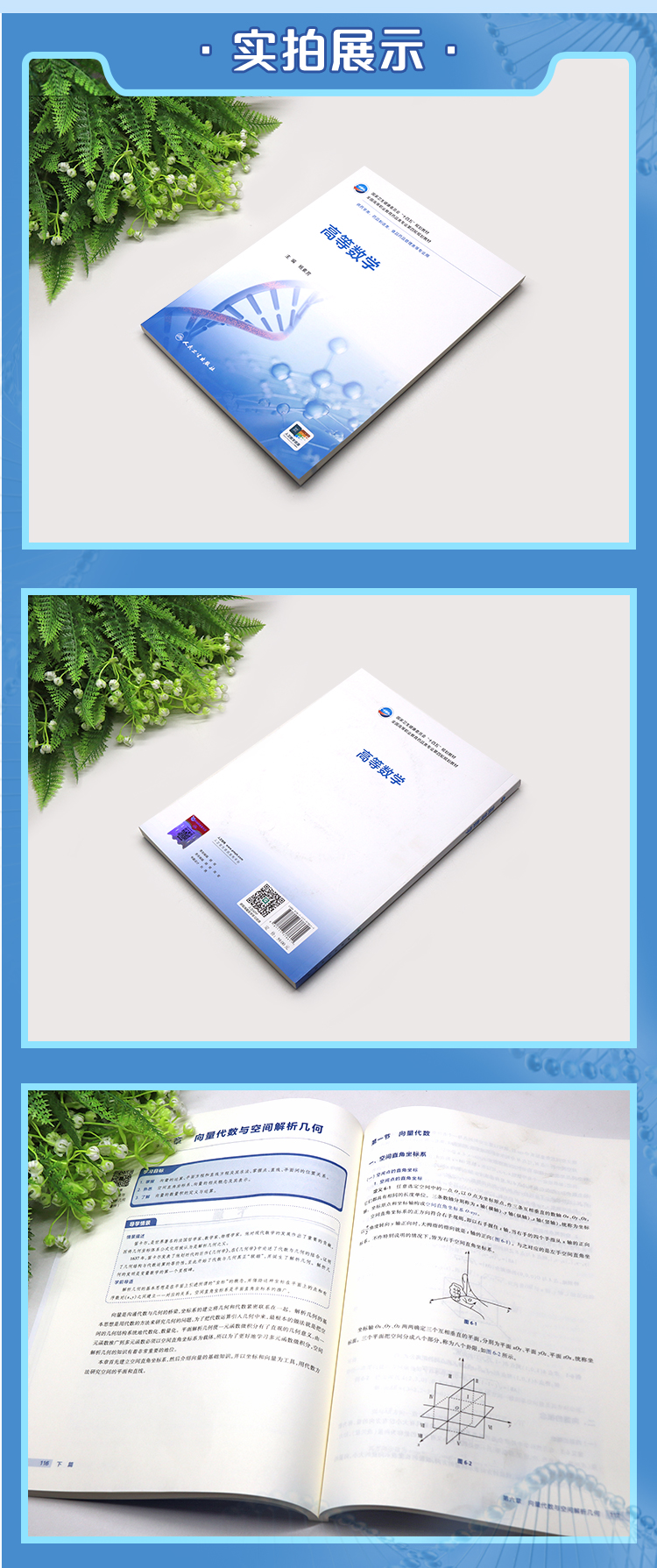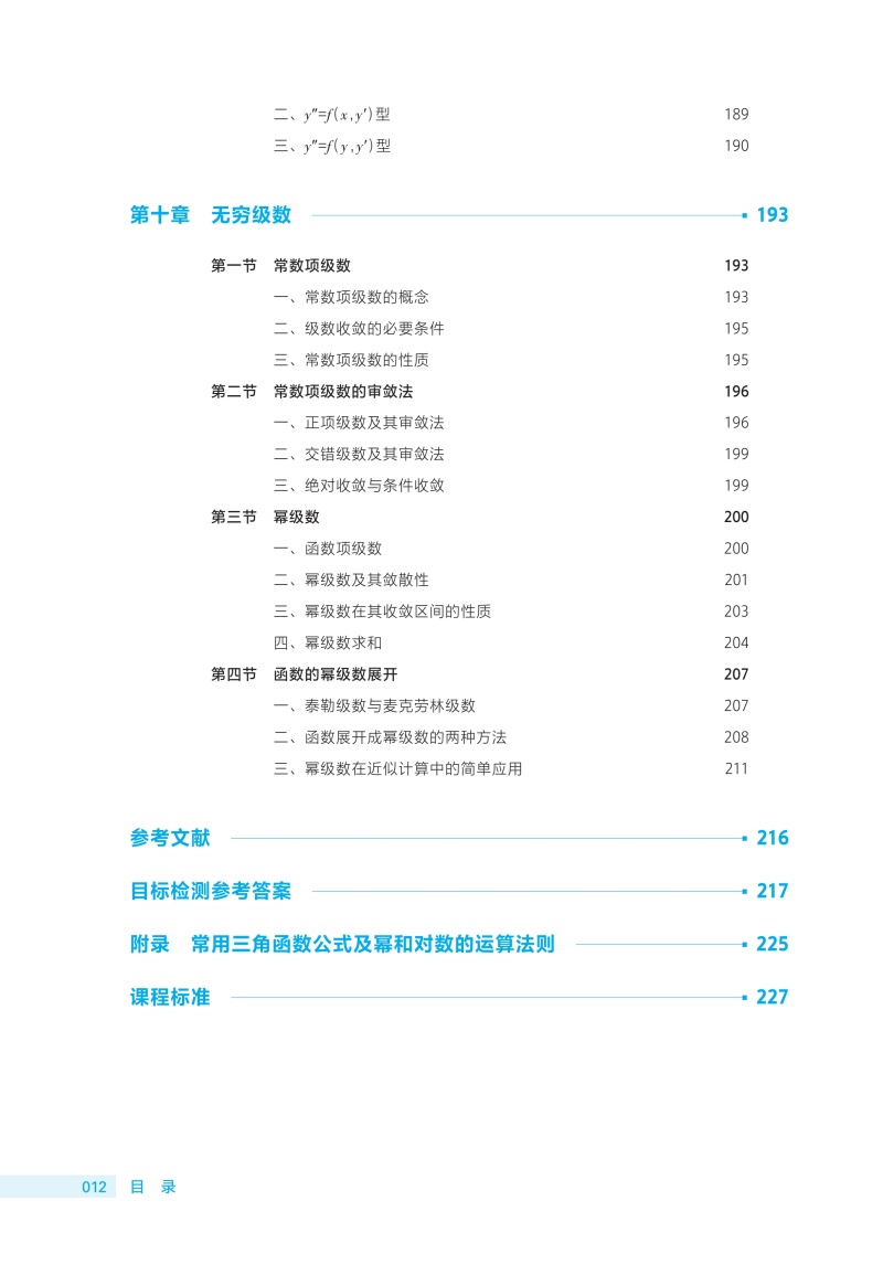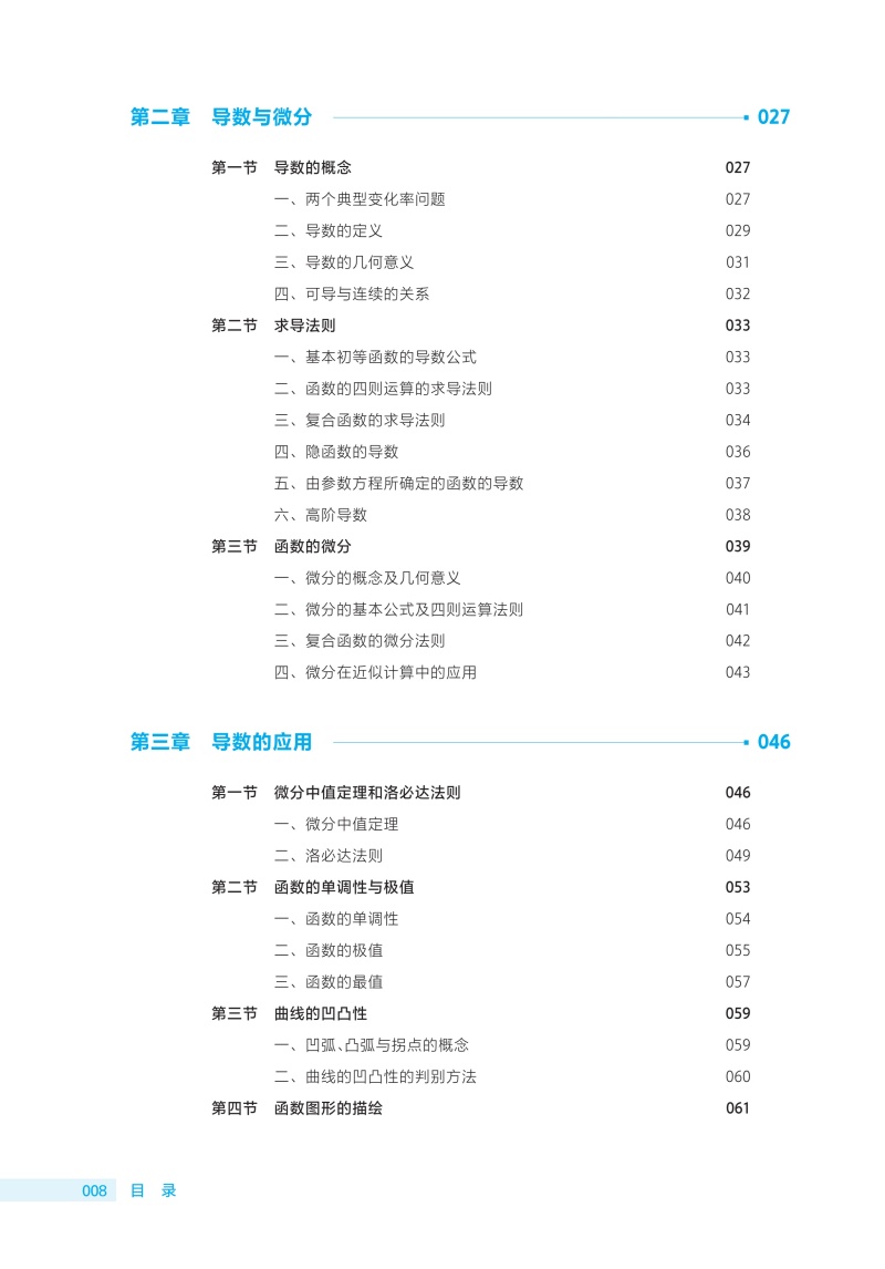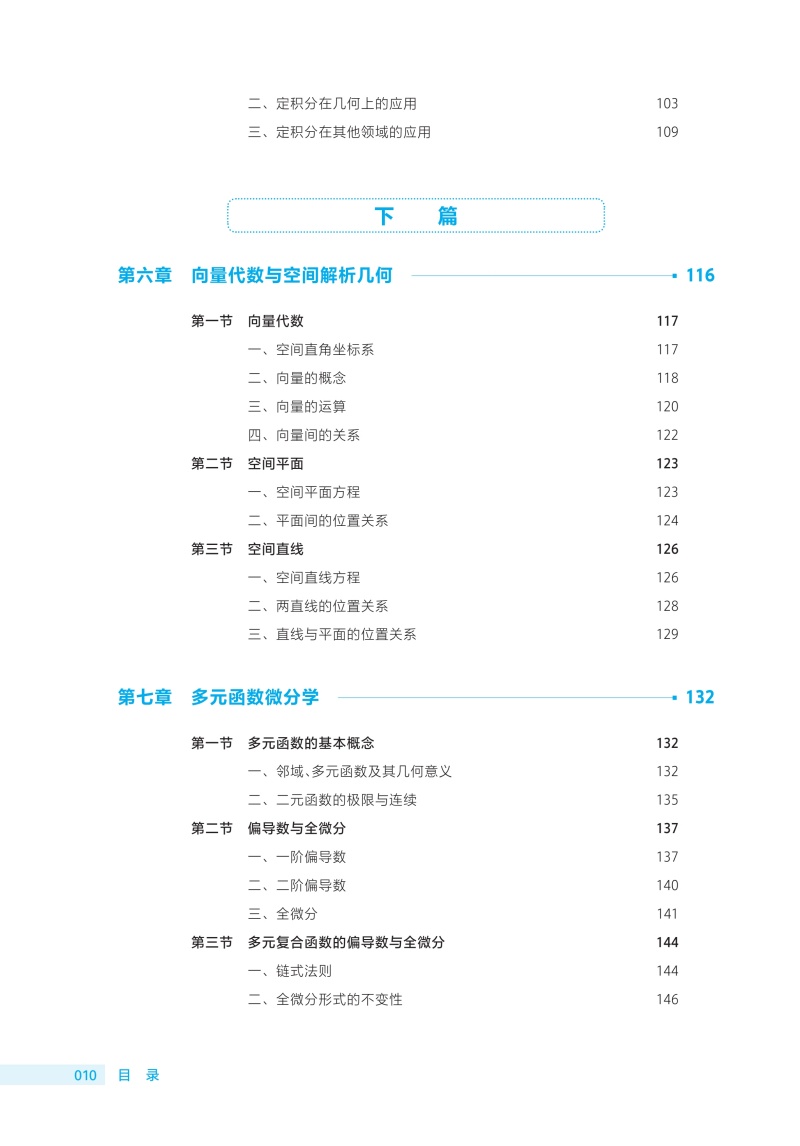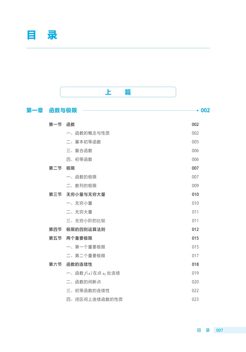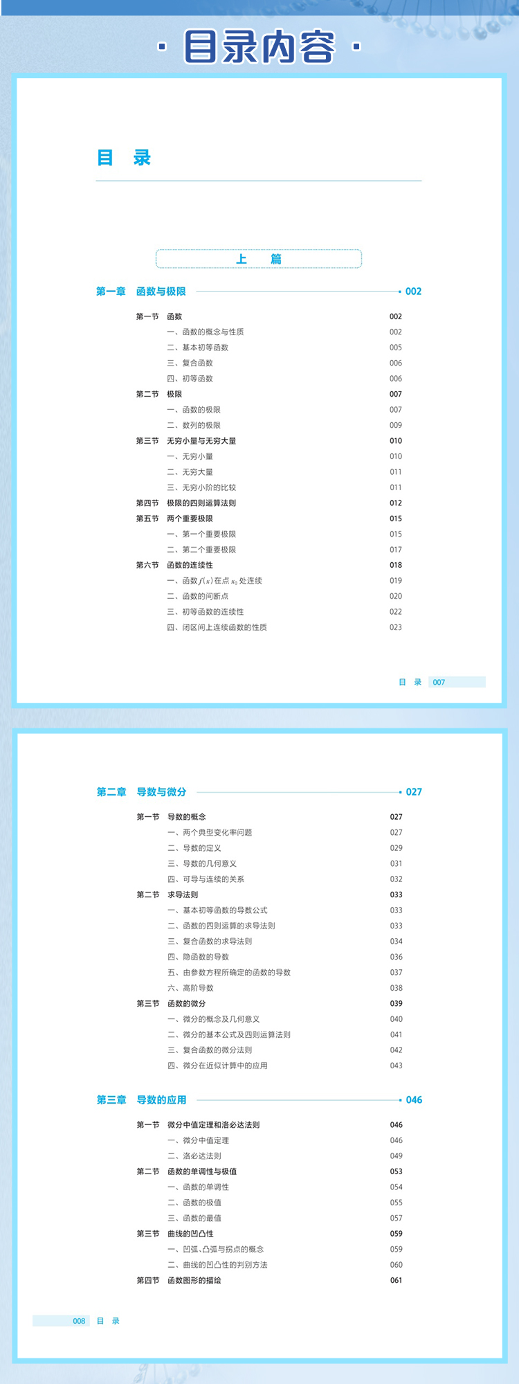 上篇 第一章函数与极限/2 第一节函数/2 一、函数的概念与性质/2 二、基本初等函数/5 三、复合函数/6 四、初等函数/6 第二节极限/7 一、函数的极限/7 二、数列的极限/9 第三节无穷小量与无穷大量/10 一、无穷小量/10 二、无穷大量/11 三、无穷小阶的比较/11 第四节极限的四则运算法则/12 第五节两个重要极限/15 一、第一个重要极限/15 二、第二个重要极限/17 第六节函数的连续性/18 一、函数f(x)在点x0处连续/19 二、函数的间断点/20 三、初等函数的连续性/22 四、闭区间上连续函数的性质/23 第二章导数与微分/27 第一节导数的概念/27 一、两个典型变化率问题/27 二、导数的定义/29 三、导数的几何意义/31 四、可导与连续的关系/32 第二节求导法则/33 一、基本初等函数的导数公式/33 二、函数的四则运算的求导法则/33 三、复合函数的求导法则/34 四、隐函数的导数/36 五、由参数方程所确定的函数的导数/37 六、高阶导数/38 第三节函数的微分/39 一、微分的概念及几何意义/40 二、微分的基本公式及四则运算法则/41 三、复合函数的微分法则/42 四、微分在近似计算中的应用/43 第三章导数的应用/46 第一节微分中值定理和洛必达法则/46 一、微分中值定理/46 二、洛必达法则/49 第二节函数的单调性与极值/53 一、函数的单调性/54 二、函数的极值/55 三、函数的最值/57 第三节曲线的凹凸性/59 一、凹弧、凸弧与拐点的概念/59 二、曲线的凹凸性的判别方法/60 第四节函数图形的描绘/61 一、曲线的渐近线/61 二、用导数作函数图形的一般步骤/62 第四章不定积分/66 第一节不定积分的概念/67 一、原函数与不定积分/67 二、基本积分公式/69 三、不定积分的性质和运算法则/70 第二节求不定积分的方法/72 一、直接积分法/72 二、第一换元积分法/74 三、第二换元积分法/78 四、分部积分法/81 第五章定积分及其应用/86 第一节定积分的概念与性质/86 一、定积分的概念/86 二、定积分的性质/91 第二节微积分学基本定理/93 一、变上限积分/93 二、微积分基本公式/94 第三节定积分的积分法/96 一、直接积分法/96 二、换元积分法/97 三、分部积分法/98 第四节广义积分/99 一、无穷区间上的广义积分/99 二、无界函数的广义积分——瑕积分/101 第五节定积分的应用/103 一、微元法/103 二、定积分在几何上的应用/103 三、定积分在其他领域的应用/109 下篇 第六章向量代数与空间解析几何/116 第一节向量代数/117 一、空间直角坐标系/117 二、向量的概念/118 三、向量的运算/120 四、向量间的关系/122 第二节空间平面/123 一、空间平面方程/123 二、平面间的位置关系/124 第三节空间直线/126 一、空间直线方程/126 二、两直线的位置关系/128 三、直线与平面的位置关系/129 第七章多元函数微分学/132 第一节多元函数的基本概念/132 一、邻域、多元函数及其几何意义/132 二、二元函数的极限与连续/135 第二节偏导数与全微分/137 一、一阶偏导数/137 二、二阶偏导数/140 三、全微分/141 第三节多元复合函数的偏导数与全微分/144 一、链式法则/144 二、全微分形式的不变性/146 三、复合函数的二阶偏导数/147 第四节隐函数的偏导数与全微分/148 一、一元隐函数的导数/148 二、二元隐函数的偏导数与全微分/149 第五节多元函数的极值/150 一、二元函数极值的概念/150 二、二元函数的无条件极值/150 第八章二重积分/154 第一节二重积分的概念与性质/154 一、二重积分的概念/154 二、二重积分的性质/157 第二节二重积分的计算/158 一、直角坐标系下二重积分的计算/158 二、极坐标系下二重积分的计算/164 第九章微分方程/170 第一节微分方程的概念和解/170 一、引例/170 二、微分方程的概念/172 三、微分方程的解/172 第二节一阶微分方程/173 一、可分离变量的微分方程/173 二、齐次微分方程/176 三、一阶线性微分方程/178 第三节二阶线性微分方程/181 一、二阶线性微分方程通解的结构/182 二、二阶常系数线性齐次微分方程/183 三、二阶常系数线性非齐次微分方程/186 第四节可降阶的高阶微分方程/188 一、y(n)=f(x)型/189 二、y″=f(x,y′)型/189 三、y″=f(y,y′)型/190 第十章无穷级数/193 第一节常数项级数/193 一、常数项级数的概念/193 二、级数收敛的必要条件/195 三、常数项级数的性质/195 第二节常数项级数的审敛法/196 一、正项级数及其审敛法/196 二、交错级数及其审敛法/199 三、绝对收敛与条件收敛/199 第三节幂级数/200 一、函数项级数/200 二、幂级数及其敛散性/201 三、幂级数在其收敛区间的性质/203 四、幂级数求和/204 第四节函数的幂级数展开/207 一、泰勒级数与麦克劳林级数/207 二、函数展开成幂级数的两种方法/208 三、幂级数在近似计算中的简单应用/211 参考文献/216 目标检测参考答案/217 附录常用三角函数公式及幂和对数的运算法则/225 课程标准/227