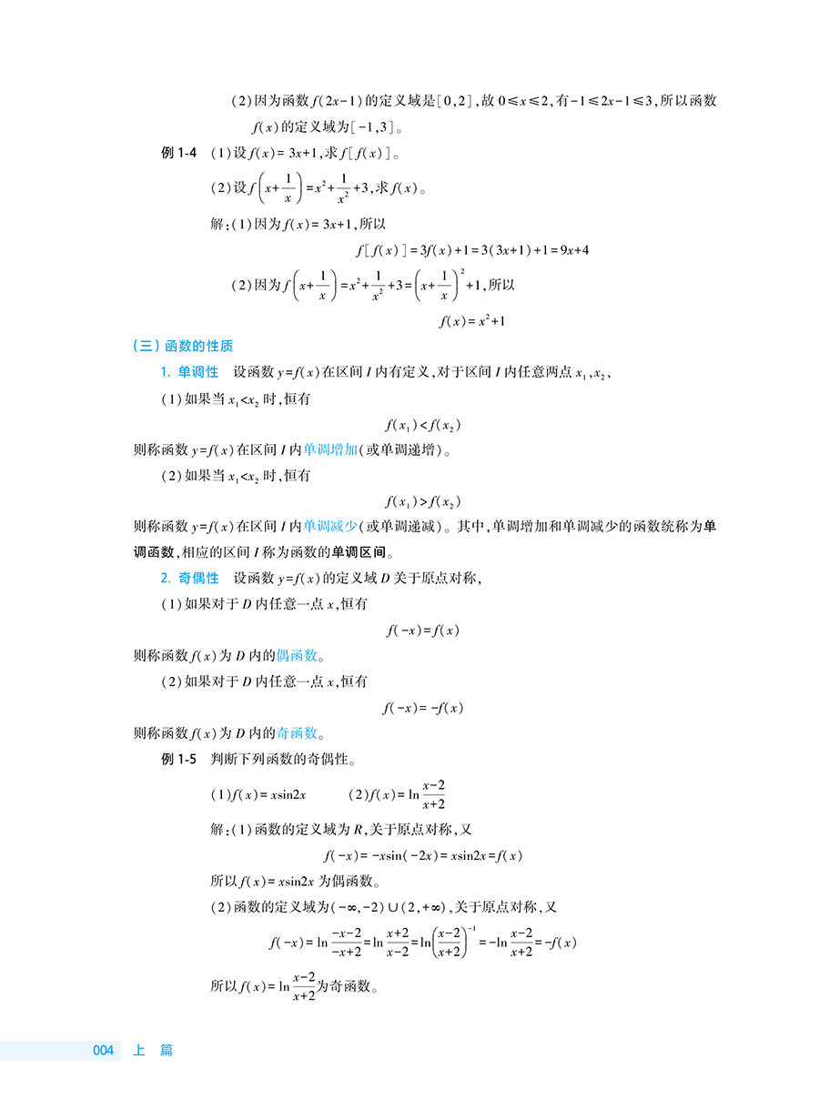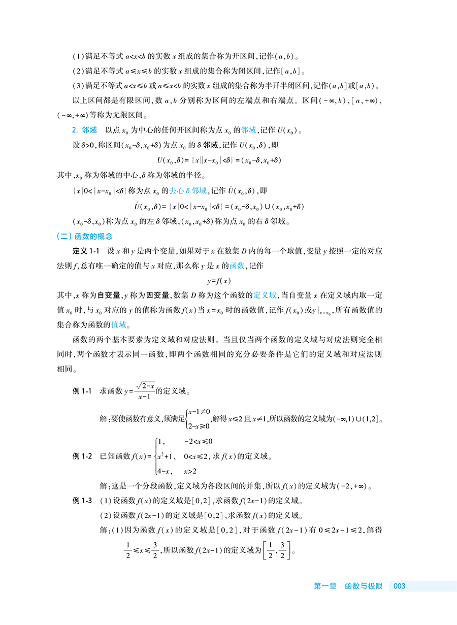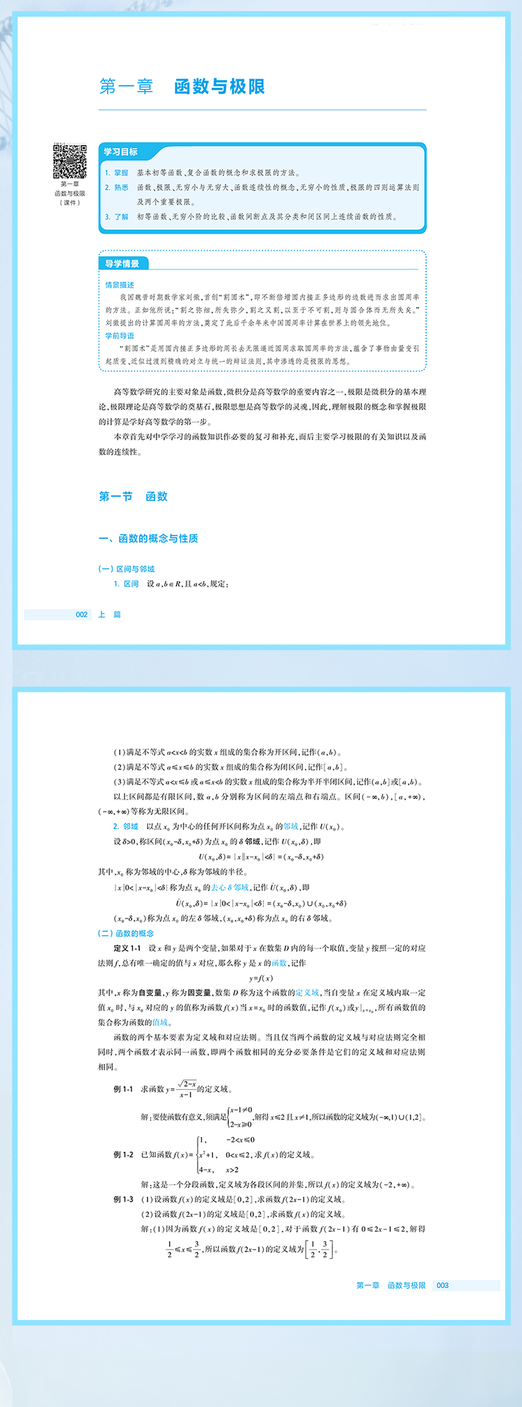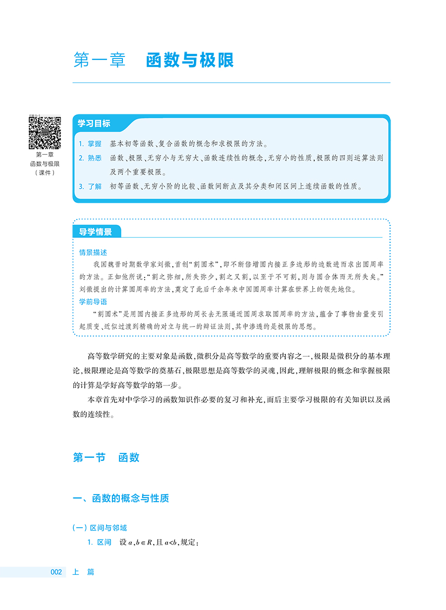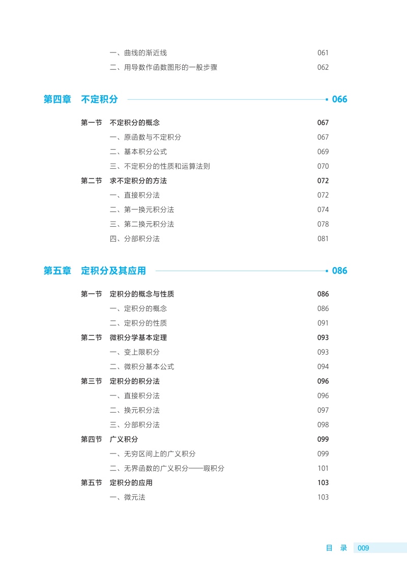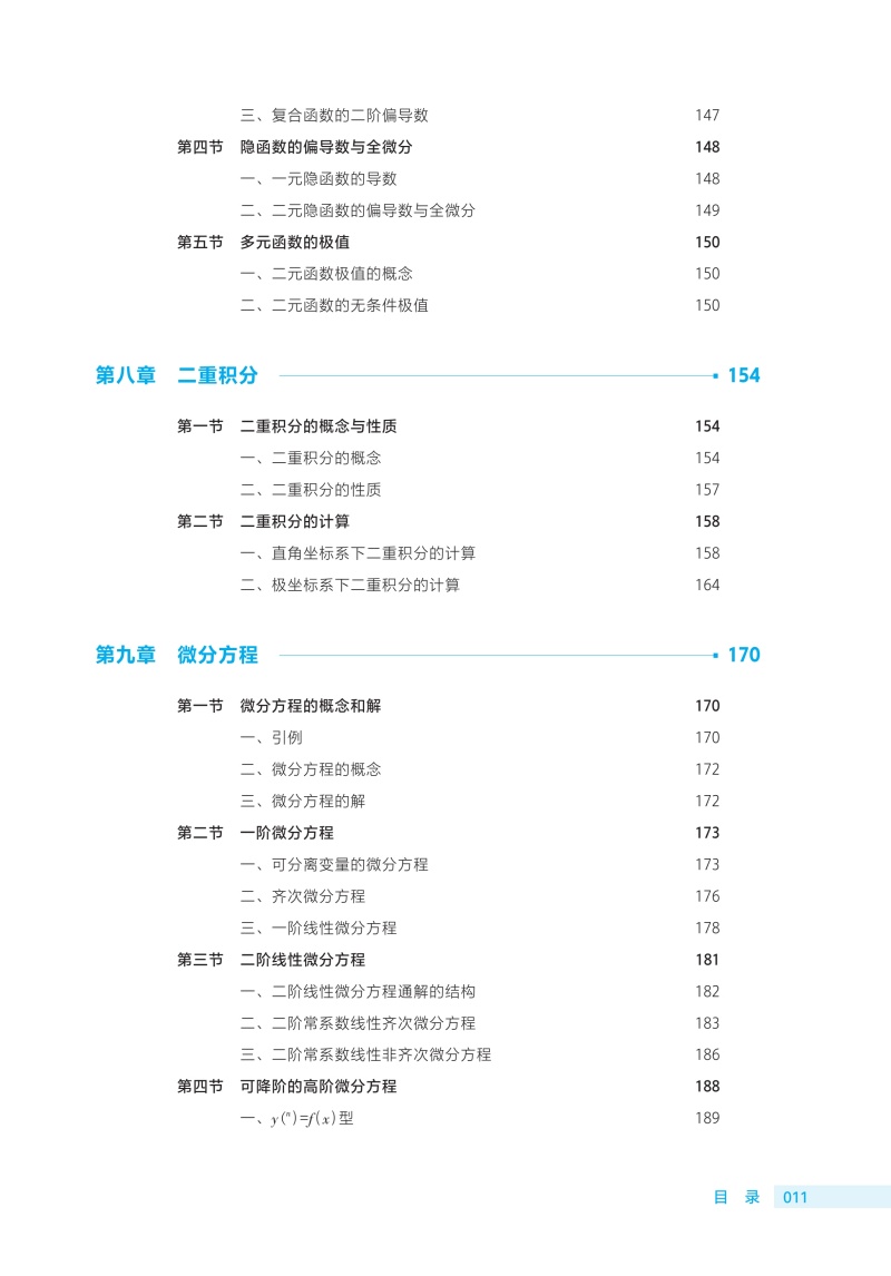 上篇 第一章函数与极限/2 第一节函数/2 一、函数的概念与性质/2 二、基本初等函数/5 三、复合函数/6 四、初等函数/6 第二节极限/7 一、函数的极限/7 二、数列的极限/9 第三节无穷小量与无穷大量/10 一、无穷小量/10 二、无穷大量/11 三、无穷小阶的比较/11 第四节极限的四则运算法则/12 第五节两个重要极限/15 一、第一个重要极限/15 二、第二个重要极限/17 第六节函数的连续性/18 一、函数f(x)在点x0处连续/19 二、函数的间断点/20 三、初等函数的连续性/22 四、闭区间上连续函数的性质/23 第二章导数与微分/27 第一节导数的概念/27 一、两个典型变化率问题/27 二、导数的定义/29 三、导数的几何意义/31 四、可导与连续的关系/32 第二节求导法则/33 一、基本初等函数的导数公式/33 二、函数的四则运算的求导法则/33 三、复合函数的求导法则/34 四、隐函数的导数/36 五、由参数方程所确定的函数的导数/37 六、高阶导数/38 第三节函数的微分/39 一、微分的概念及几何意义/40 二、微分的基本公式及四则运算法则/41 三、复合函数的微分法则/42 四、微分在近似计算中的应用/43 第三章导数的应用/46 第一节微分中值定理和洛必达法则/46 一、微分中值定理/46 二、洛必达法则/49 第二节函数的单调性与极值/53 一、函数的单调性/54 二、函数的极值/55 三、函数的最值/57 第三节曲线的凹凸性/59 一、凹弧、凸弧与拐点的概念/59 二、曲线的凹凸性的判别方法/60 第四节函数图形的描绘/61 一、曲线的渐近线/61 二、用导数作函数图形的一般步骤/62 第四章不定积分/66 第一节不定积分的概念/67 一、原函数与不定积分/67 二、基本积分公式/69 三、不定积分的性质和运算法则/70 第二节求不定积分的方法/72 一、直接积分法/72 二、第一换元积分法/74 三、第二换元积分法/78 四、分部积分法/81 第五章定积分及其应用/86 第一节定积分的概念与性质/86 一、定积分的概念/86 二、定积分的性质/91 第二节微积分学基本定理/93 一、变上限积分/93 二、微积分基本公式/94 第三节定积分的积分法/96 一、直接积分法/96 二、换元积分法/97 三、分部积分法/98 第四节广义积分/99 一、无穷区间上的广义积分/99 二、无界函数的广义积分——瑕积分/101 第五节定积分的应用/103 一、微元法/103 二、定积分在几何上的应用/103 三、定积分在其他领域的应用/109 下篇 第六章向量代数与空间解析几何/116 第一节向量代数/117 一、空间直角坐标系/117 二、向量的概念/118 三、向量的运算/120 四、向量间的关系/122 第二节空间平面/123 一、空间平面方程/123 二、平面间的位置关系/124 第三节空间直线/126 一、空间直线方程/126 二、两直线的位置关系/128 三、直线与平面的位置关系/129 第七章多元函数微分学/132 第一节多元函数的基本概念/132 一、邻域、多元函数及其几何意义/132 二、二元函数的极限与连续/135 第二节偏导数与全微分/137 一、一阶偏导数/137 二、二阶偏导数/140 三、全微分/141 第三节多元复合函数的偏导数与全微分/144 一、链式法则/144 二、全微分形式的不变性/146 三、复合函数的二阶偏导数/147 第四节隐函数的偏导数与全微分/148 一、一元隐函数的导数/148 二、二元隐函数的偏导数与全微分/149 第五节多元函数的极值/150 一、二元函数极值的概念/150 二、二元函数的无条件极值/150 第八章二重积分/154 第一节二重积分的概念与性质/154 一、二重积分的概念/154 二、二重积分的性质/157 第二节二重积分的计算/158 一、直角坐标系下二重积分的计算/158 二、极坐标系下二重积分的计算/164 第九章微分方程/170 第一节微分方程的概念和解/170 一、引例/170 二、微分方程的概念/172 三、微分方程的解/172 第二节一阶微分方程/173 一、可分离变量的微分方程/173 二、齐次微分方程/176 三、一阶线性微分方程/178 第三节二阶线性微分方程/181 一、二阶线性微分方程通解的结构/182 二、二阶常系数线性齐次微分方程/183 三、二阶常系数线性非齐次微分方程/186 第四节可降阶的高阶微分方程/188 一、y(n)=f(x)型/189 二、y″=f(x,y′)型/189 三、y″=f(y,y′)型/190 第十章无穷级数/193 第一节常数项级数/193 一、常数项级数的概念/193 二、级数收敛的必要条件/195 三、常数项级数的性质/195 第二节常数项级数的审敛法/196 一、正项级数及其审敛法/196 二、交错级数及其审敛法/199 三、绝对收敛与条件收敛/199 第三节幂级数/200 一、函数项级数/200 二、幂级数及其敛散性/201 三、幂级数在其收敛区间的性质/203 四、幂级数求和/204 第四节函数的幂级数展开/207 一、泰勒级数与麦克劳林级数/207 二、函数展开成幂级数的两种方法/208 三、幂级数在近似计算中的简单应用/211 参考文献/216 目标检测参考答案/217 附录常用三角函数公式及幂和对数的运算法则/225 课程标准/227