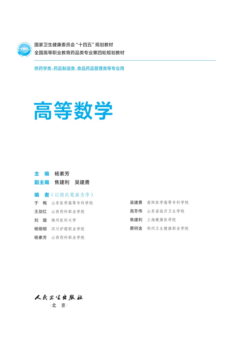 高等数学 十四五规划教材 全国高等职业教育药品类专业第四轮规划教材 杨素芳 供药学 食品药品管理类等专业用 人民卫生出版社