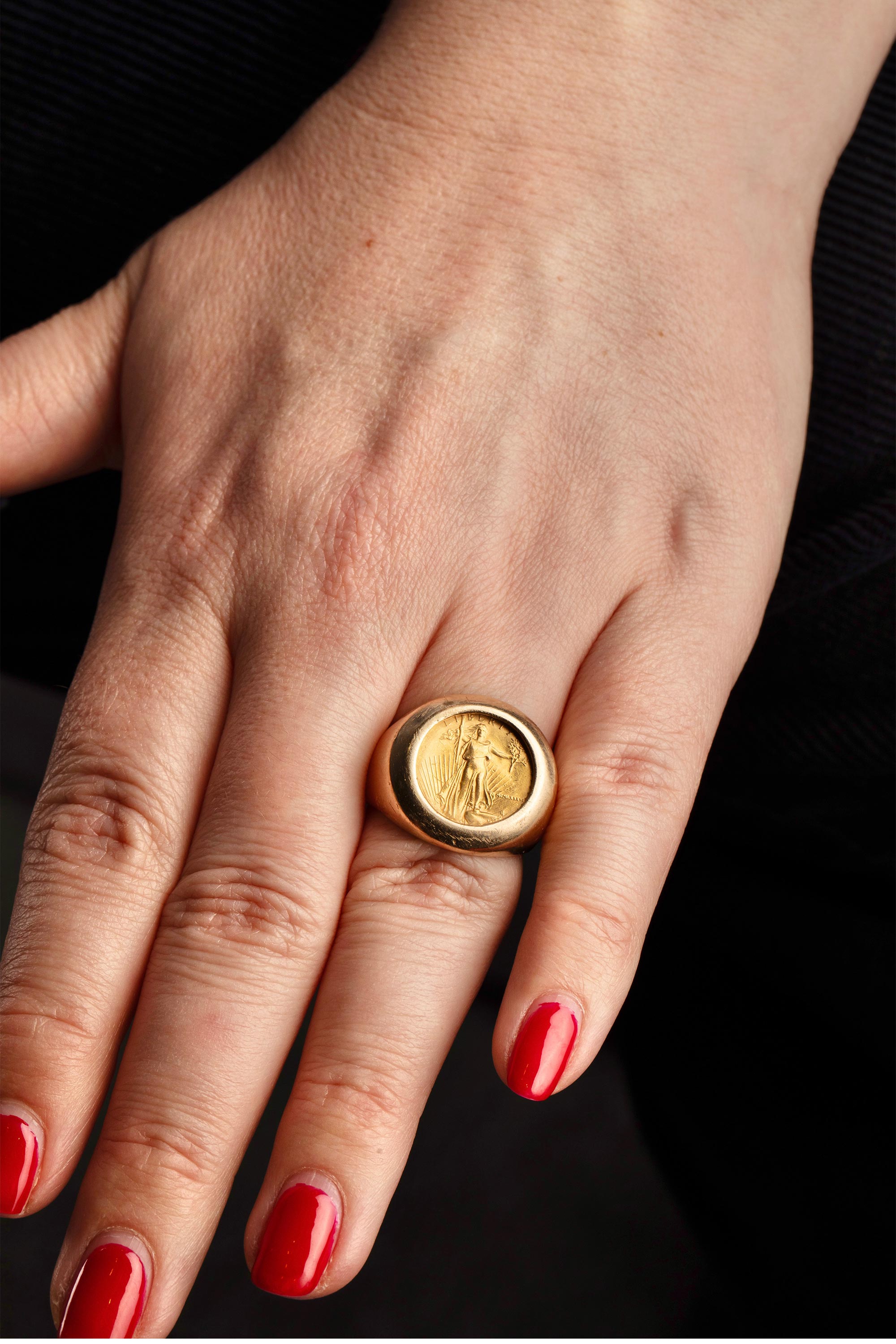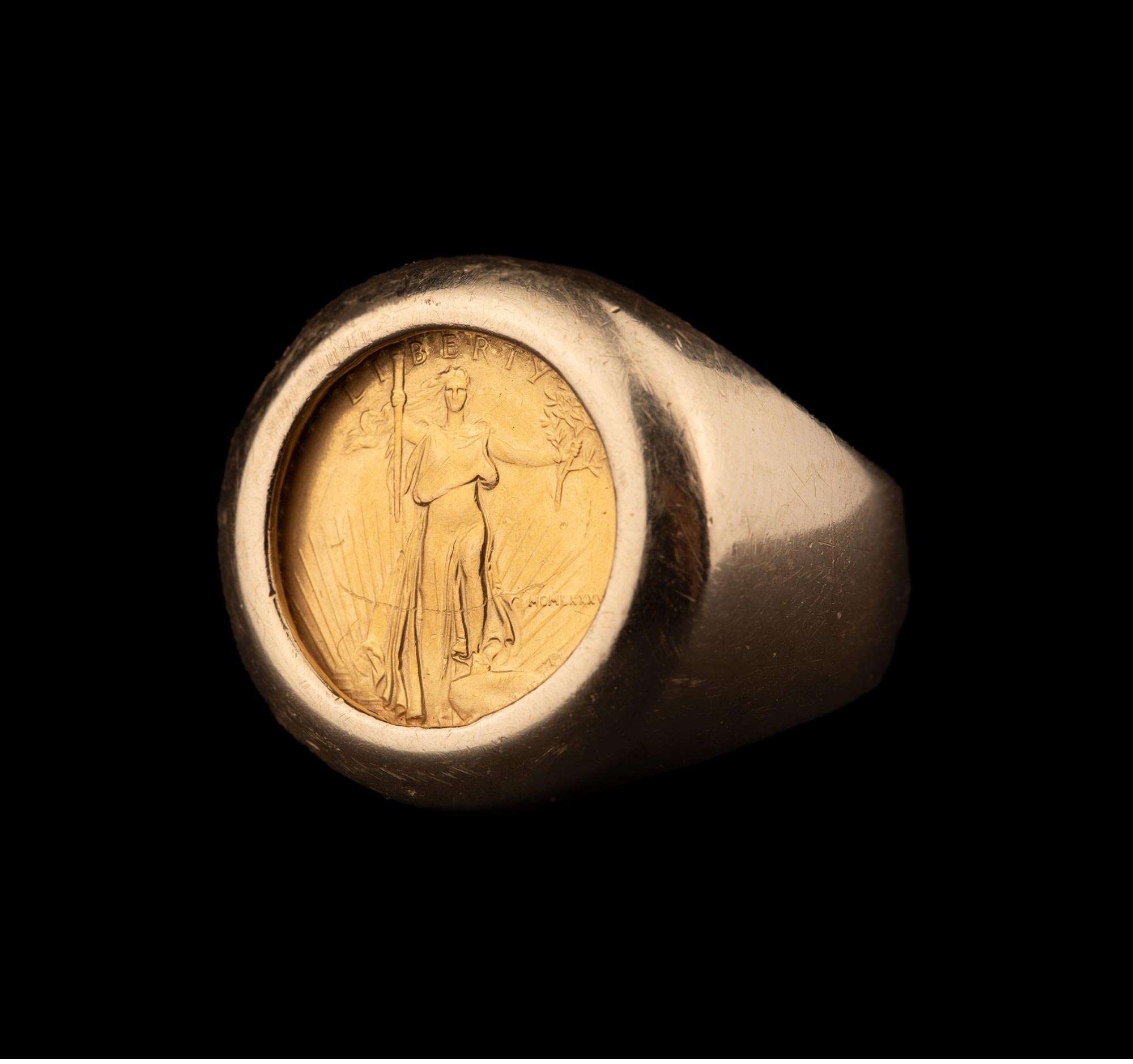1980年代美国出品14K黄金戒托镶嵌圣高登斯主题鹰扬金币戒指