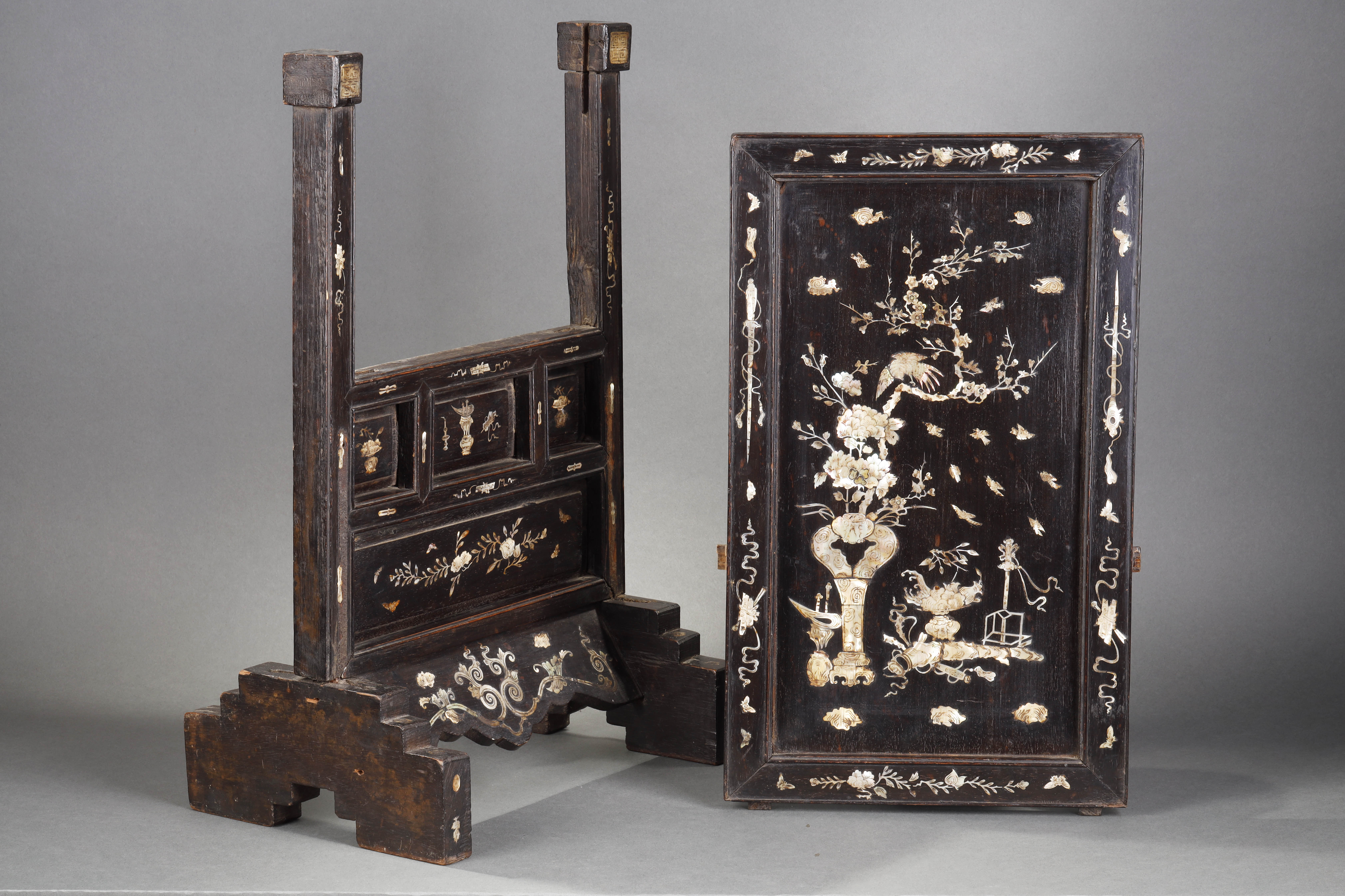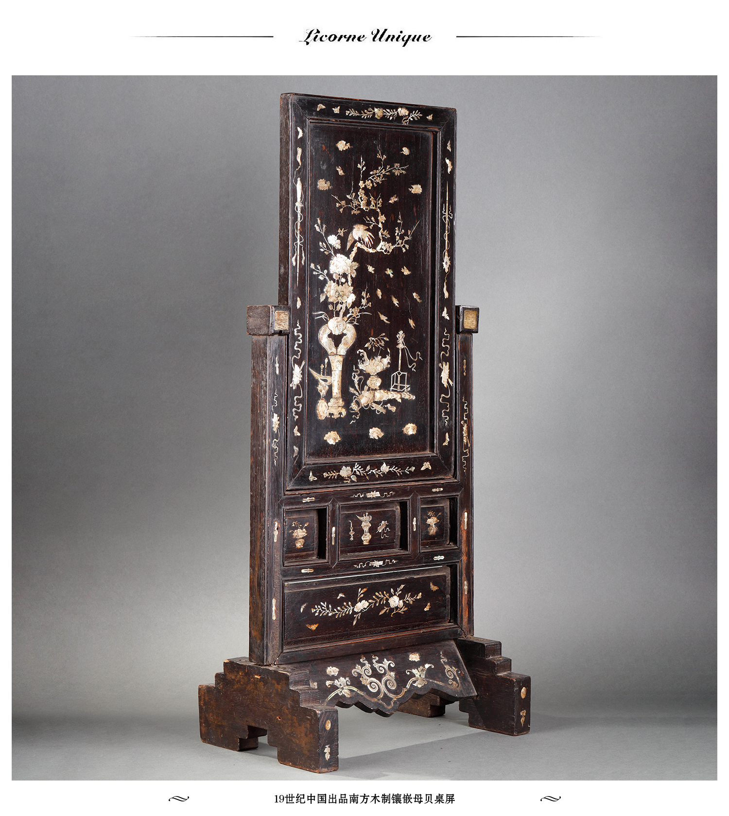 独角鹿西洋古董摆件19世纪中国出品南方木制镶嵌母贝桌屏插屏屏风
