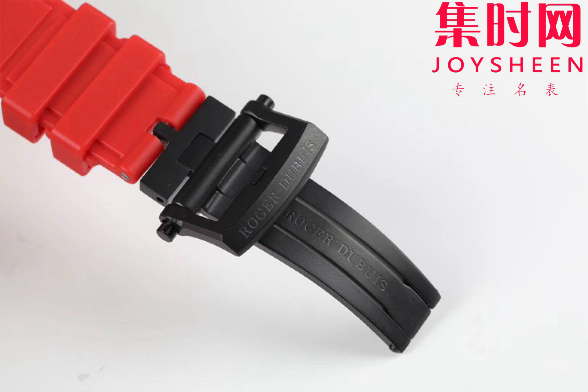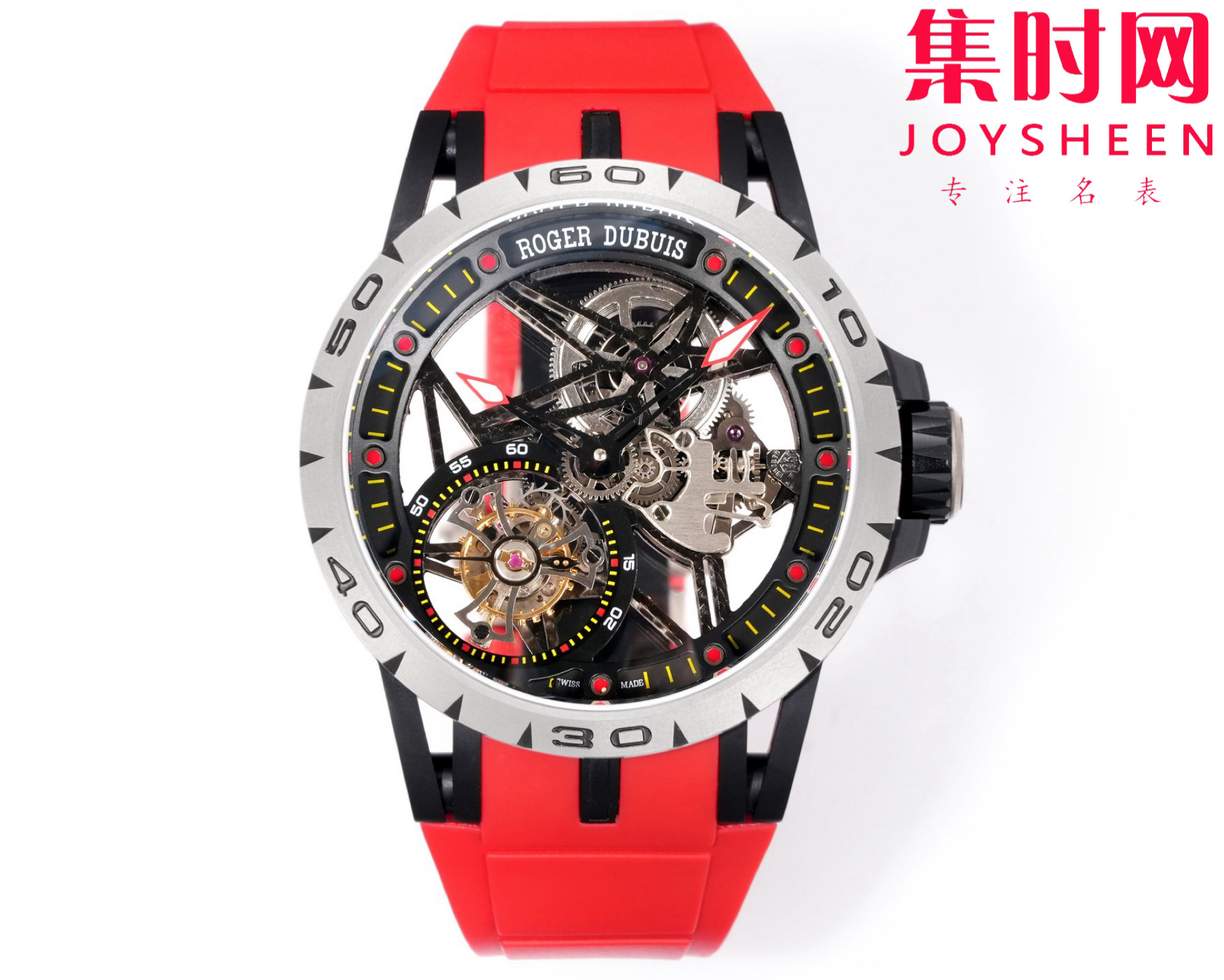 3.表盘:采用了镂空表盘,夜光刻度,黑色DLC涂层钛合金的秒盘印有黑色分钟圈和Roger Dubuis(罗杰杜彼)字样。指针覆有夜光涂层,读时简单明了。