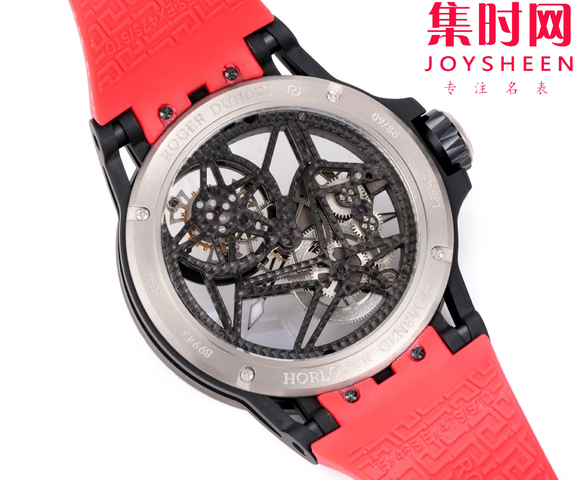 总结: 无论是正面还是背面,镂空机芯都展现出无比的通透,另腕表观赏性十足,走时稳定精准,是每一个爱表者不可缺少的一枚腕表,NEW罗杰杜彼钛金属间黑全镂空一体陀飞轮腕表、潇洒肆意、尽显绅士魅力!