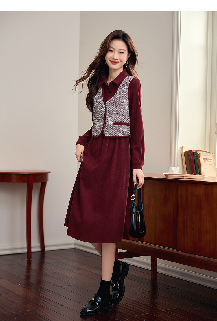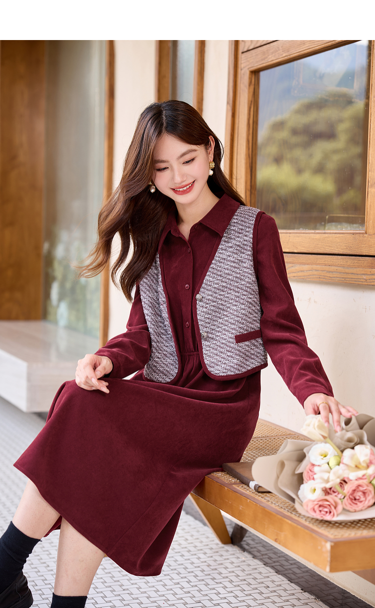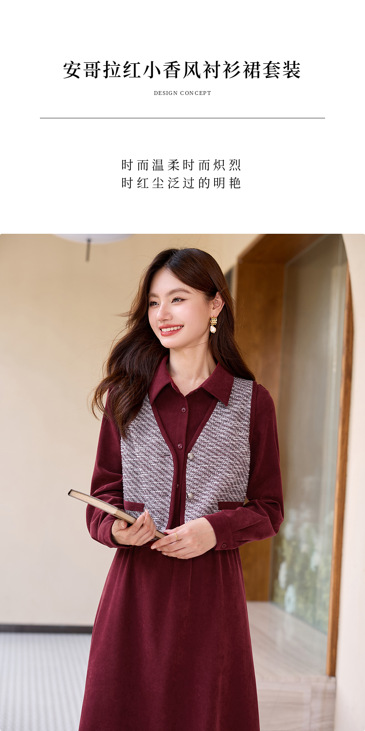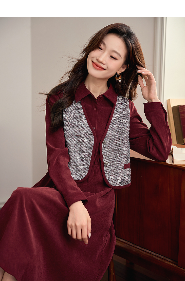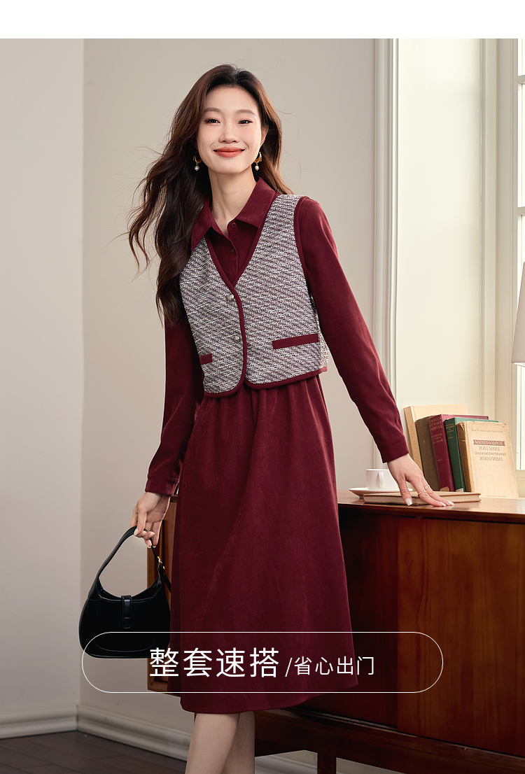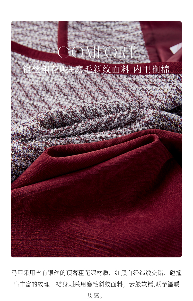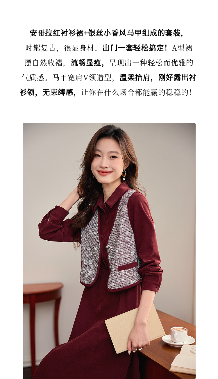 【专属特价】熙世界秋冬女装小香风银丝粗花呢马甲安哥拉红衬衫连衣裙两件套装