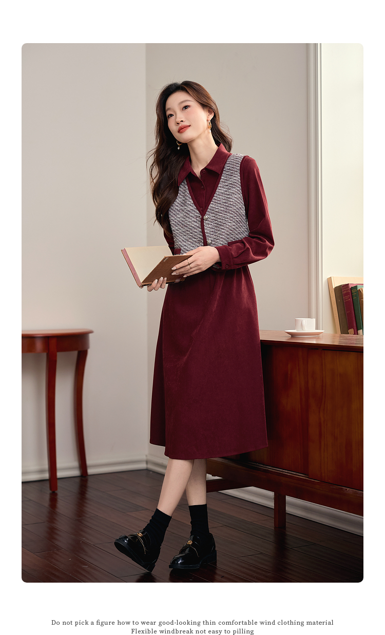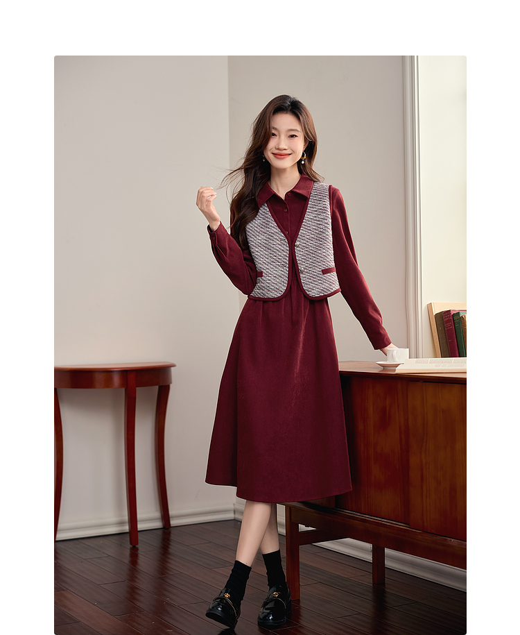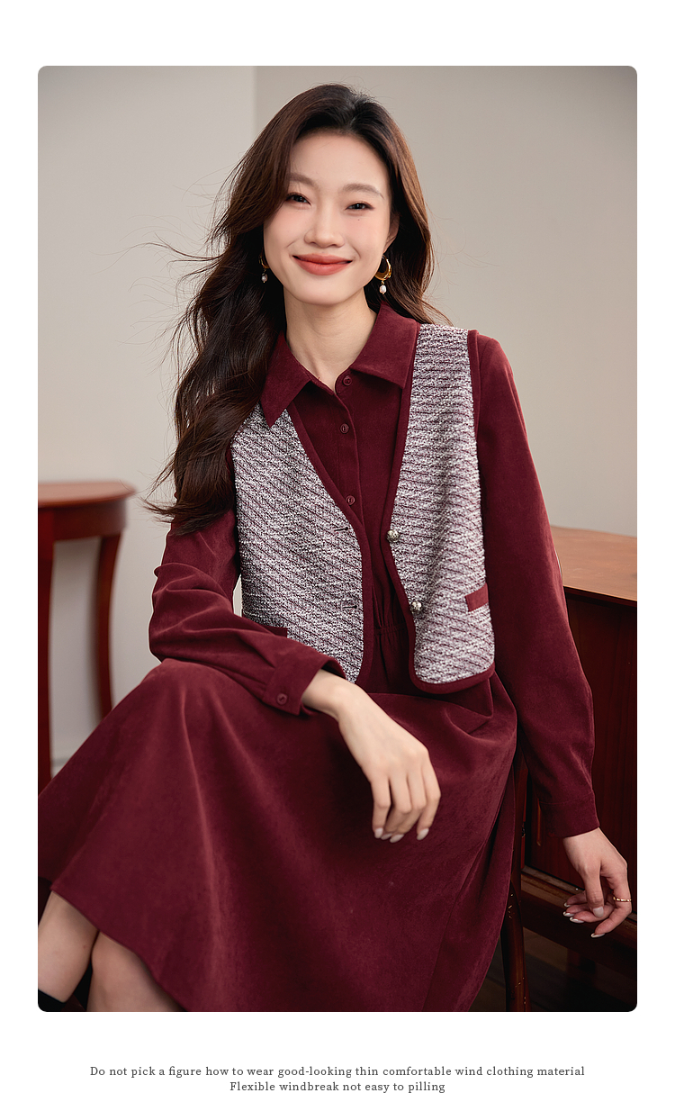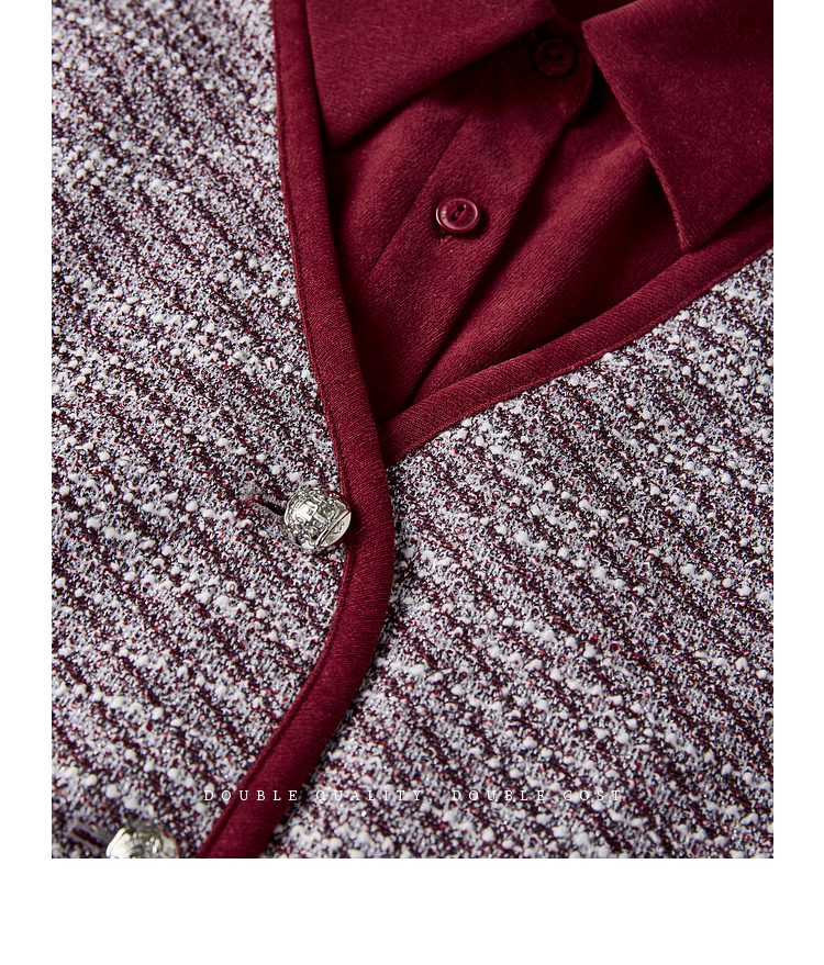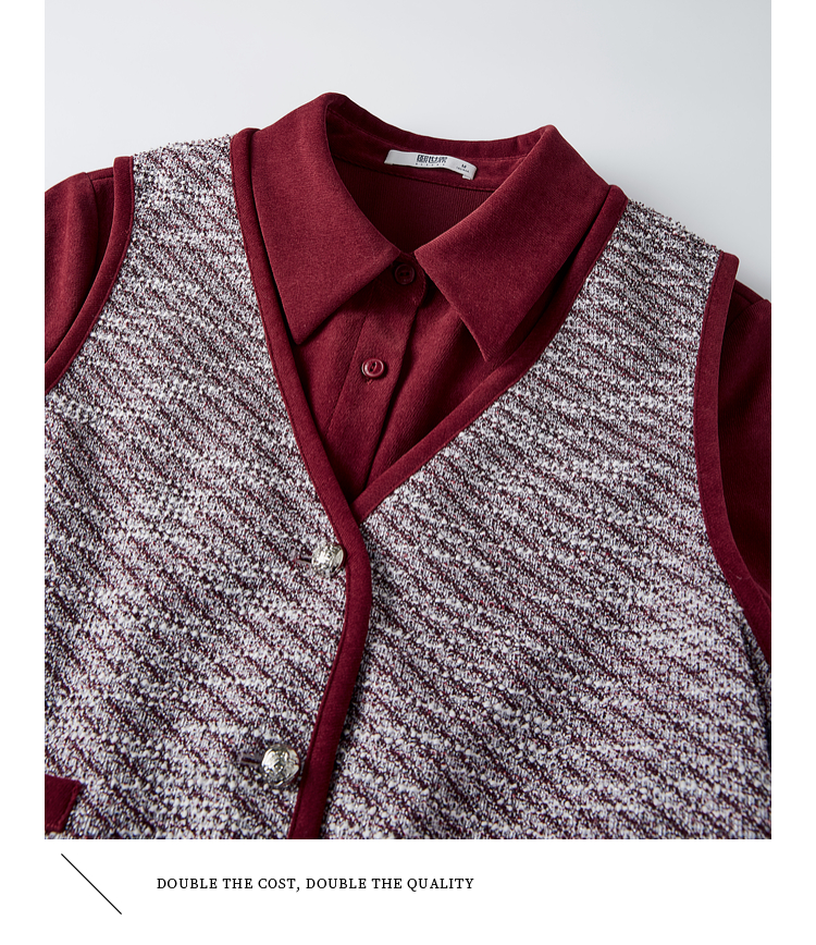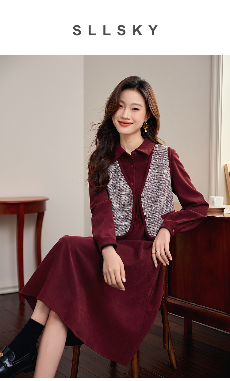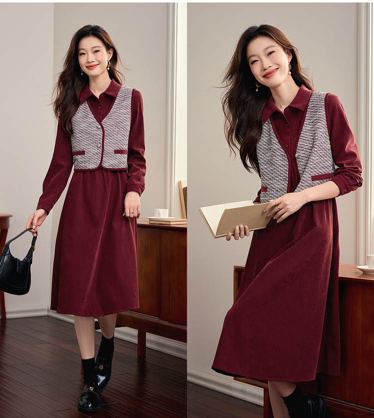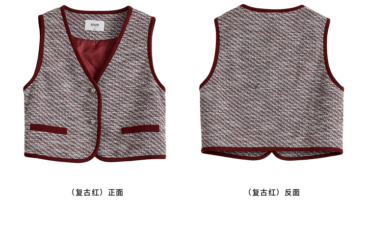 【专属特价】熙世界秋冬女装小香风银丝粗花呢马甲安哥拉红衬衫连衣裙两件套装