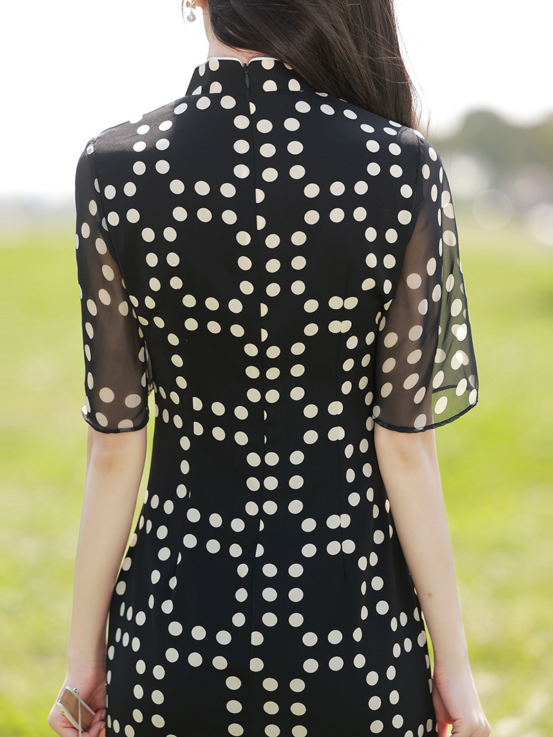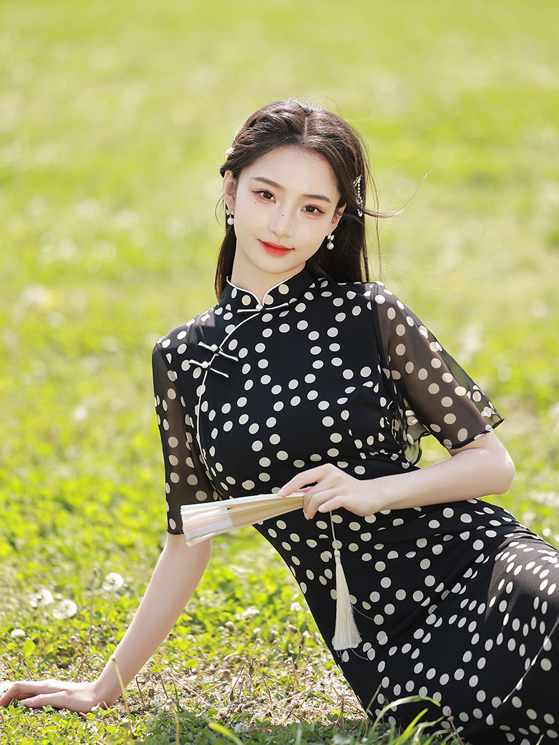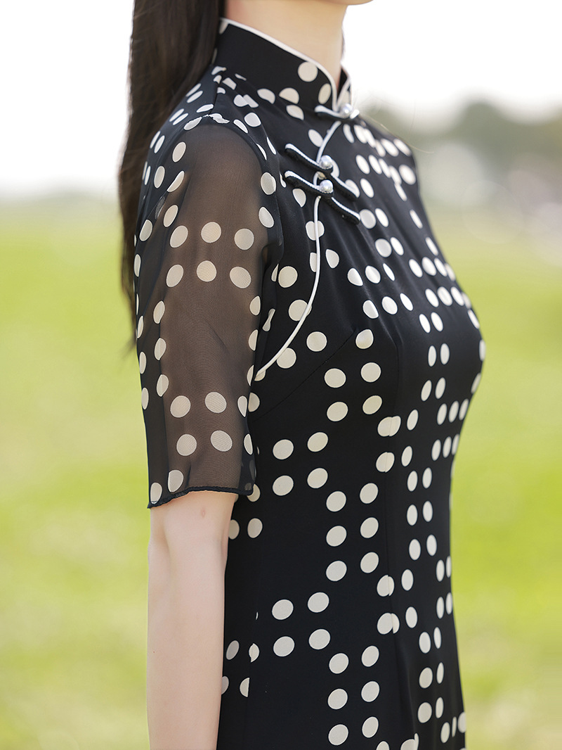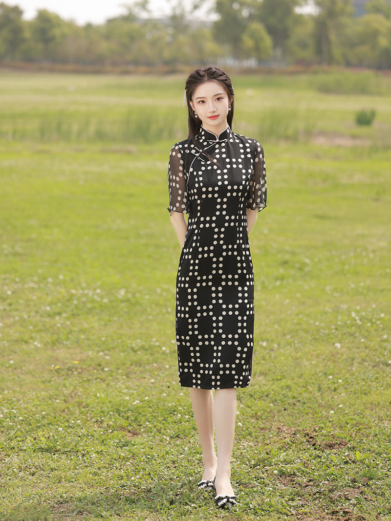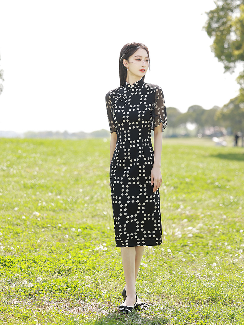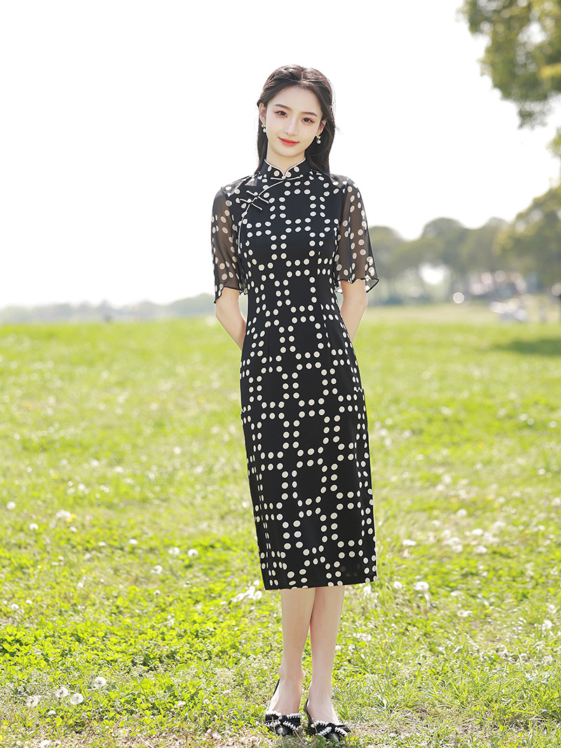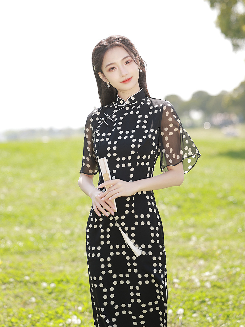 改良复古黑波点,倒大袖中长款旗袍XL-23158