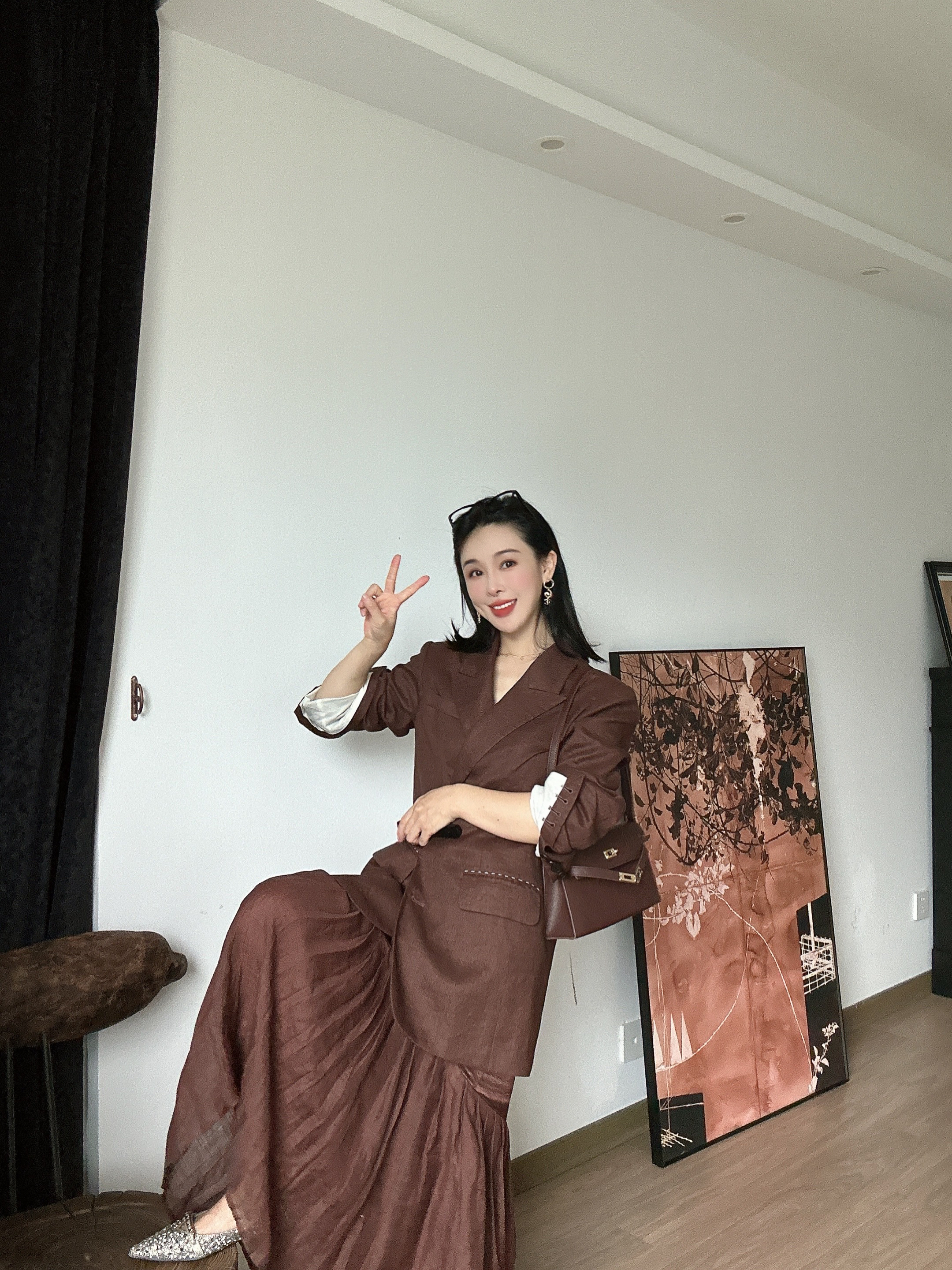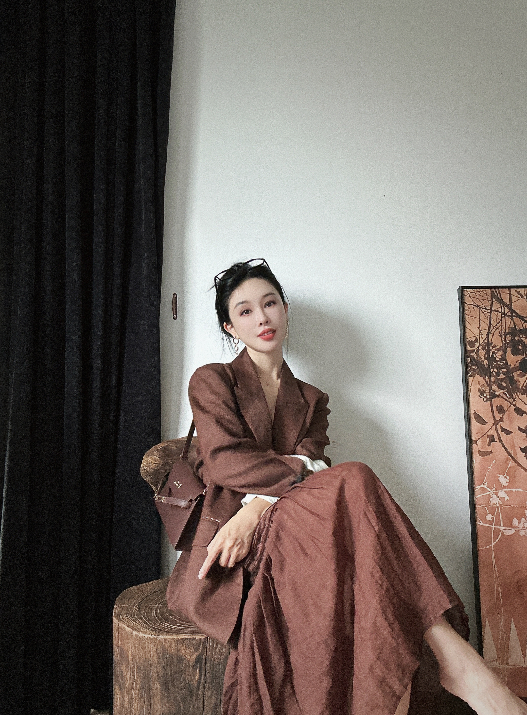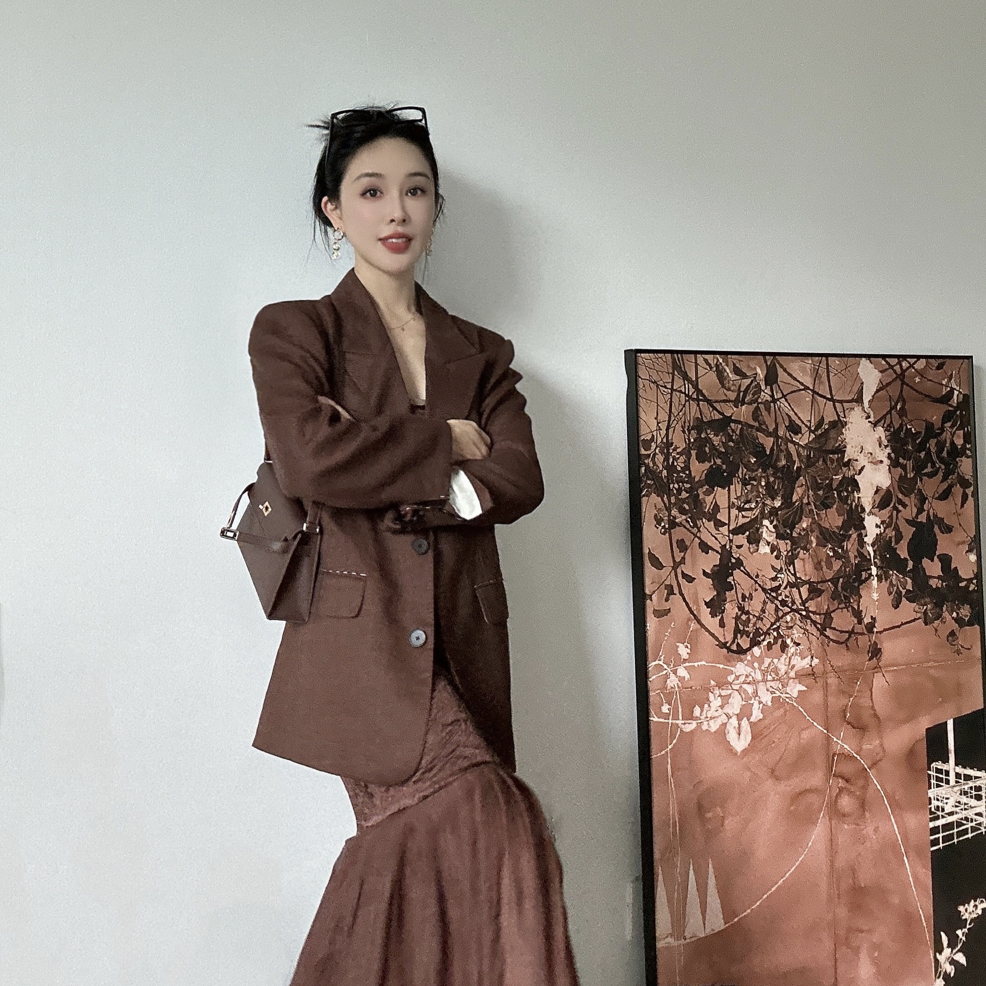 PIANAI冷小姐# 红咖色醋酸拼麻西服吊带连衣裙套装