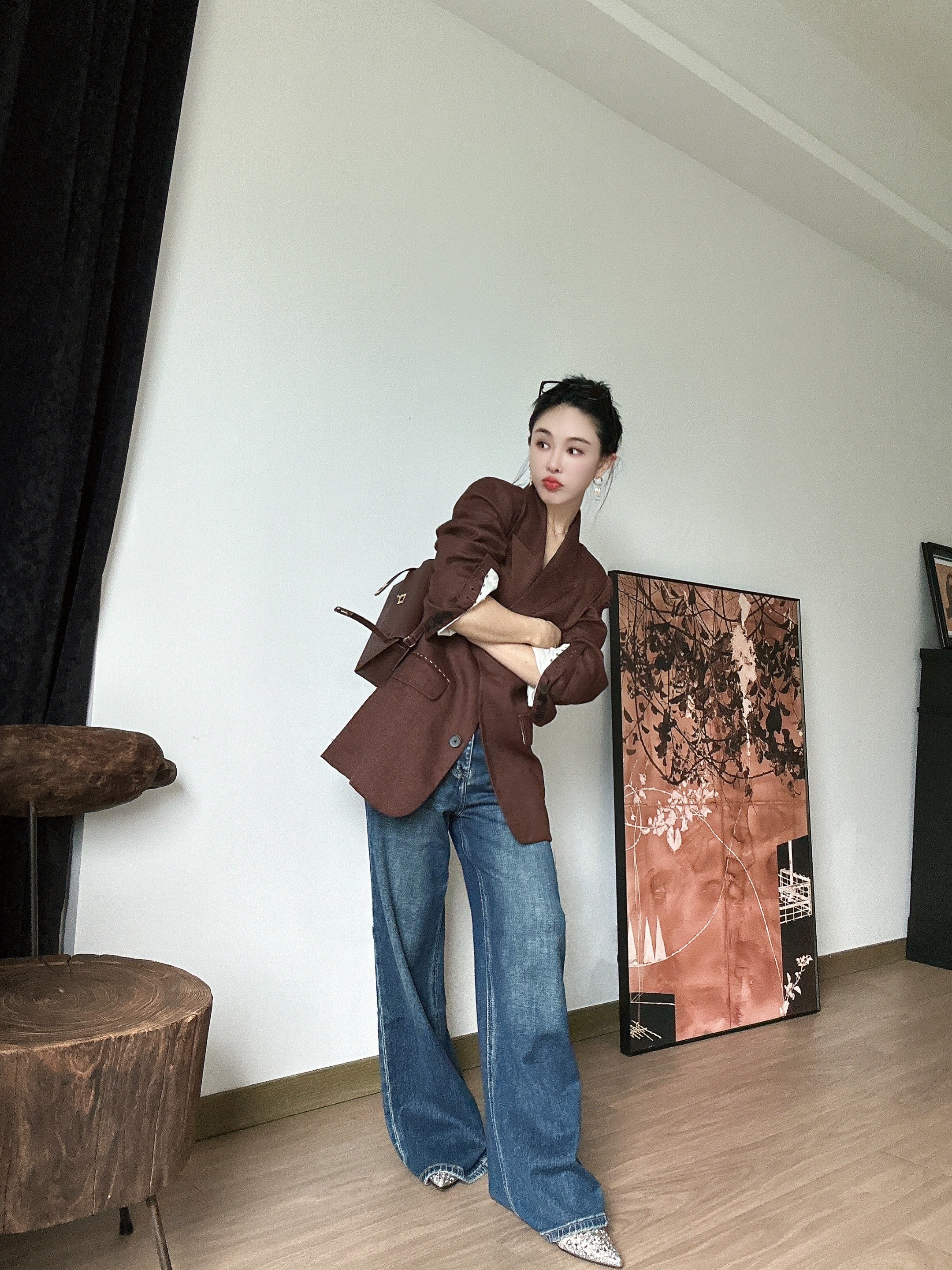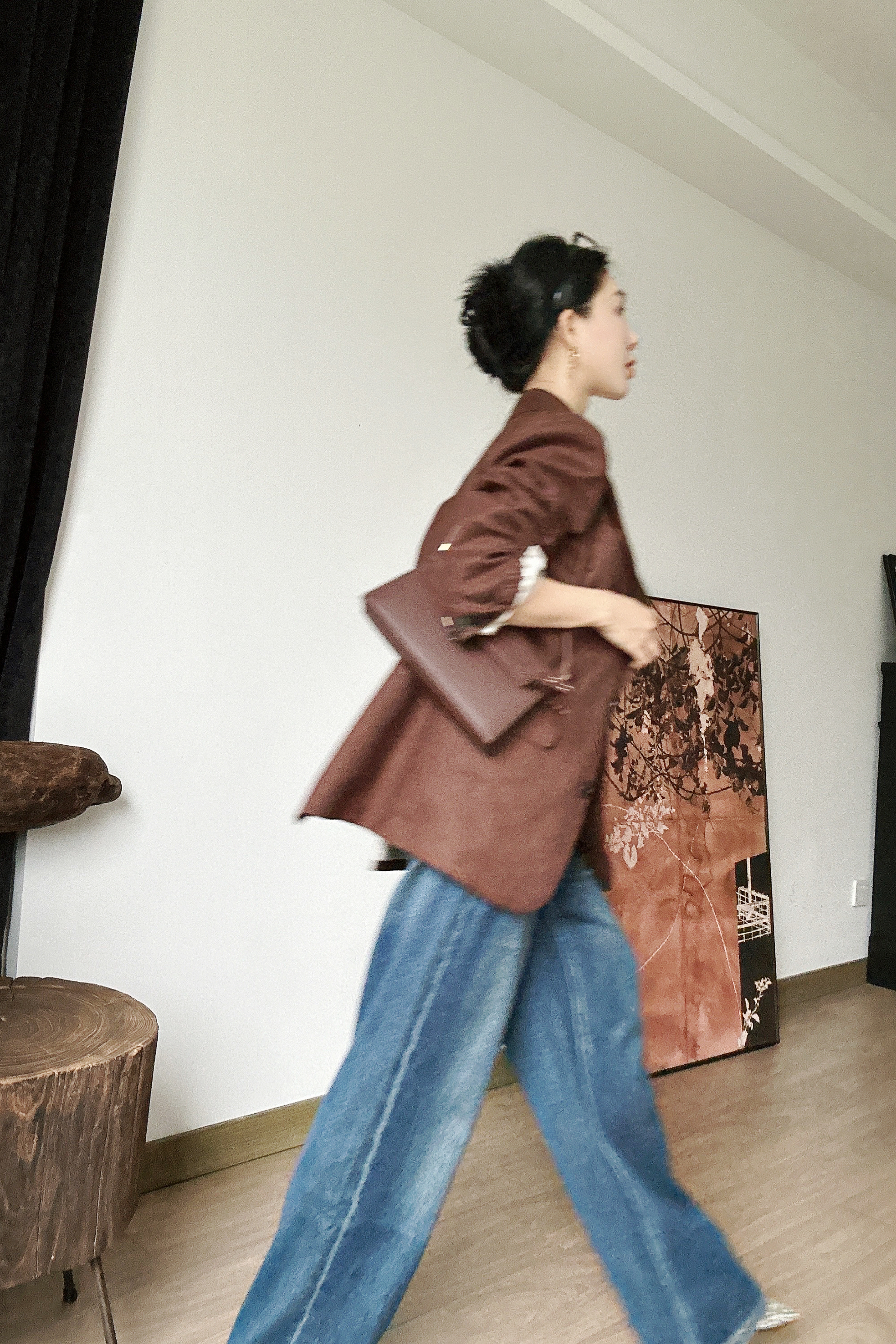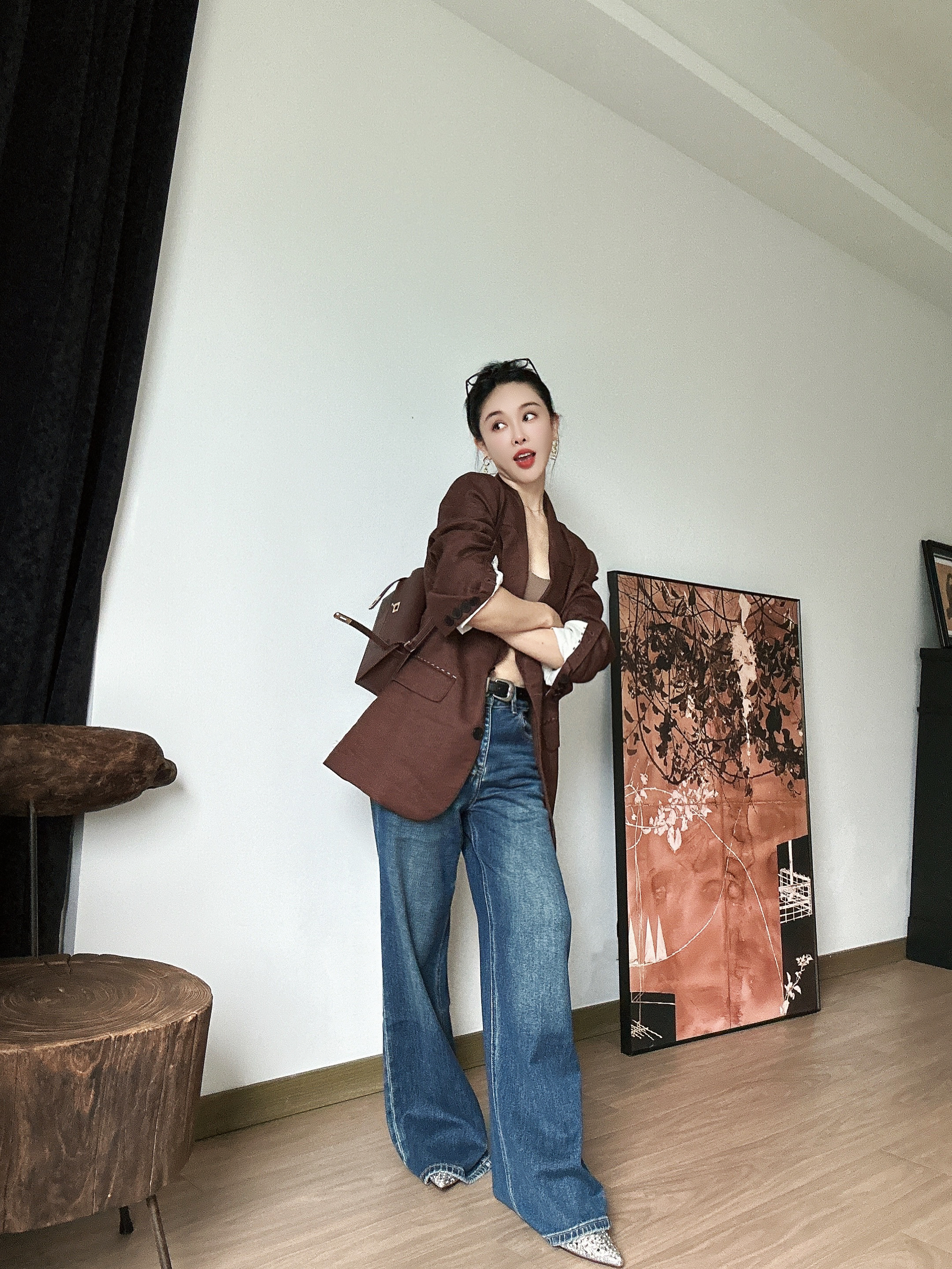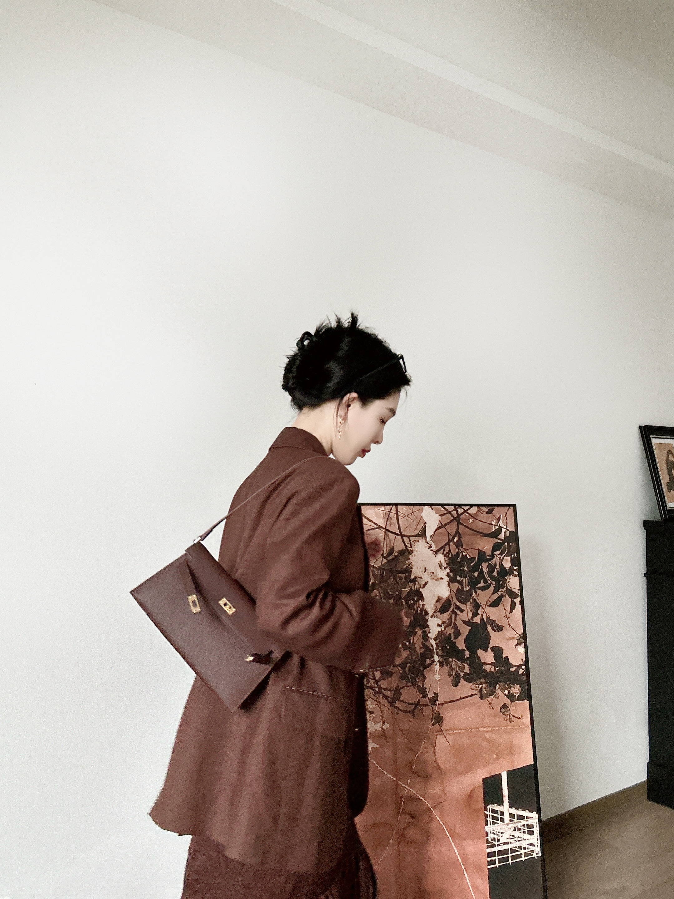 PIANAI冷小姐# 红咖色醋酸拼麻西服吊带连衣裙套装