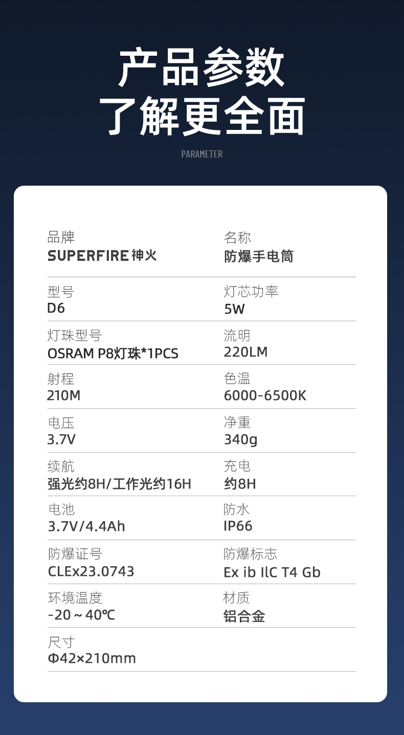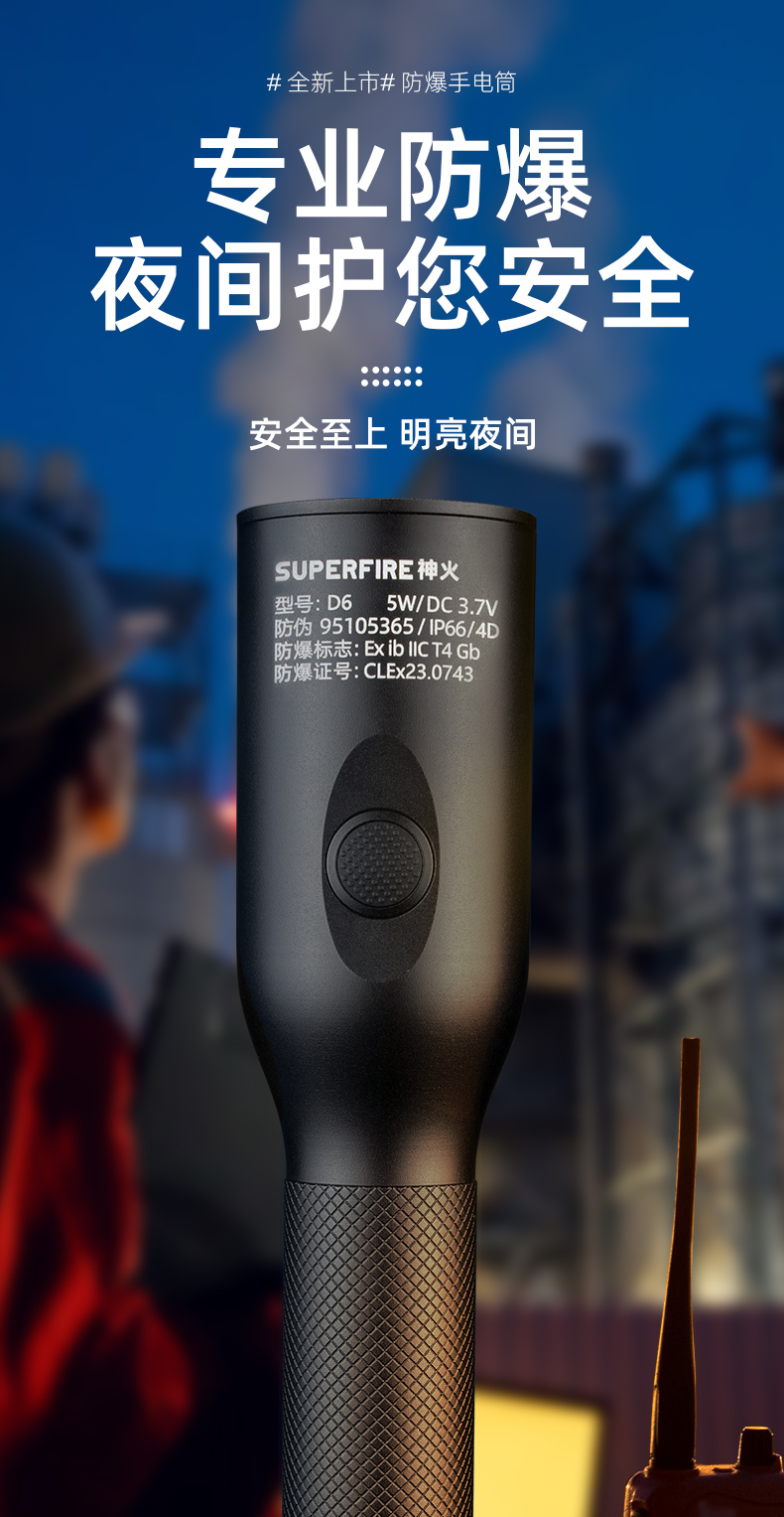 SUPERFIRE神火D6防爆手电筒强光保安巡逻充电远射超亮特大功率探照灯