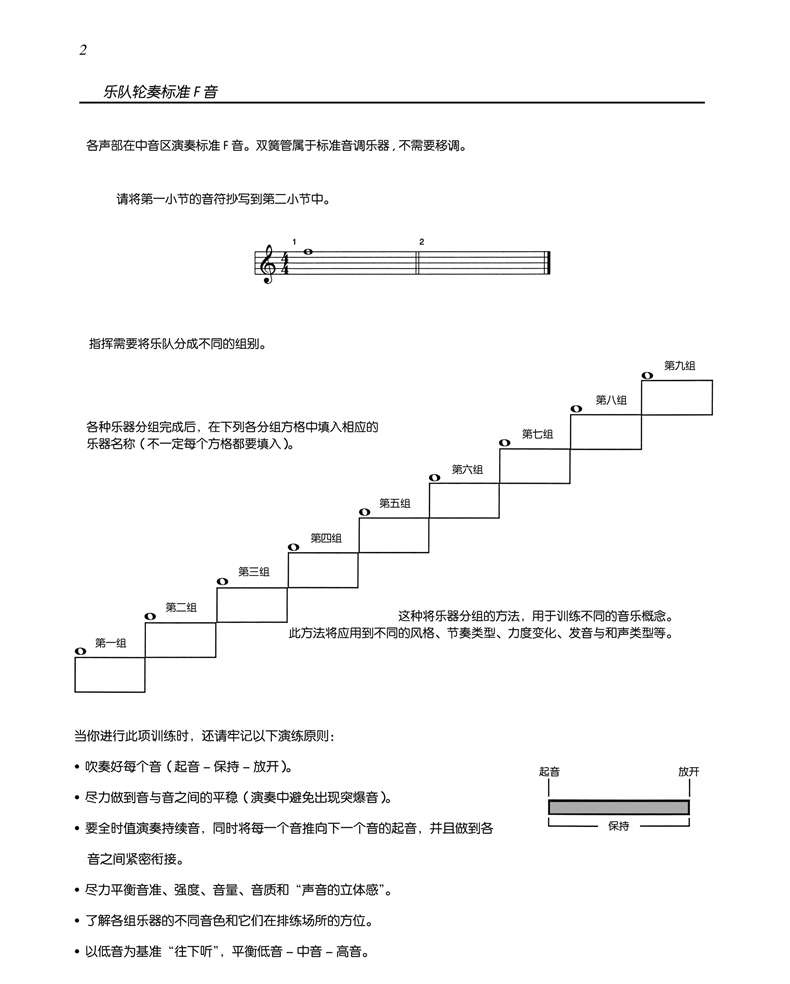《管乐队标准化热身训练教程》旨在更好地组织日常排练和改进整个乐队的全面演奏水平。无论每天的排练时间仅5分钟,或是每天45分钟,这套教程能为处于任何水平、任何条件和状态的乐队提供机动性良好的排练选择,同时也能为广大乐队指挥们提供能适应每个学生的不同演奏水平的训练素材,并能很好的激励每一个学生为了掌握更高水平的演奏技能而努力训练。《管乐队标准化热身训练教程》共17册,分为长笛、双簧管、大管、单簧管、低音单簧管、高音单簧管、中音萨克斯管、高音萨克斯管、次中音萨克斯管、小号、圆号、长号、次中音号(高音谱号)、次中音号(低音谱号)、大管、打击乐与总谱。