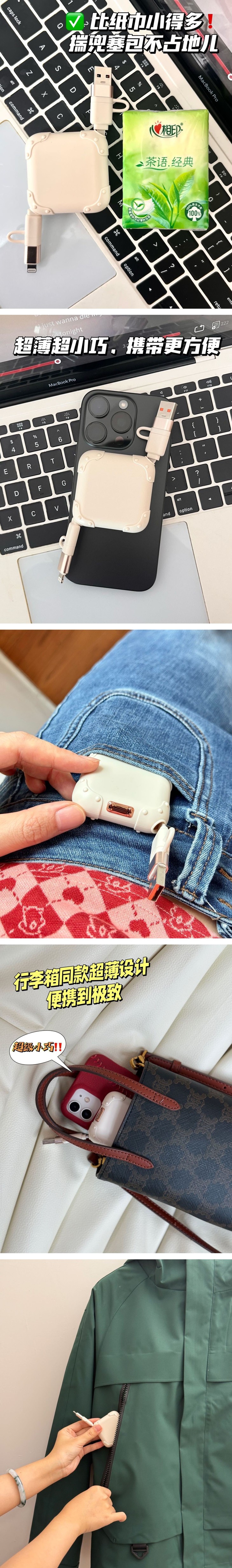✅第一次摸到幻响行李箱任意拉四合一数据线,直接被它的设计惊艳到❗️ 1米的线体收纳后居然比纸巾还小的多❗️❗️❗️抽拉式设计更是绝了,需要多长拉多长,完全不打结❗️ 揣在裤兜、塞进小包,几乎感觉不到它的存在 不管是办公室多设备办公、出差途中给笔记本救急,还是旅行/通勤路上随时补电🔋它都能轻松搞定❗️ 一根解决所有充电难题,主打一个全能又便携💕